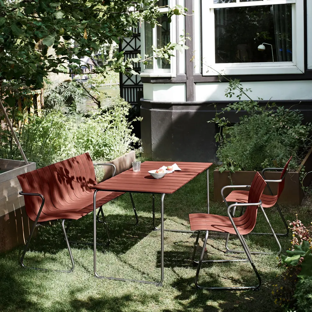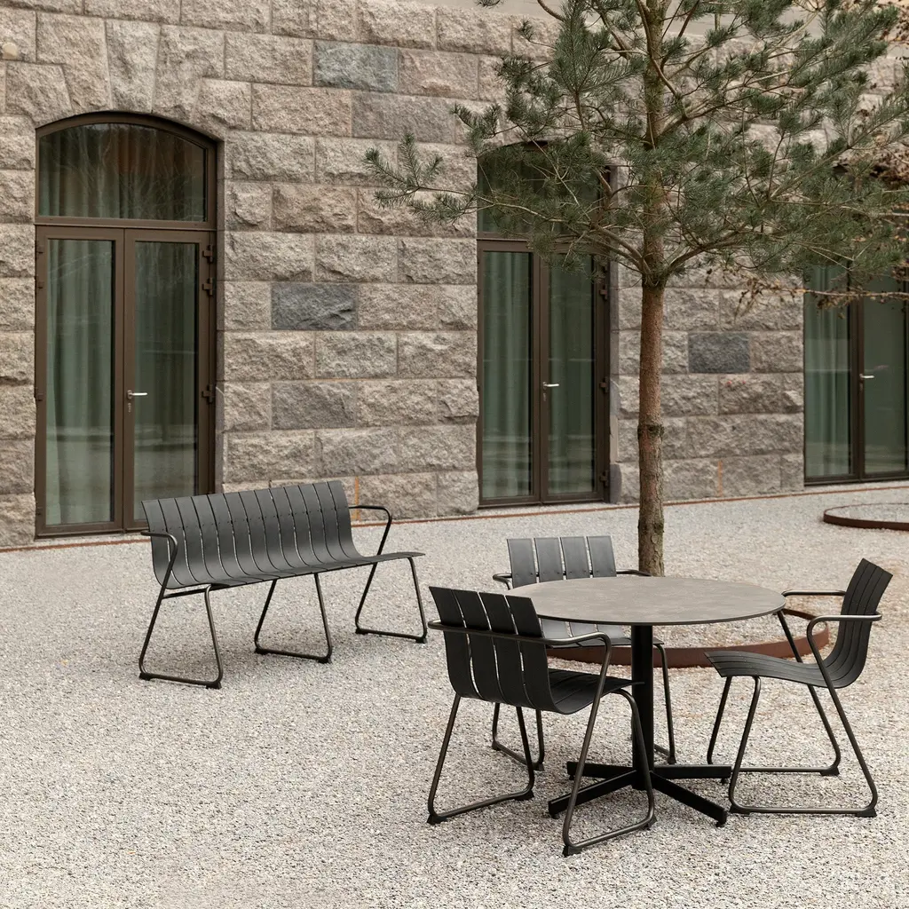An inviting expanse of comfortably curved slats characterizes Mater’s newly sustainable take on an outdoor classic. With Ocean Bench, Jørgen and Nanna Ditzel’s 1955 bench is reissued in plastic waste from the seas (both fishing nets and hard plastic) that equals more than 7 pounds of detritus. Durably conceived for both private and public use, the steel-tube frame with supportive armrests comes finished in gunmetal.