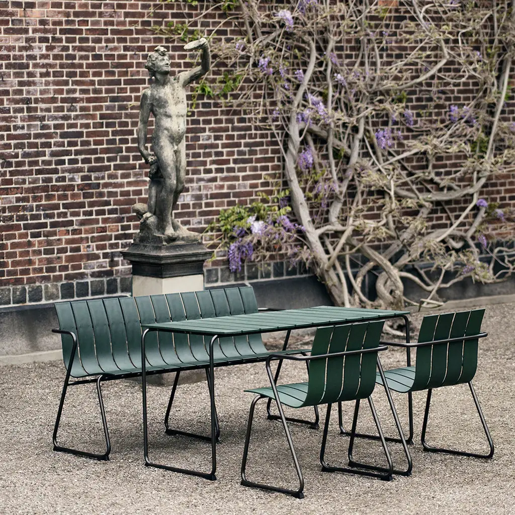 The Ocean Collection is a reimagined table-and-chair collection (originally designed in 1955) in ocean waste plastic, combining innovative solutions to prevent pollution of the world's oceans - with one of the 20th century's most renowned designers, Nanna Ditzel. The series is characterized by its light structure with repeated slats and metal frames, made and tested for outdoor use. The ocean waste plastic and recycled plastic (PP) honours the UN Sustainable Development Goals of protecting “Life Below Waterâ€� (SDGs 14) and “Responsible Consumption and Productionâ€� (SDGs 12) and “Partnership for the Goalsâ€� (SDGs 17). The Ocean Collection is designed for disassembly, meaning that the design allows each component in its purest form to recycle into new production circles.