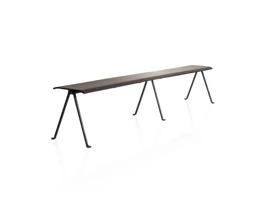 Material bench: frame in wrought iron, galvanized or painted in polyester powder. Seat and back in beech plywood or in plywood covered in fabric (Kvadrat “DivinaMD” e “Divina Melange”).Italian design and traditional craftsmanship are harmoniously combined in the Magis Officina collection, which explores a new creative language through the ancient fabrication process that is iron forging. Throughout history, this technique has been used to create an infinite number of everyday objects and decorative artefacts. The products in this collection feature a typical wrought iron finish that makes them living design objects, and their distinctly industrial feel is guaranteed to create interesting contrasts in any setting. Following the tables, chairs and stools, the collection expands further with a series of accessories, with a low chair, with a twoseater bench and a collection of upholstered pieces (armchair, ottoman, two and threeseater sofas). All these pieces feature a forged iron structure, with the allure of a raw material handed down through the centuries, alive, with those slight imperfections that make each item in this collection unique, with a profoundly refined and elegant spirit.
