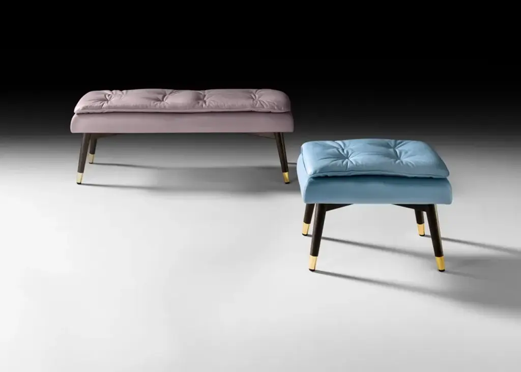 Olivia is a tufted bench in Evoque leather col. 604. Structure in solid beech wood. Padding in high resilience polyurethane foam. Non-removable cover. Legs in solid Ash, moka lacquered with metal glides in polished gold or dark bronze matt finishing. A refined classicality of designs enhanced by modern details. The Olivia bench encapsulates the will to experiment and the desire to remain anchored to sound, recognisable and tangible Italian-made manufacturing. An interior design item that can change the structure of a room, immediately adding an expressive and seductive feel. The round edges highlight the typical comfort of all Black Tie seating solutions.