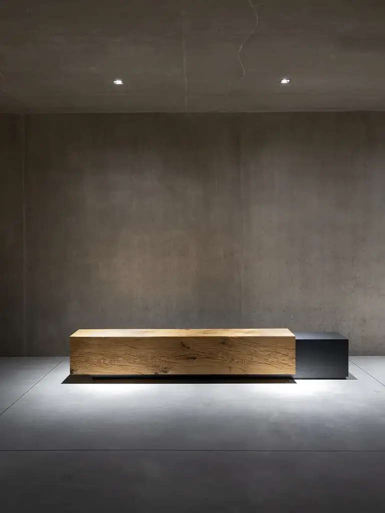 Ombra is a bench made of two parallelepipeds integrated with each other, like an object and its shadow. Union between a single block of solid scented cedarwood, squared section, and a part obtained with folded metal sheets, also available in concrete finish.STANDARD VERSION: IRON PART LACQUERED IRONDUST COLOUR (B2)AVAILABLE FINISHES:A7: cedarA9: cedar contract finish, vulcano cedarIRON ELEMENTS AVAILABLE FINISHES:C: concrete: beige, grey, medium grey, blackB2: lacquered iron: irondust, RAL (only selected colours)