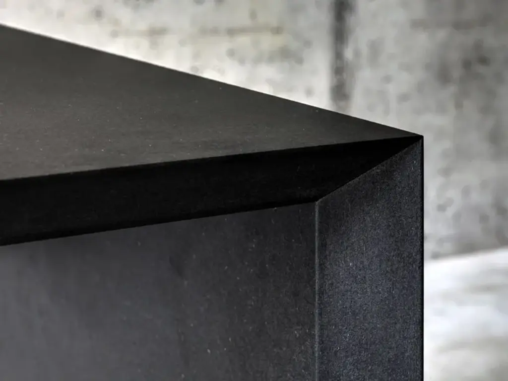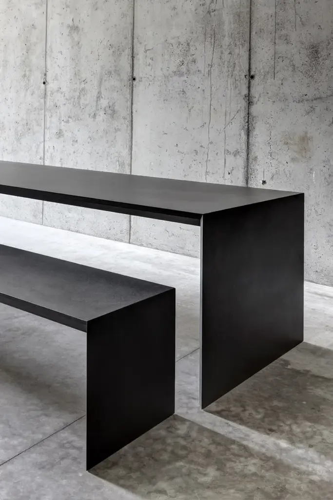 Ombrì is a bench made of Medium Density Fibreboard, black paste coloured, matt finished with special 45 ° joints to give lightness. Strongly geometrically shaped, this bench can be used as a self finished stand or paired with the table of the same Ombrì collection. Finishes: Paste coloured MDF – Matt black