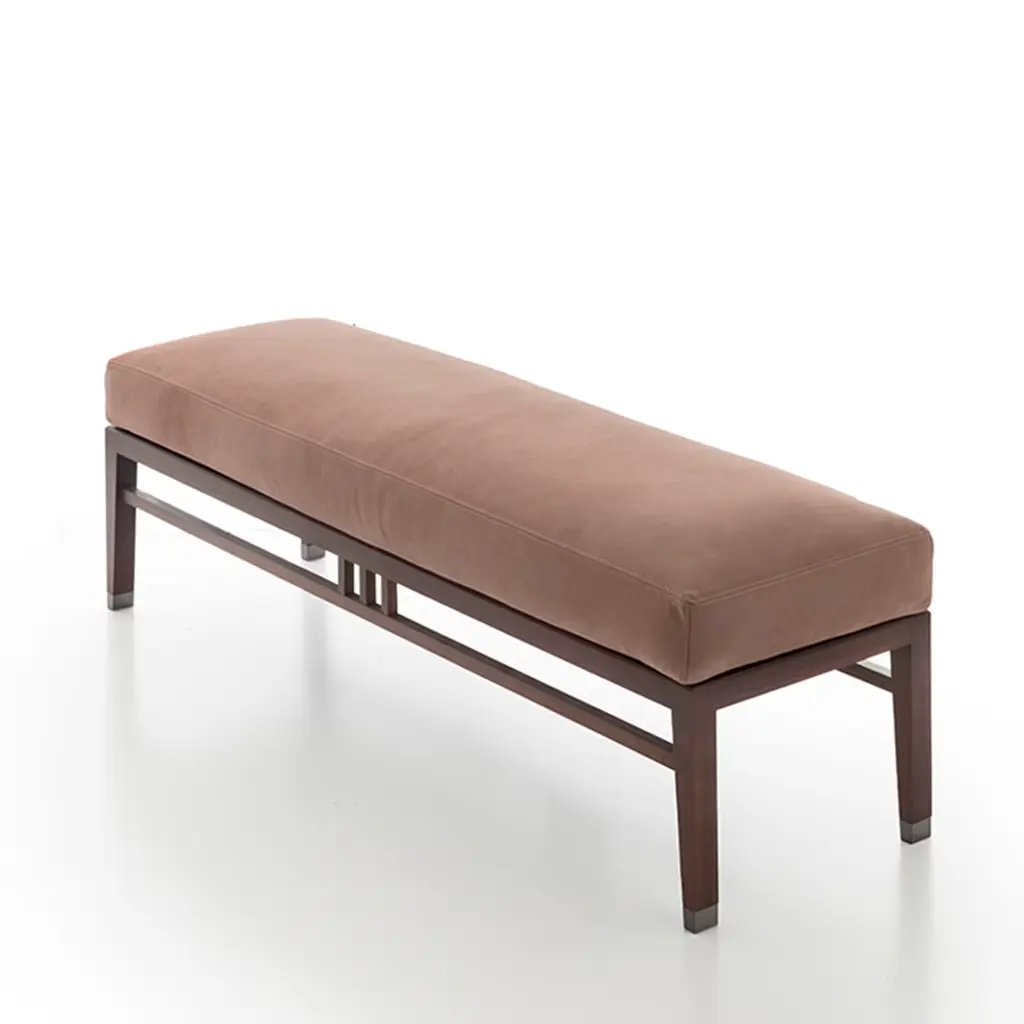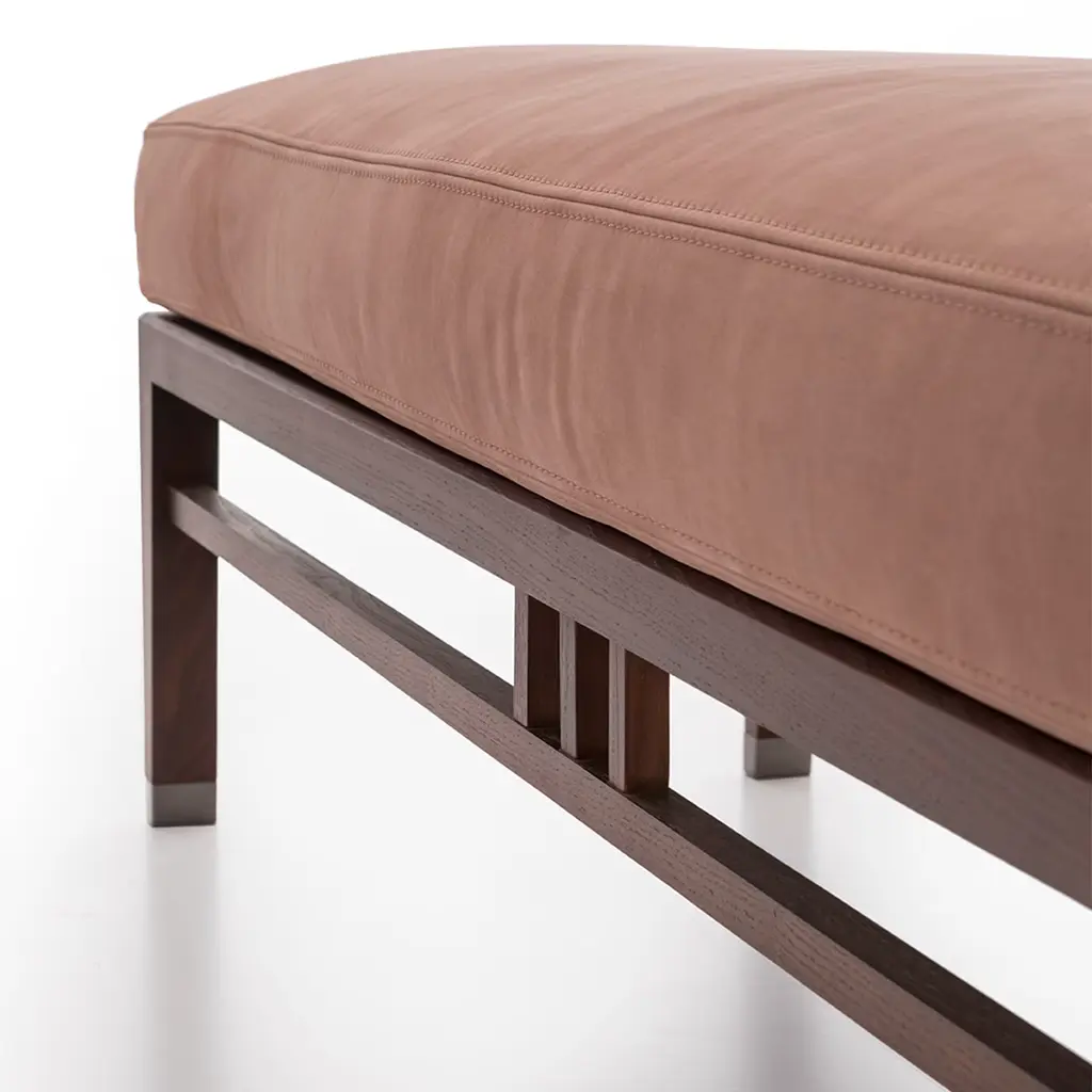 Clean lines trace the profiles of an airy solid heat-treated ash frame in this exclusive padded bench. Richly stuffed with polyurethane rubber for utmost comfort, the seat is sealed by antiqued pink nabuk leather, lending the design a delicate and romantic personality. Champagne-finished tips accent the tapered legs. Please consult the Concierge for available variants.