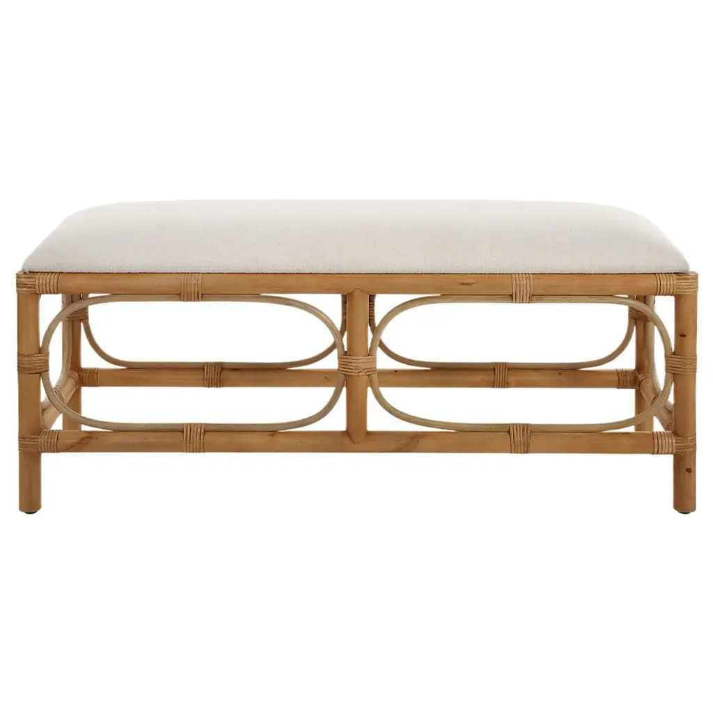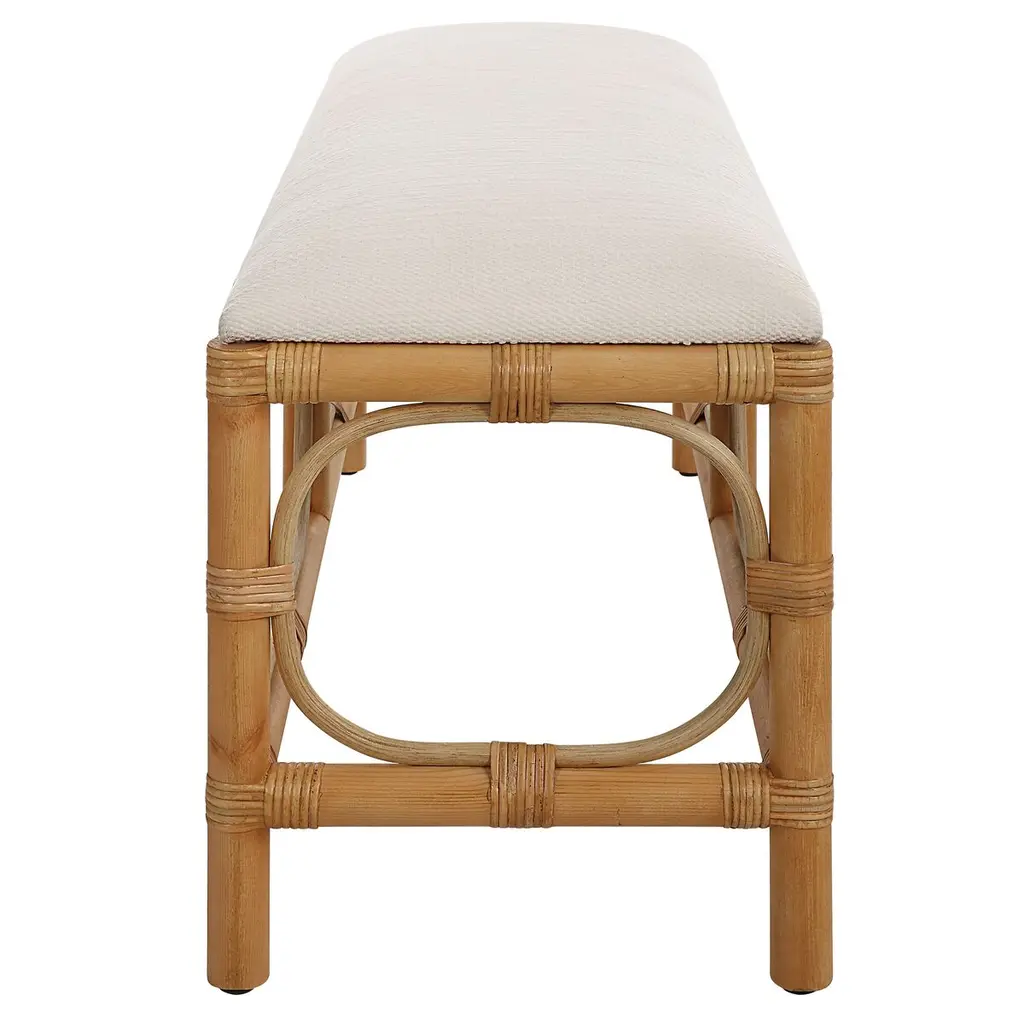 Immerse yourself in the serene embrace of coastal elegance with this exquisite bench. Its design whispers of gentle ocean breezes and sunlit shores, inviting you to relax and unwind. The textured fabric, reminiscent of soft sands, is gracefully supported by a solid wood base, exuding natural beauty and strength. Delicate rattan accents add a touch of artisanal charm, making this bench a versatile masterpiece. Whether placed at the foot of your bed or as a welcoming addition to your family room, it promises to be a cherished companion, offering both style and comfort in abundance.