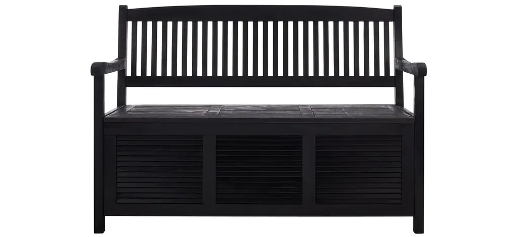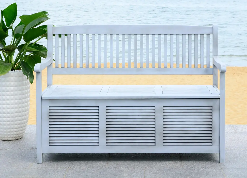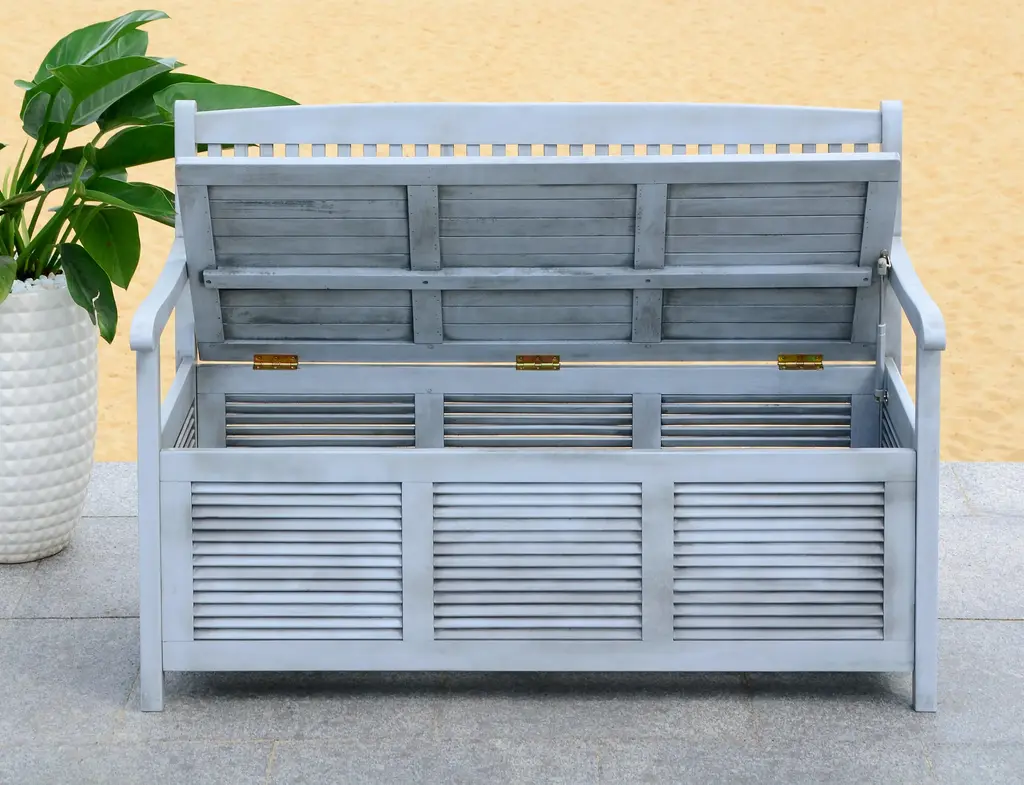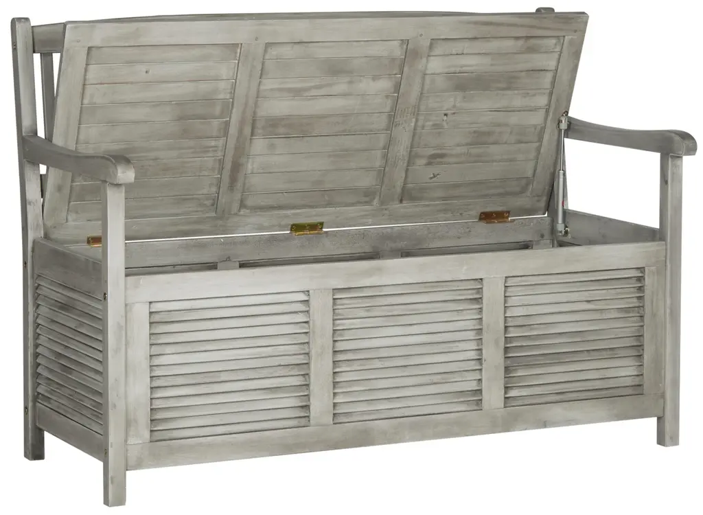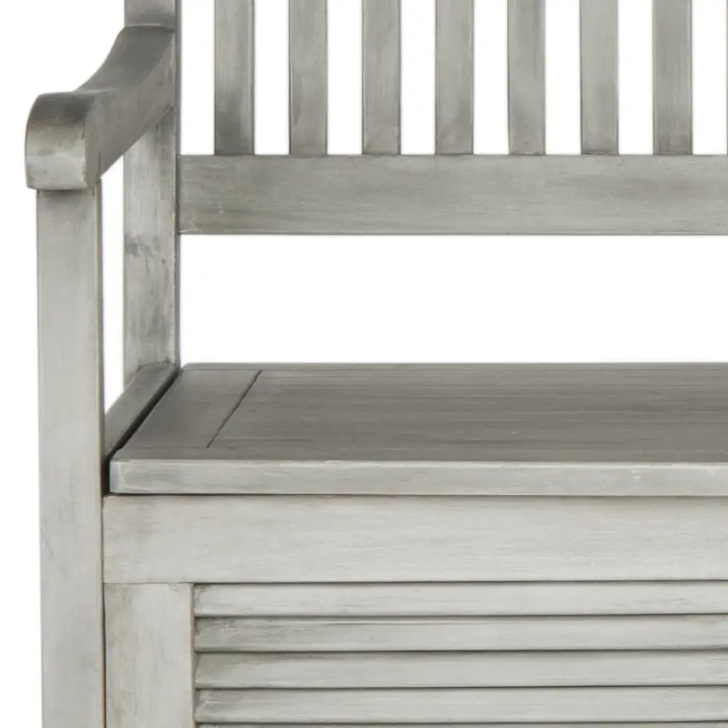 Inventive and beautiful, the outdoor storage bench solves the age-old dilemma of where to store pool gear or outdoor cushions, white providing seating for two. Crafted of easy care acacia wood in grey, this piece promises style and function. Store outdoor furniture indoors or cover well when not in use. Remove wooden furniture from standing water. Dust regularly with small brush or vacuum. Spills should be taken care of immediately before they harden or stain with a slightly dampened sponge. Do not use bleach solutions. Some assembly required.