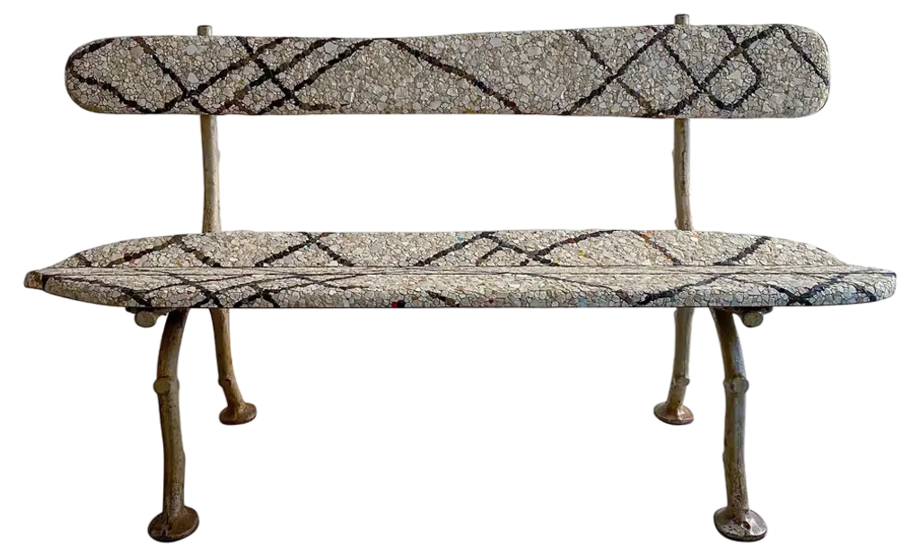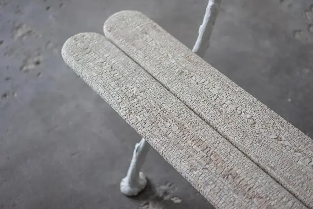 Panchina bianca antique bench by yukiko nagai. Dimensions: d55 x w157 x h90 cm. Material: iron , marble, natural stone, cement, stucco weight: 80 kg. A vintage white bench, made out of iron and wood, has been used as the subject for a new mosaic bench. The wood grain is recreated exclusively through marble and stone. The mosaic follows the dynamic of the wood texture, while the white painted aged wood is accurately recreated by the diverse tones of marble and stone, giving the impression of a never deteriorating wood. *all pieces are handmade, so the colours and shapes of the patterns may vary.