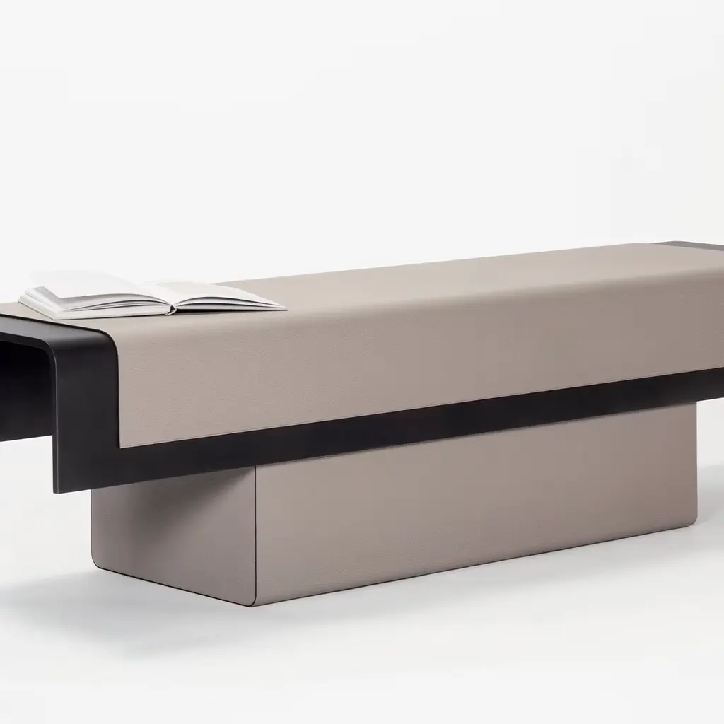 Featuring a daring balance of contrasting materials and shapes, the Pangea Bench by Stéphane Parmentier is a will provide extra seating in a simple yet elegant design. Gracefully enclosing the beige suede rectangular base, the concave top of bronze-finished wood is partially covered in the same leather to enhance the architectural aesthetic of the silhouette. Leather inserts are only available in suede, nappa, and printed calfskin.