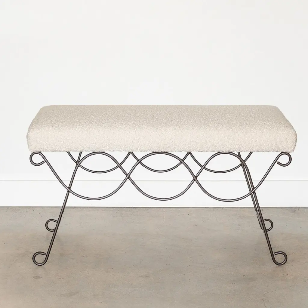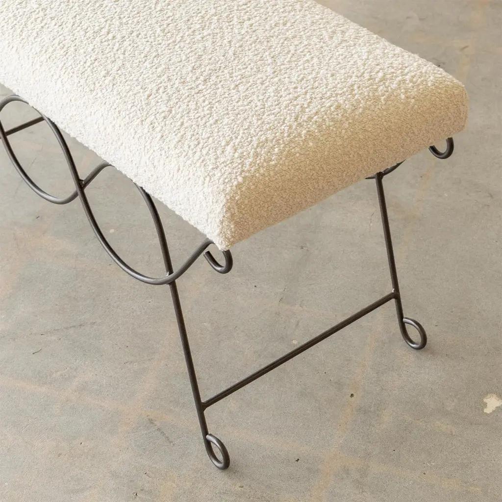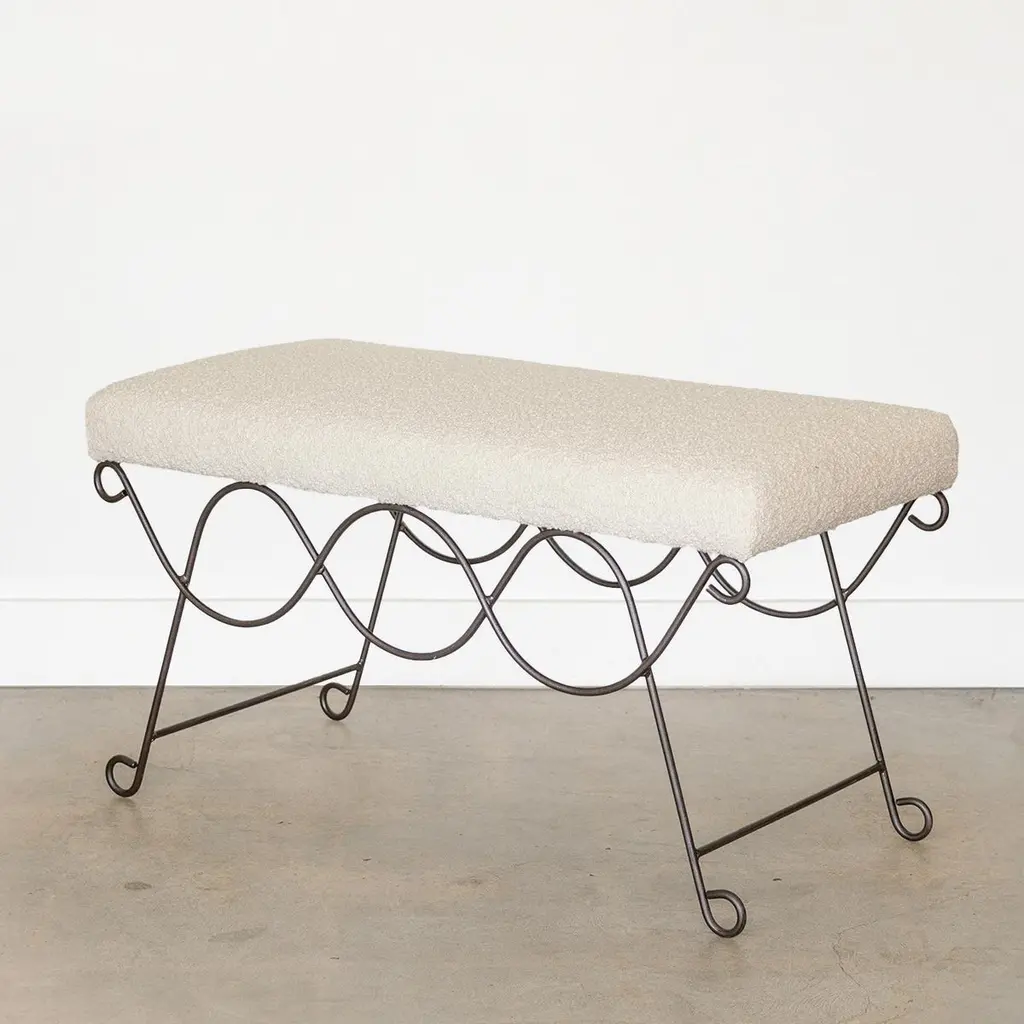 Beautiful iron bench with curved and looped base painted in a matte black finish. Rectangular cushioned seat upholstered in a boucle fabric or can be COM. Multiple available, sold individually.