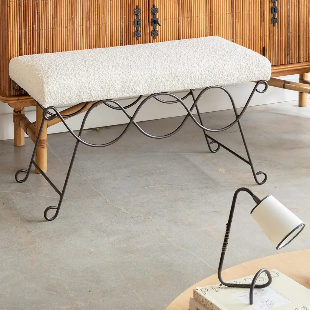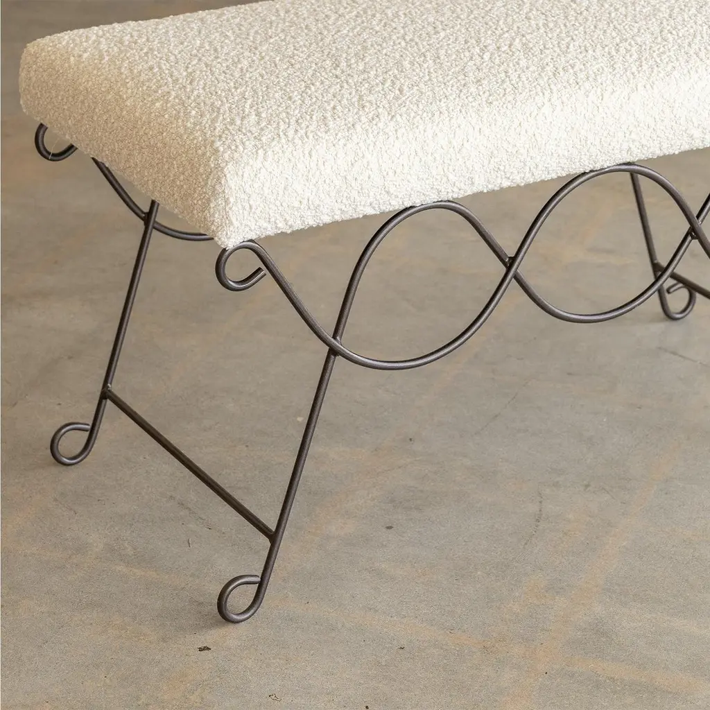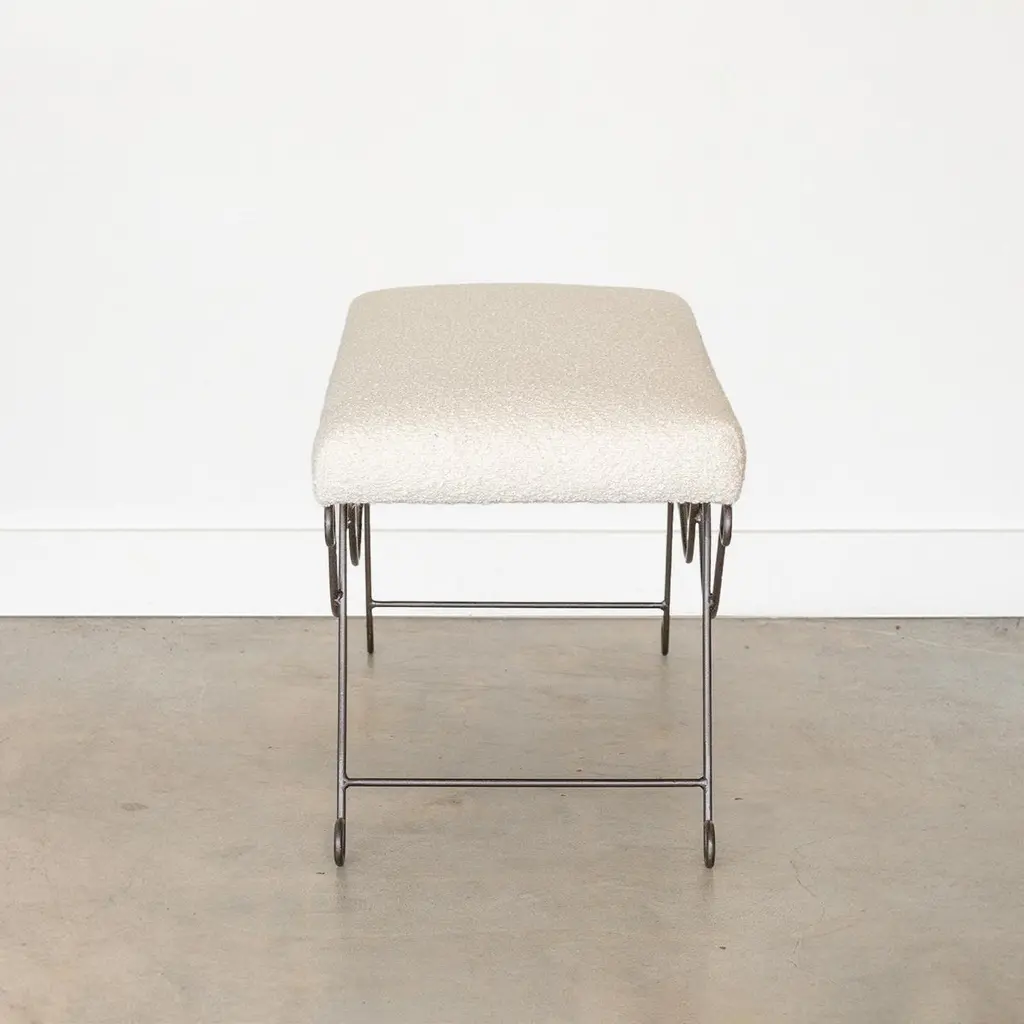 Beautiful iron bench with curved and looped base painted in a matte black finish. Rectangular cushioned seat upholstered in a boucle fabric or can be COM. Multiple available, sold individually.