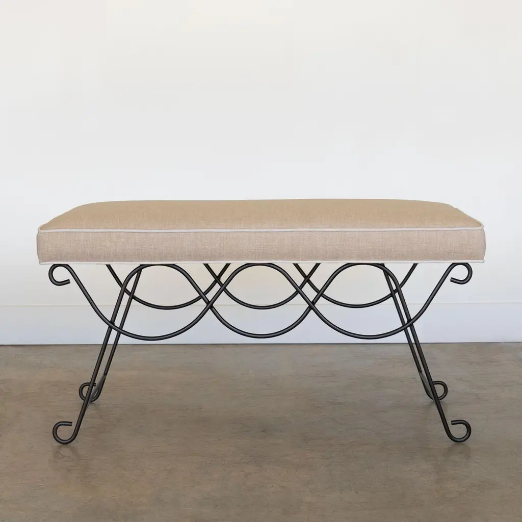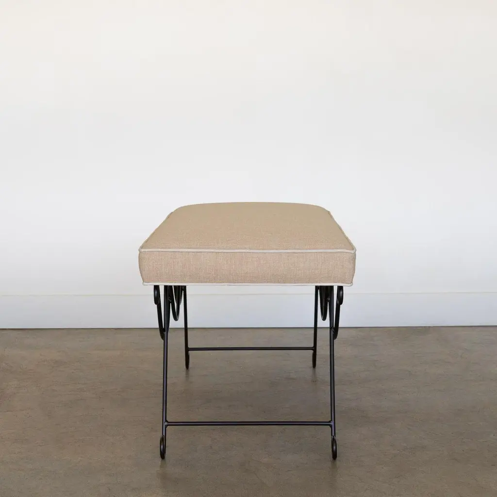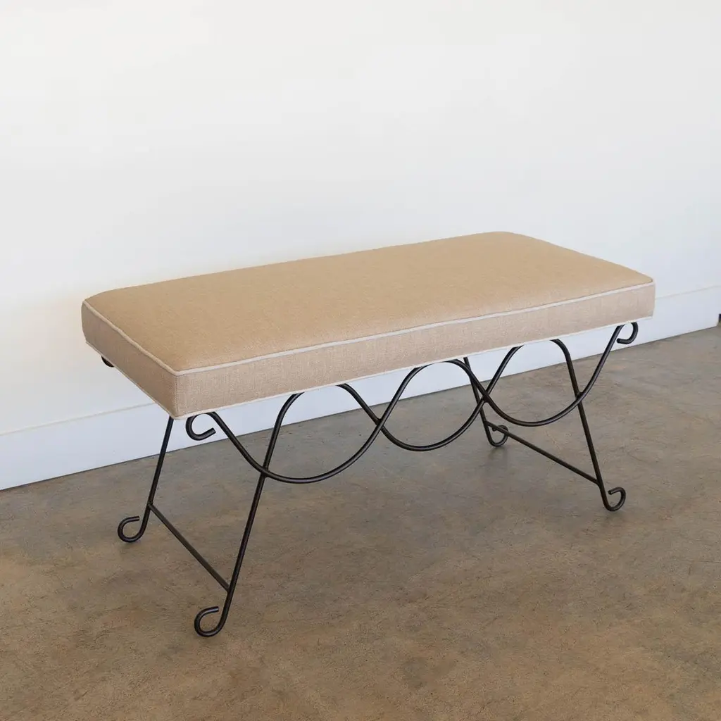 Beautiful iron bench with curved and looped base painted in a matte black finish inspired by French design. Rectangular cushioned seat upholstered in a tan cotton linen blend fabric with cream trim. Can also be COM. Multiple available, sold individually. Made in Los Angeles.