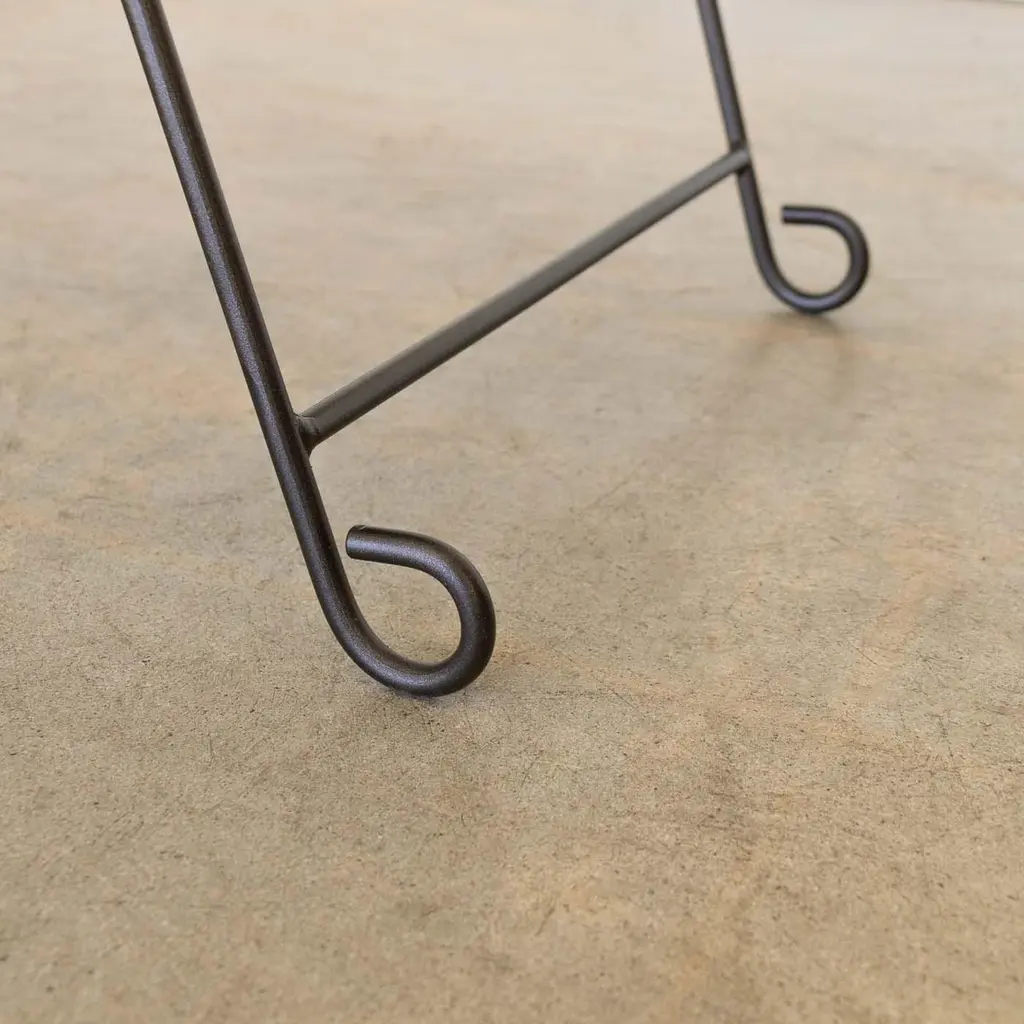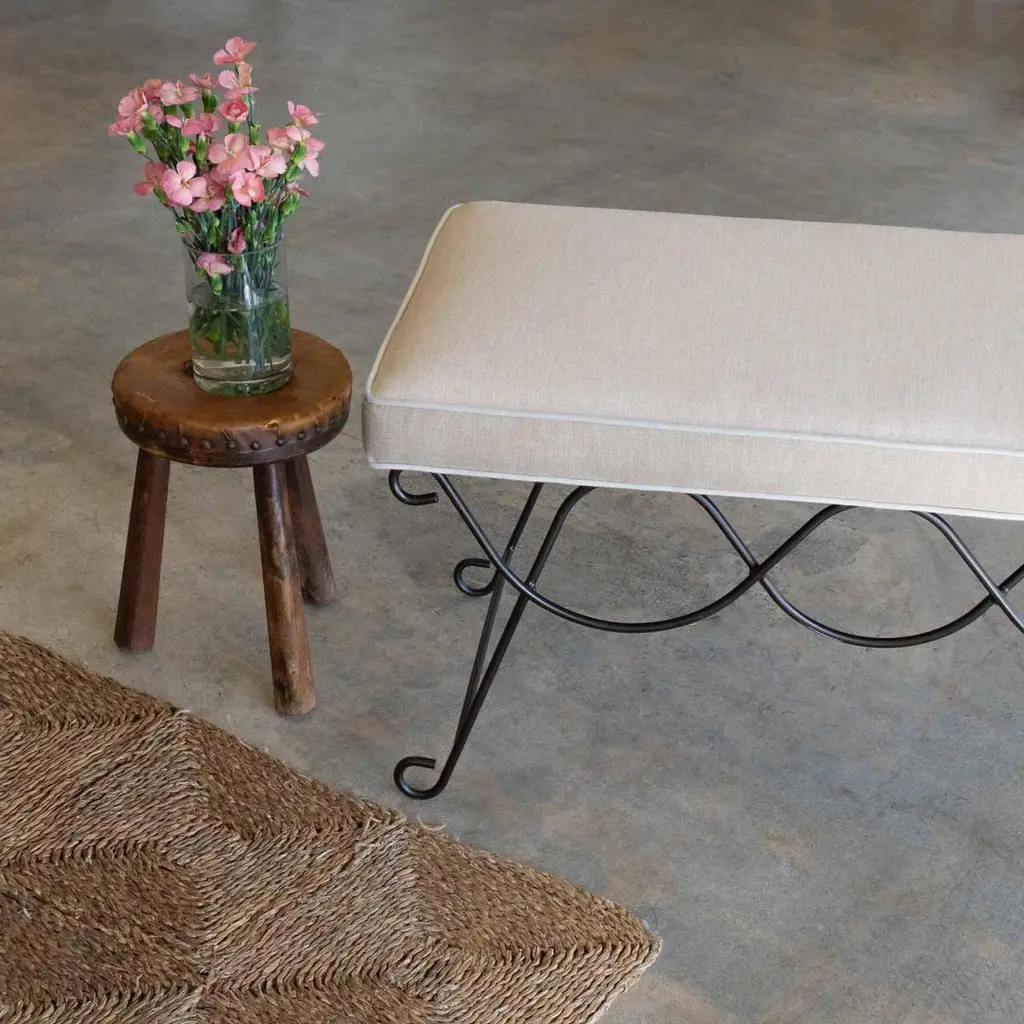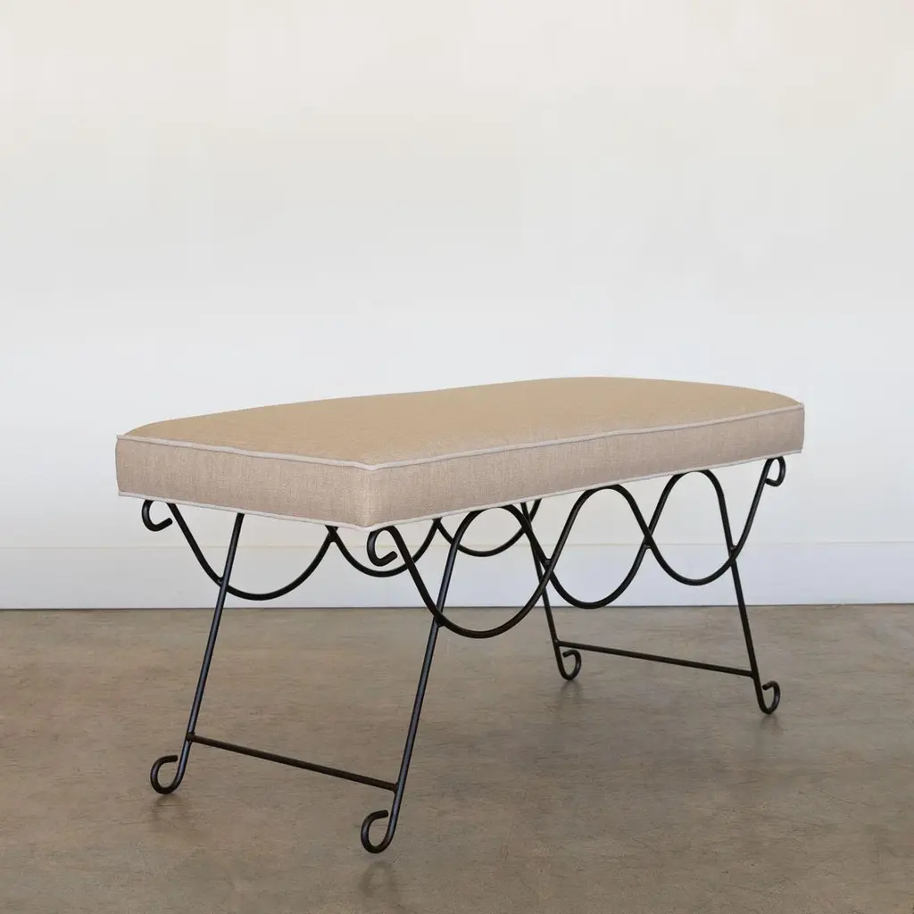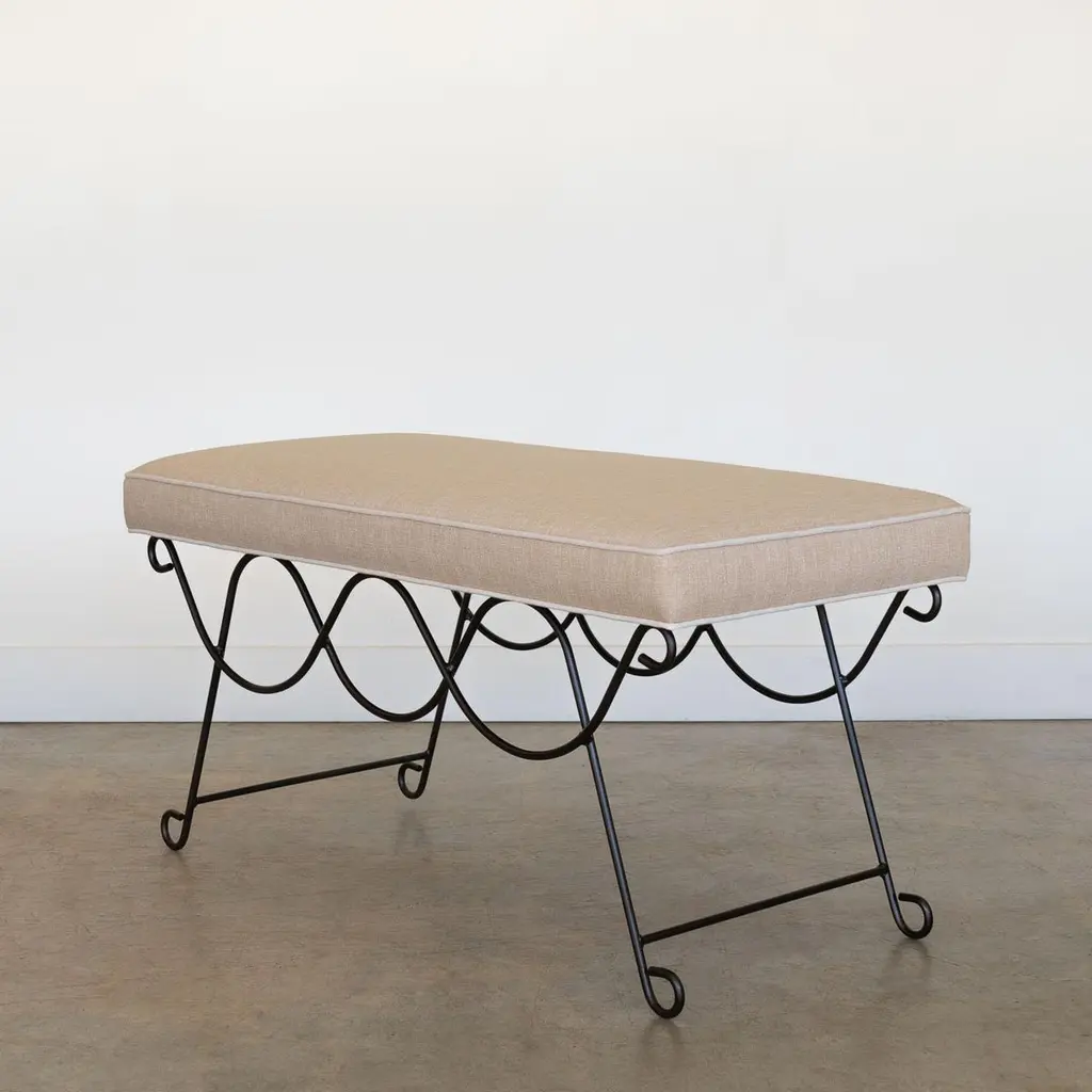 Beautiful iron bench with curved and looped base painted in a matte black finish inspired by French design. Rectangular cushioned seat upholstered in a tan cotton linen blend fabric with cream trim. Can also be COM. Multiple available, sold individually. Made in Los Angeles.