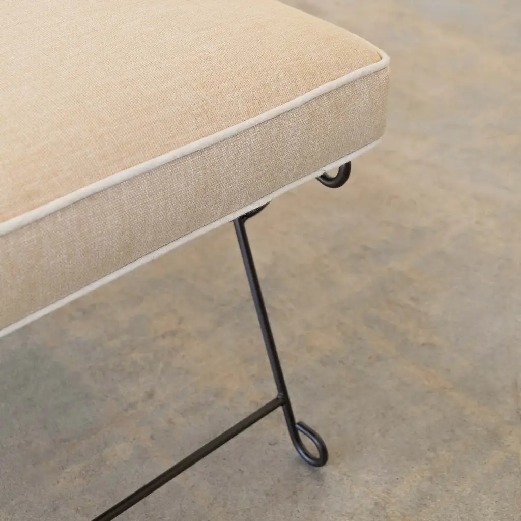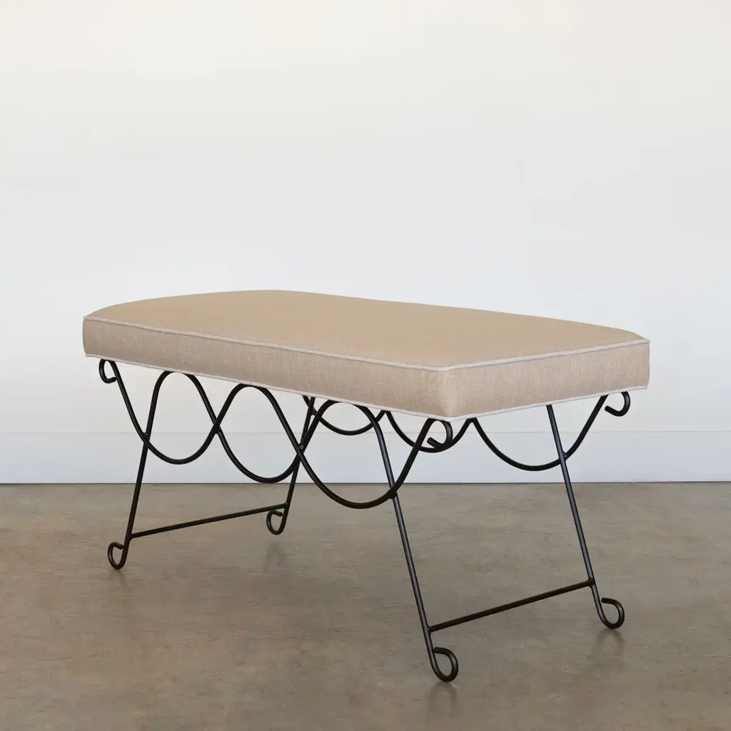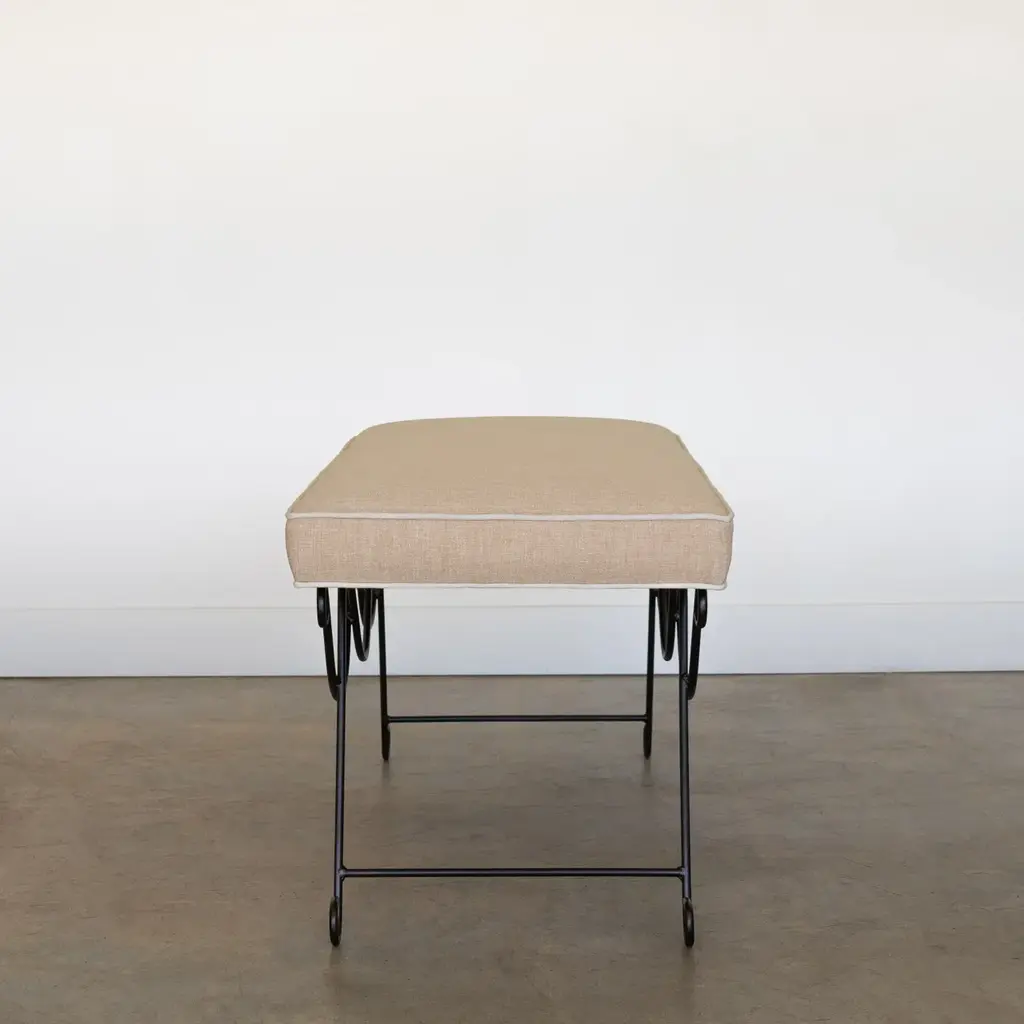 Beautiful iron bench with curved and looped base painted in a matte black finish inspired by French design. Rectangular cushioned seat upholstered in a tan cotton linen blend fabric with cream trim. Multiple available, sold individually. Made in Los Angeles.