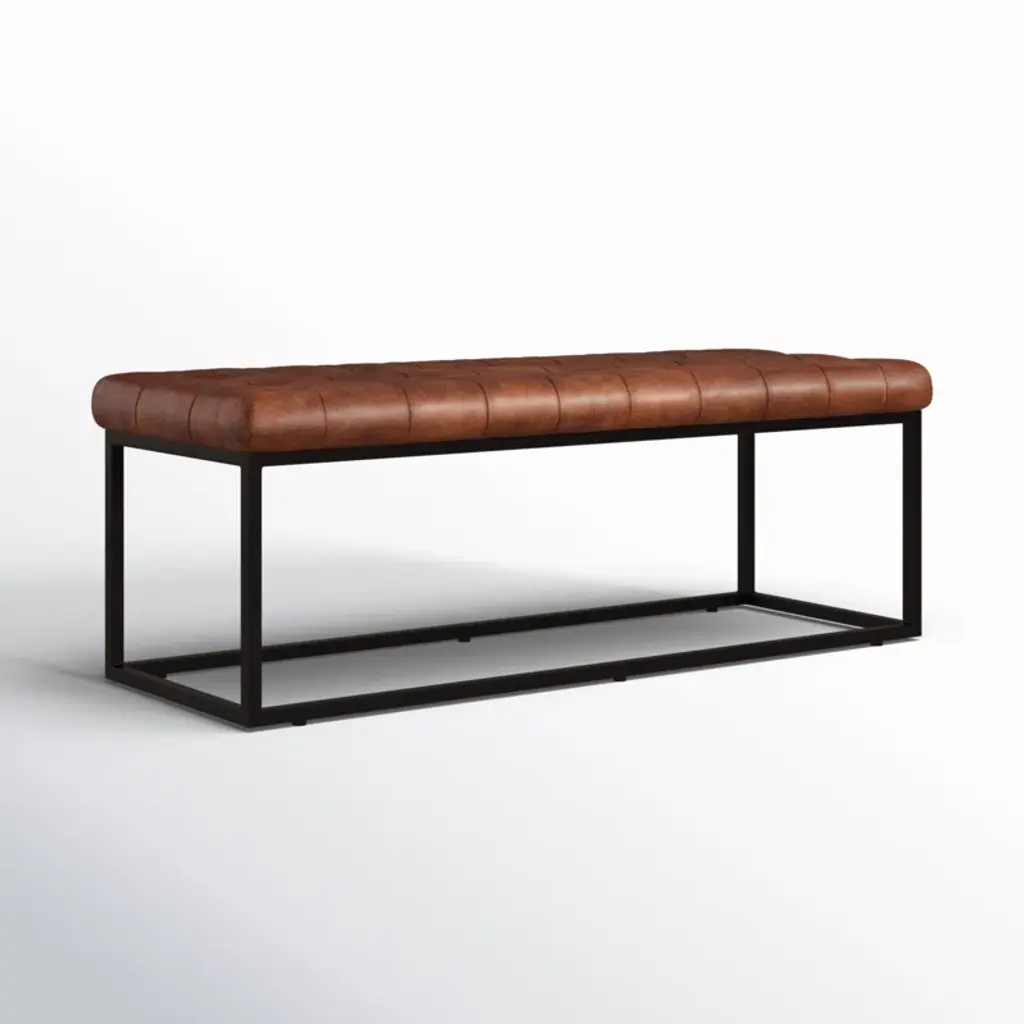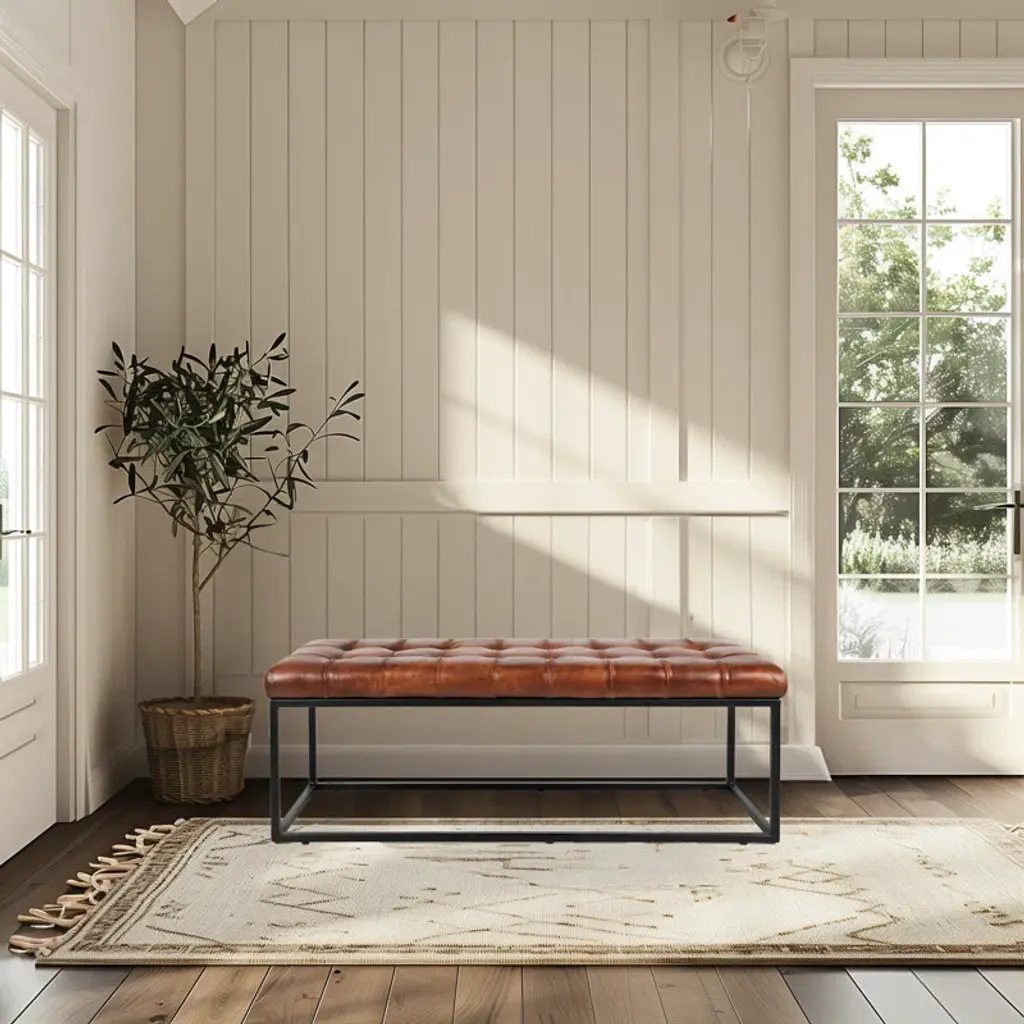Traditional with a twist, this bench’s tufted leather seat floats on an open metal base, blending classic comfort with strong geometric lines and visual lightness. The leather showcases purposeful distressing for a well-worn character that only gets better with time and use. It arrives fully assembled.