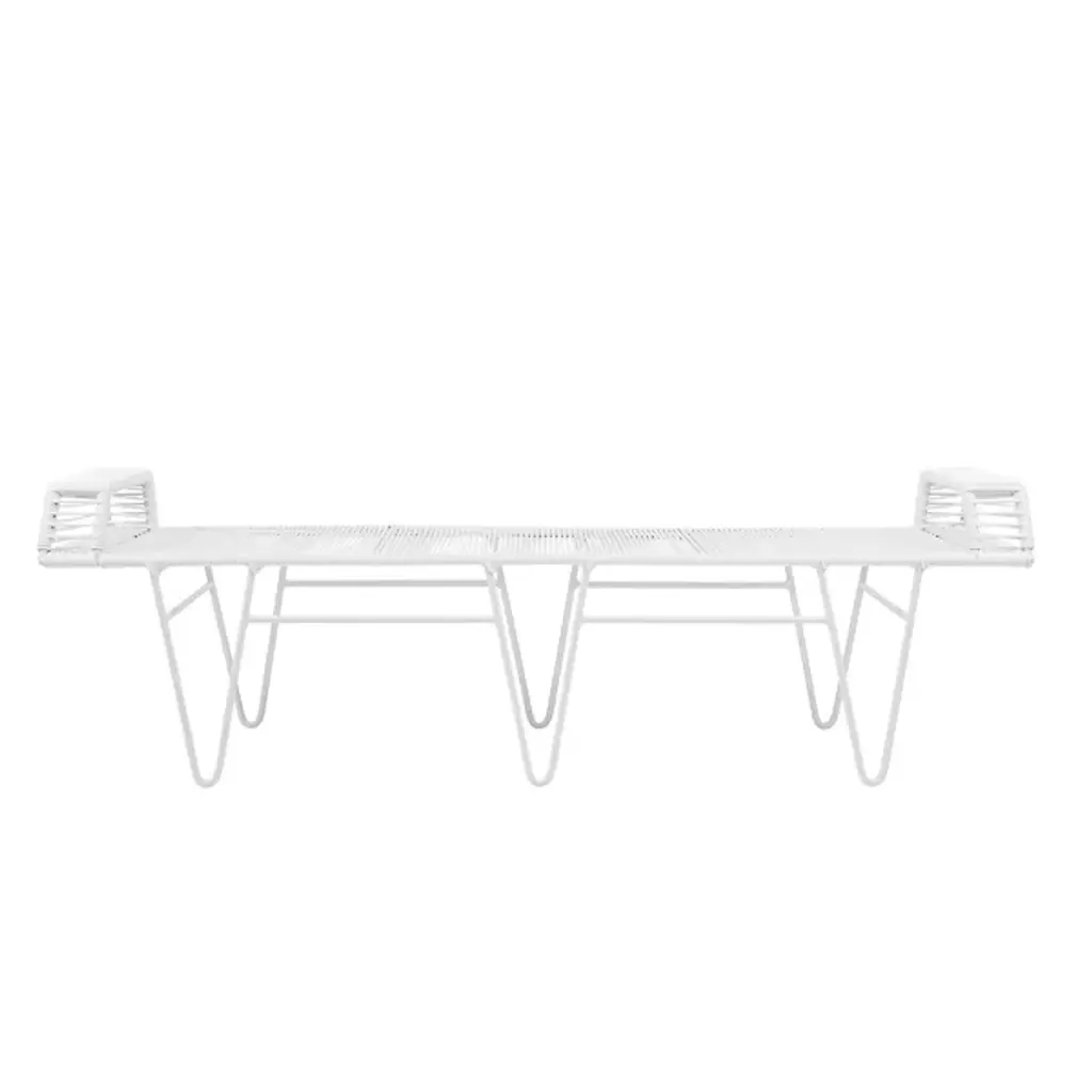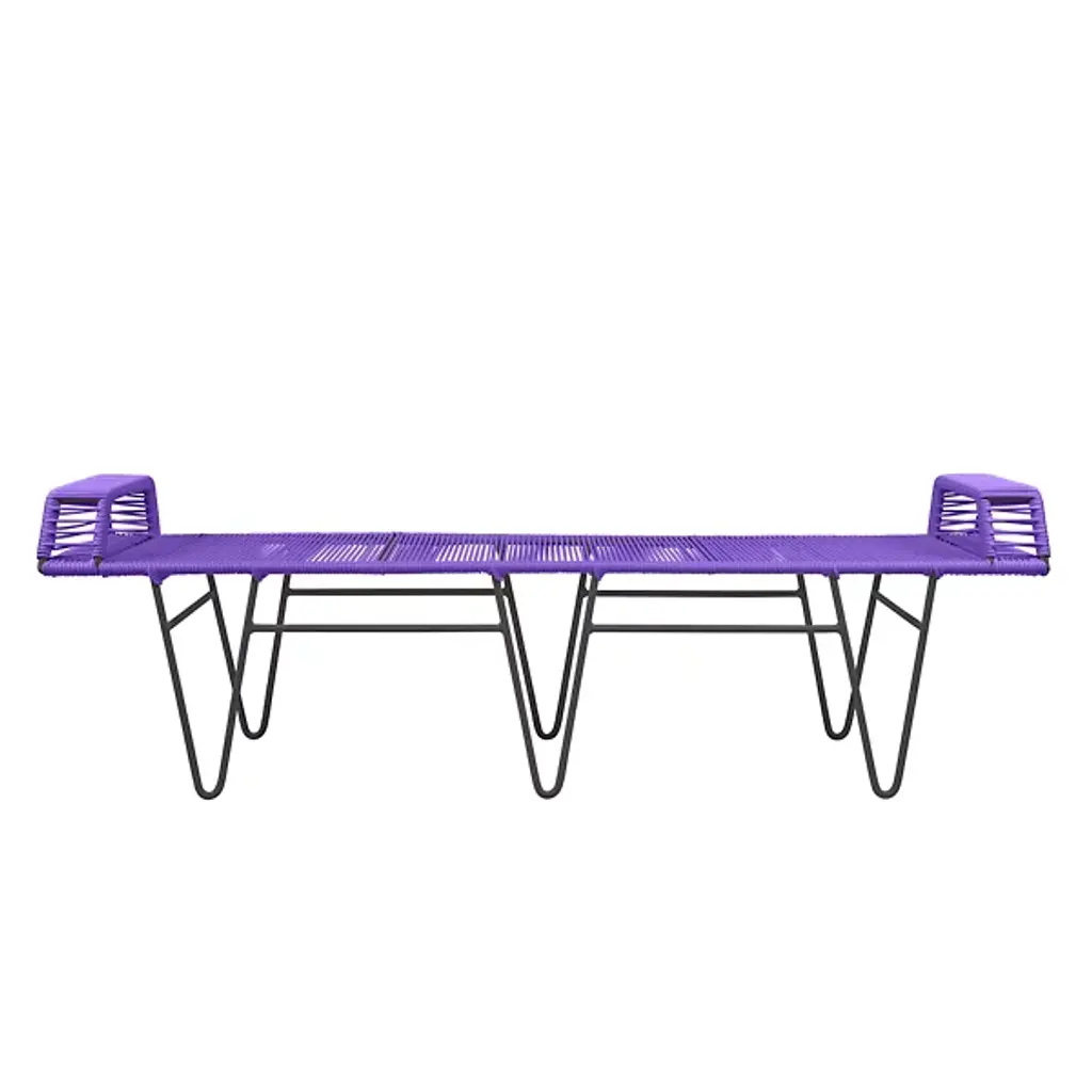 A statement-making piece with no shortage of style. Taking cues from traditional Mexican craftsmanship, the Pelopin Bench from Innit Designs makes a splash inside or outside as comfortable seating for three. It draws your eyes with a snazzy silhouette emphasized by a sequence of tapered legs. Made in steel, the angular frame delivers a refined look and a sturdy base. Over the top, artisans hand wrap cords of UV-resistant vinyl to create a comfortable seating experience emphasized by a breathable feel. Low-profile armrests flanking the seat serve as a final touch showcasing the fine vinyl pattern.