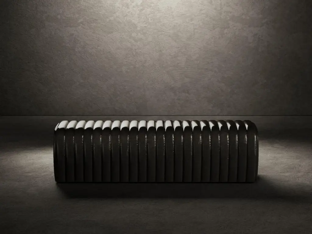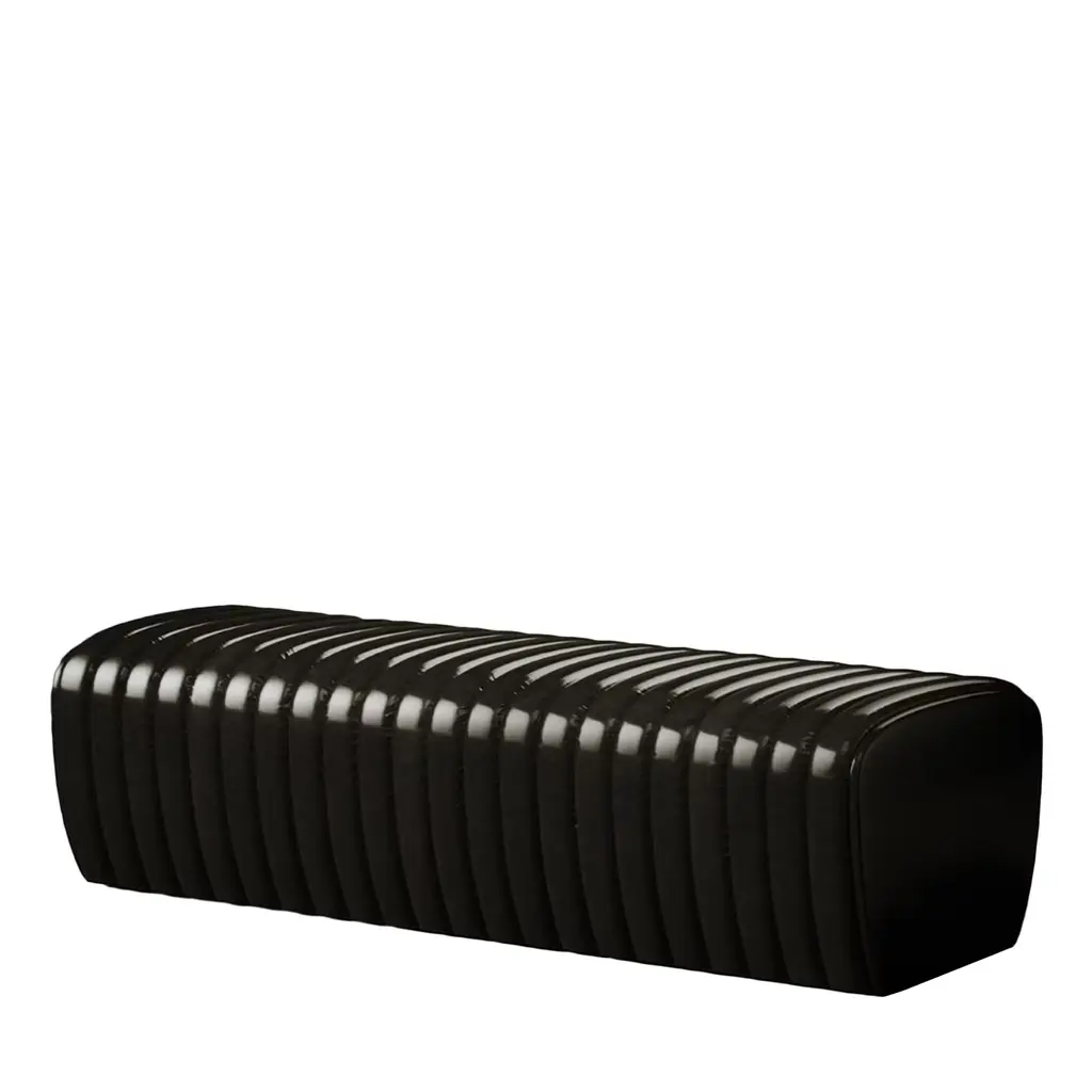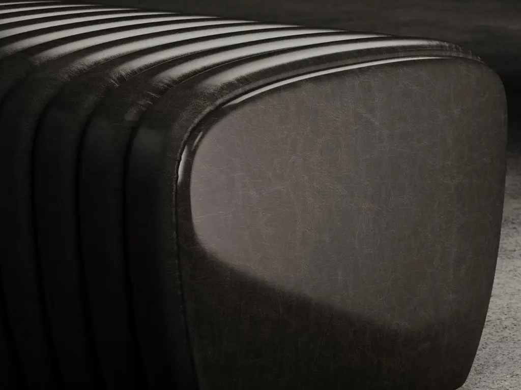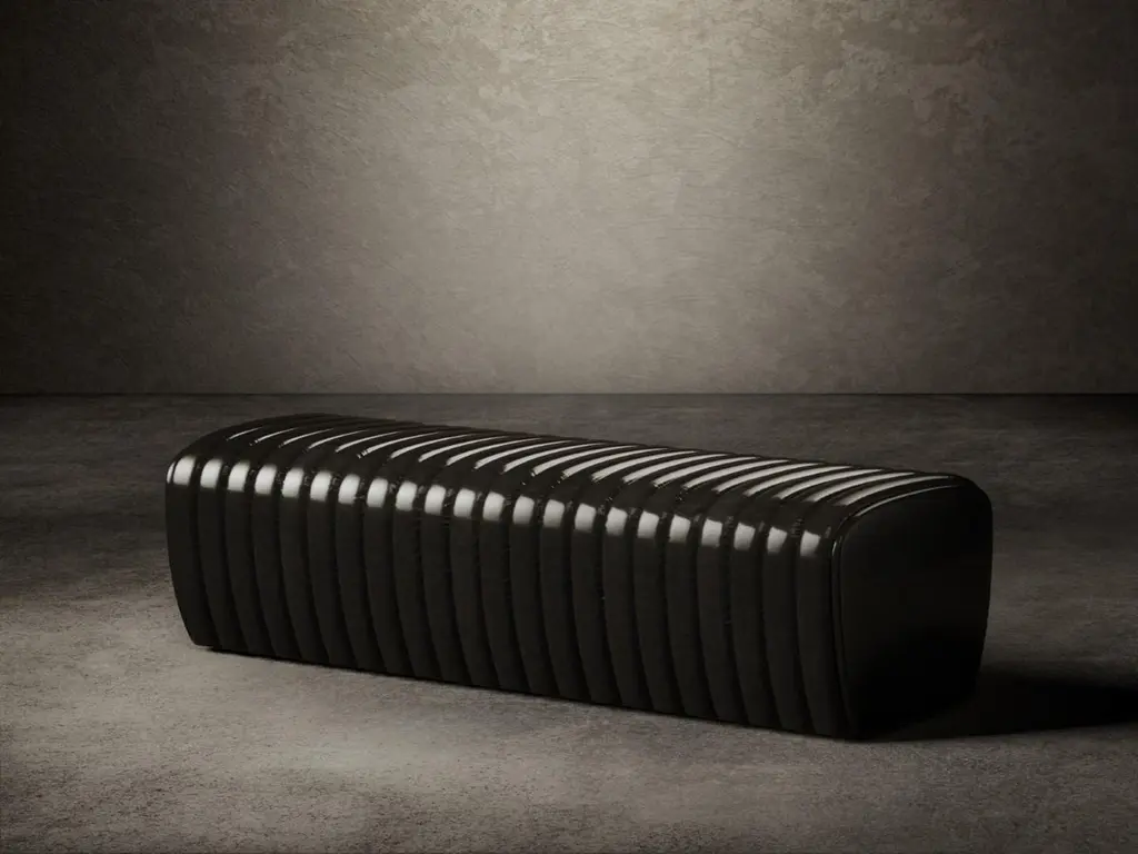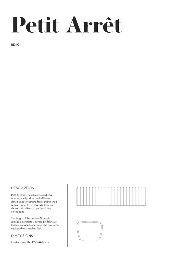 Petit Arrêt is a bench composed of a wooden shell padded with different densities polyurethane foam and finished with an upper layer of acrylic fiber and characterized by a striped padding on the seat. The length of the petit arrêt bench, available completely covered in fabric or leather, is made to measure. The product is equipped with leveling feet.This version of the Petit Arret bench is upholstered with Shining Leather, Black color, a buffed aniline leather with a surface water-resistant vegetable treatment. DIMENSIONS:Custom length - D56xH42 cm