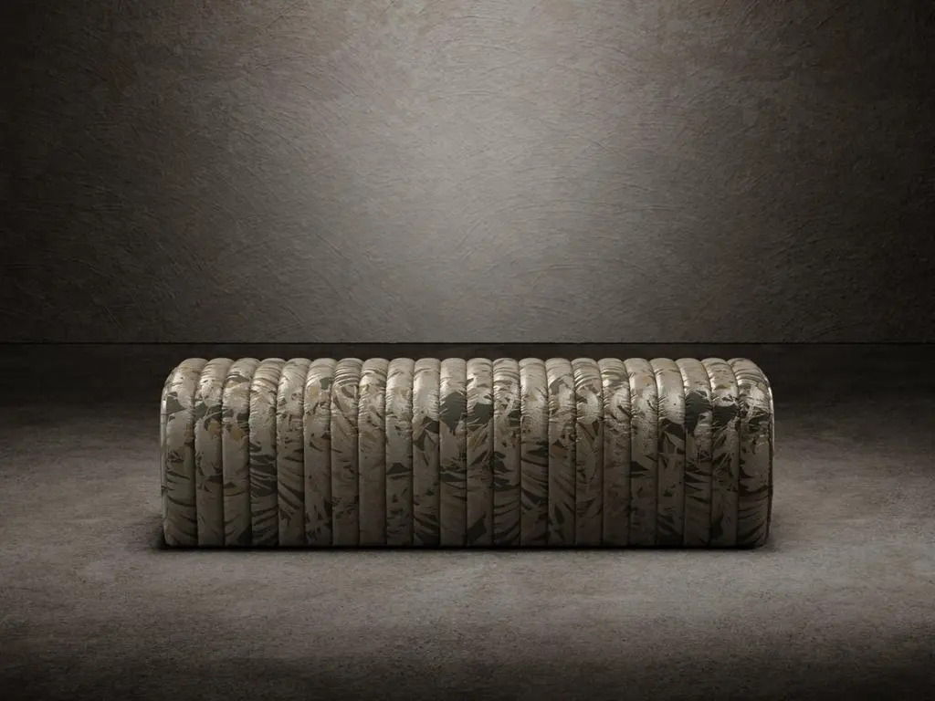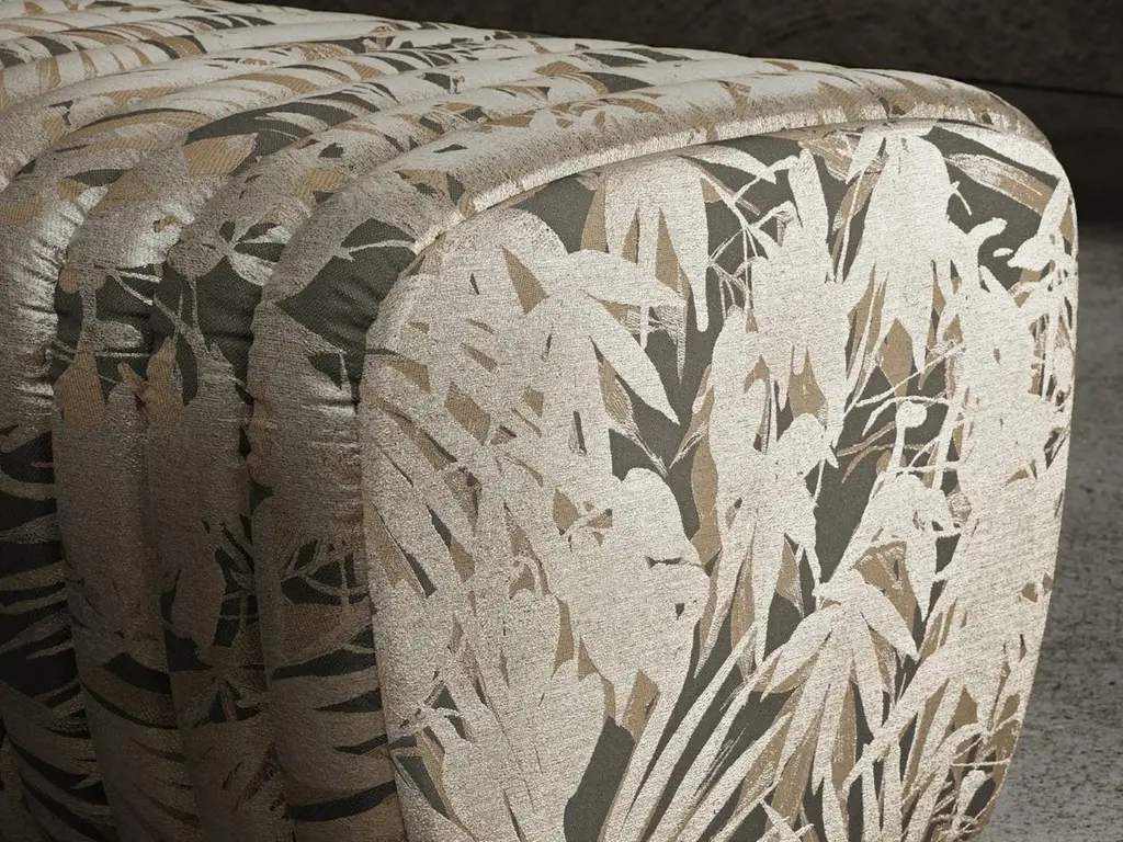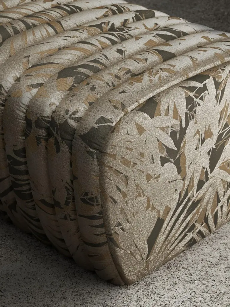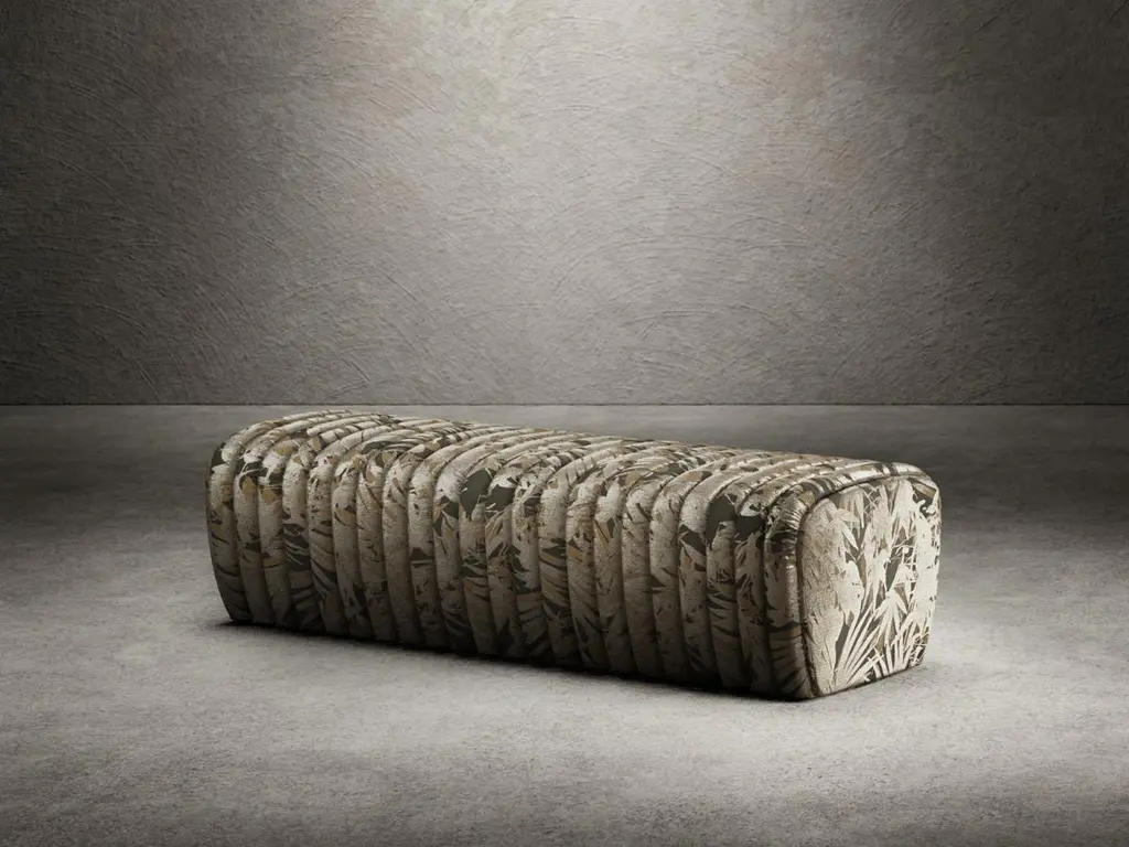 Petit Arrêt is a bench composed of a wooden shell padded with different densities polyurethane foam and finished with an upper layer of acrylic fiber and characterized by a striped padding on the seat. The length of the petit arrêt bench, available completely covered in fabric or leather, is made to measure. The product is equipped with leveling feet.This version of the Petit Arret bench is upholstered with JAVA Fabric by Rubelli. This fabric is a play on light and shade, on the overlapping of shiny and matte silhouettes reminiscent of Japanese lacquer. Plant elements with graceful shapes, possibly Kentia palms, stand ut luminous in the foreground.DIMENSIONS:Custom length - D56xH42 cm