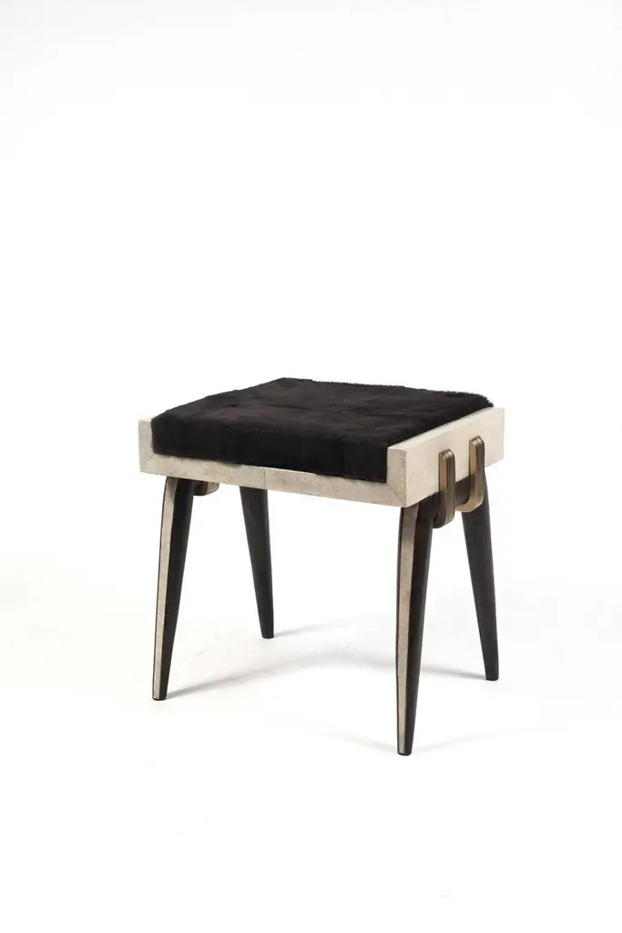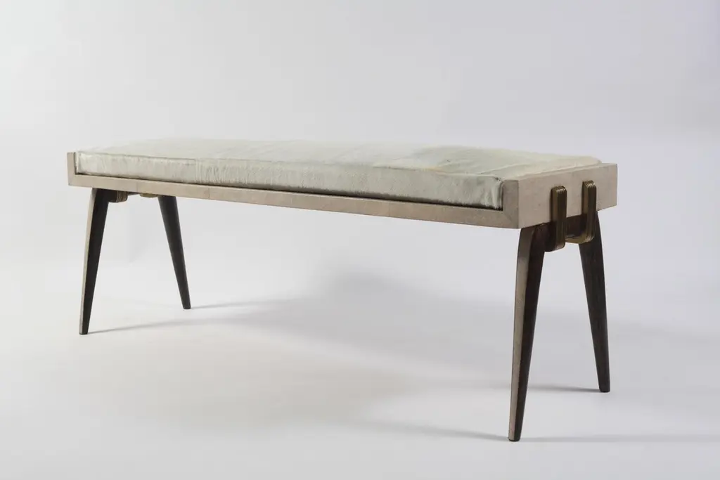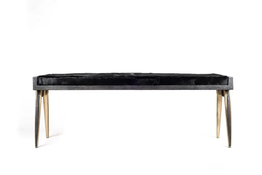 The Paris based label has distinguished themselves since their launch, with their iconic use of shagreen mixed with brass and other exotic materials. All furniture is handcrafted by skilled artisans, ultimately making each piece unique, designed in Paris and produced in the Philippines.The pianist bench has subtle and elegant details on its legs, with a mixture of bronze and coal black shagreen inlay. The bronze-patina brass overlap on both sides adds another unique element to piece. The black horsehair covered cushion is removable. Custom color or sizing available on request. A Cream version of this piece can be seen at the end of the image slide. A stool version is also available, image at end of slide. The finish of the shagreen is authentic as it is hand-dyed and the designer calls the finish look: "coal black shagreen."The dimensions of this piece are 133 x 40 x 50 cm / 52.5" x 15.75" x 19.75"All R & Y Augousti pieces are handmade by artisans, ultimately making each piece unique.Wipe clean with soft dry cloth.Acclaimed design duo Ria & Yiouri Augousti have established themselves since the 1990s as pioneers of modern-vintage style through their luxurious Art Deco inspired collections.The Paris based label has distinguished themselves since their launch, with their iconic use of shagreen mixed with brass and other exotic materials. All furniture is handcrafted by skilled artisans, ultimately making each piece unique. All shagreen-covered items should be kept out of direct sunlight, color variants may occur on the stingray and other exotic finishes, but this showcases the Parisian label's commitment to creating authentic luxurious products using natural components.