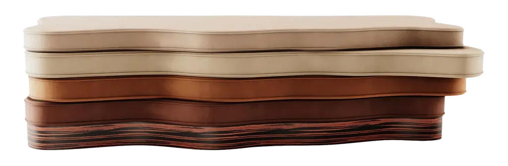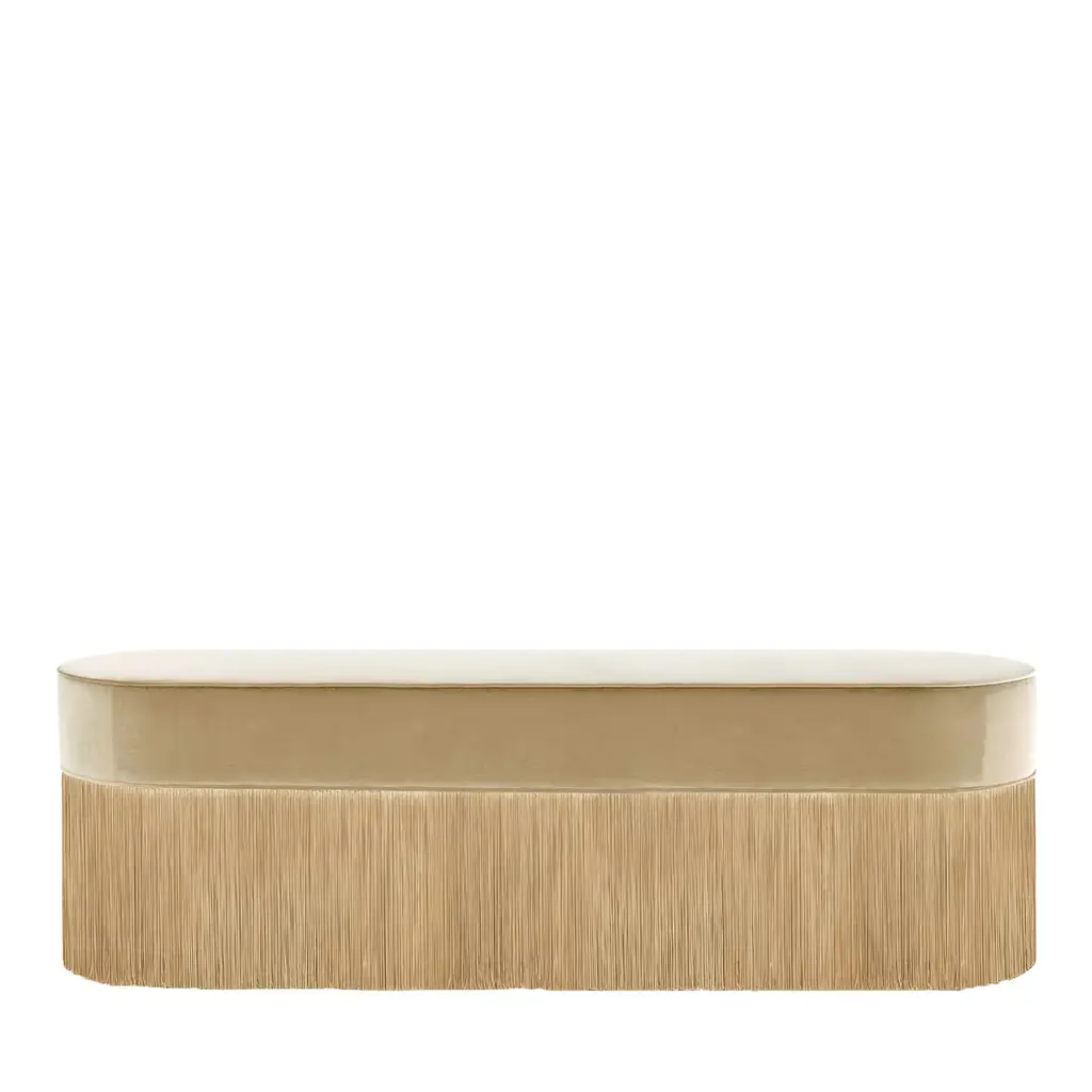 The Plissé Cognac Bench is a stunning piece that combines luxury and functional design. Measuring 160 cm (63 inches) in length, 45 cm (17.7 inches) in depth, and 50 cm (19.7 inches) in height, this bench is designed to elevate any space with its elegant proportions. Upholstered in rich cognac velvet, the bench features a distinctive fringe detail in complementary tones, adding texture and depth to the piece. The signature Plissé pattern introduces a sophisticated pleated effect, where overlapping fringe motifs create a sense of movement and lightness. This design brings both modern flair and timeless charm to the bench, making it an ideal addition to various interior styles. The warm cognac color provides a rich, inviting tone, adding depth and character to living areas, entryways, or bedrooms. Each bespoke piece is stamped on the bottom of the pouf’s lining and personally signed, numbered, and dated by designer.