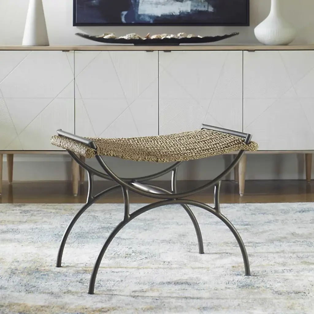 The Playa Small Bench from Uttermost, where artisanal craftsmanship meets coastal charm. Designed by Osvaldo Mendoza, this bench features a meticulously handwoven seat crafted from natural seagrass, offering a touch of organic allure. Its graceful, curved metal base, finished in brushed gunmetal, adds a contemporary flair while providing sturdy support. Its seamless blend of Artisanal Modern and Coastal and nautical styles makes it a statement of understated elegance, perfect for adding character to any space.