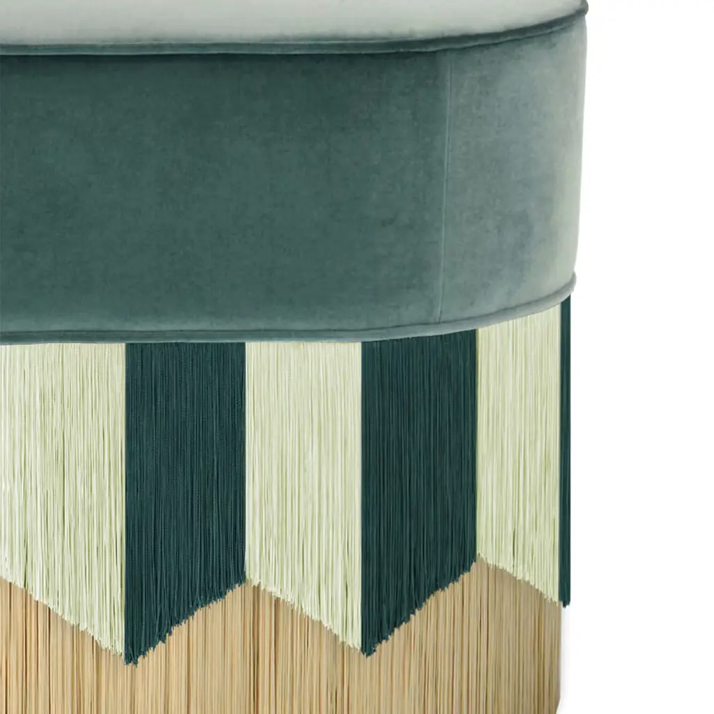 The Plissé Green Velvet Oval Bench, measuring 85 cm (33.5 inches) in length, 40 cm (15.7 inches) in depth, and 46 cm (18.1 inches) in height, is a sophisticated addition to any interior space, making it an ideal choice for smaller areas. Upholstered in serene green velvet, this bench features a refined design enhanced by fringes in matching tonal shades, creating a harmonious visual effect. The innovative Plissé pattern showcases a clean and elegant aesthetic, while the overlapping fringe motif evokes a sense of movement and lightness. This versatile piece not only serves as functional seating but also acts as a stylish accent, elevating the ambiance of any room. Each bespoke piece is stamped on the bottom of the pouf’s lining and personally signed, numbered, and dated by designer.