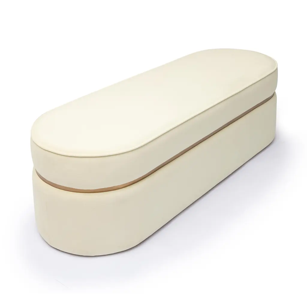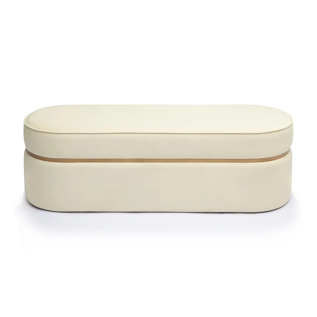 Indulge in the ultimate blend of luxury and comfort with the Pomp Velvet Bench, available in cream or honey, featuring high-density foam on top for a relaxing seating experience. A thin, gold stainless steel strip runs gracefully down the middle, adding an art deco touch that exudes understated glamour. Elevate any room's aesthetic with this timeless piece that's so in vogue right now.