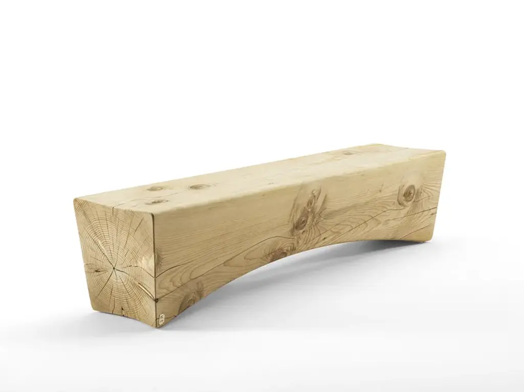 Pontevecchio is a solid scented cedar wood bench carved from a single block, characterised by a square, linear shape that meets a curved shape below the seating surface, lightening the visual effect.