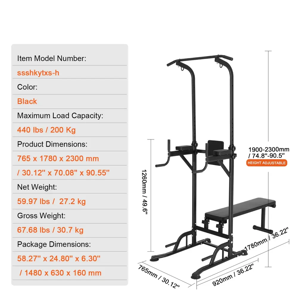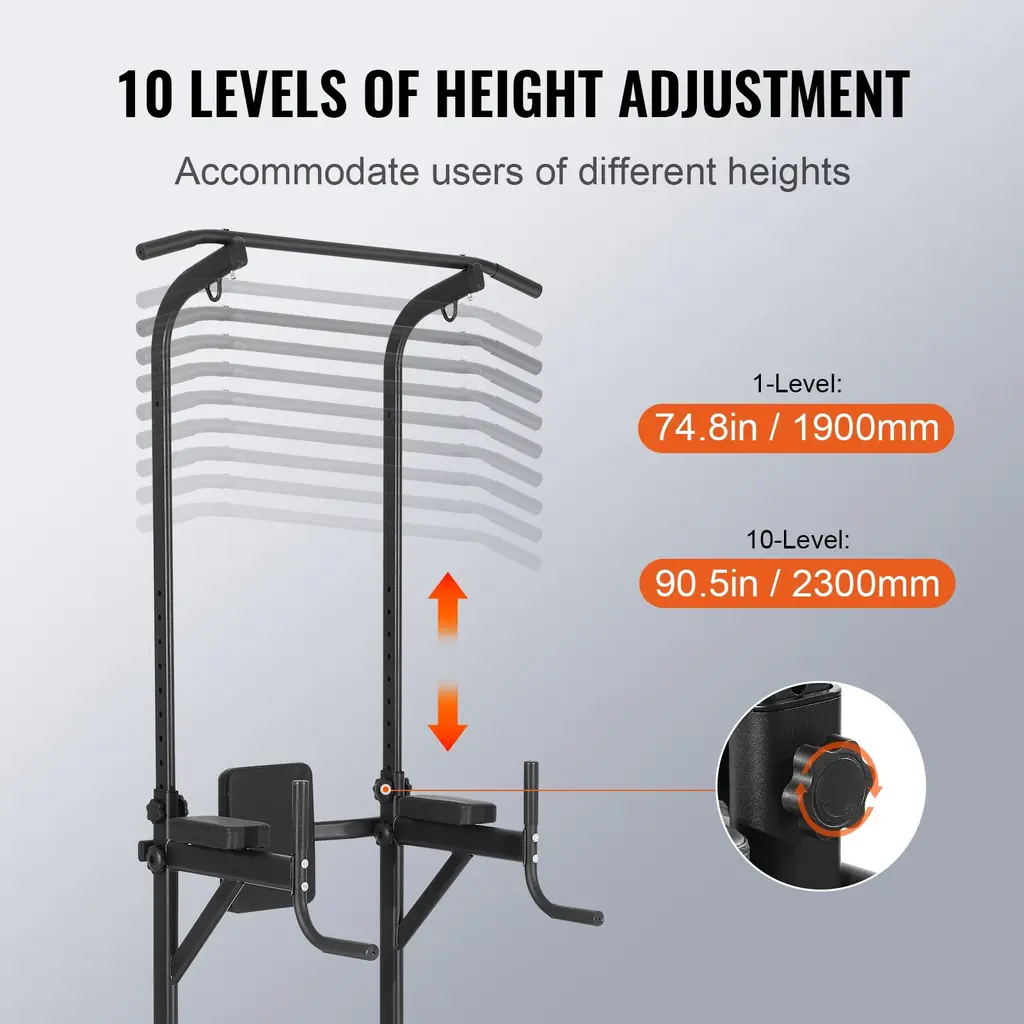 Sturdy and Stable: Elevate your fitness routine with power tower dip station, crafted from rust-resistant carbon steel and treated with surface powder coating for durability. Capable of supporting up to 440LBS, it features 1.5mm wall thickness, H-shaped stable base, and 4 suction foot covers to ensure steady and secure workouts. Flexible Height Adjustment: pull up bar stand has 10 levels of adjustment from 74.8-inch to 90.5-inch, accommodating users of different heights and meeting diverse fitness needs. Perfect for adults, teenagers, fitness enthusiasts, and seniors, encouraging family participation in workouts and promoting overall fitness. Ergonomic Power Tower: Prioritizing your comfort and safety, our strength training dip station comes with high-quality PU elbow pads to protect elbow joints. 7-level/2-level adjustable premium backrest helps correct exercise posture, stabilize core strength, and protect your spine, ensuring safe and comfortable exercise sessions. Adapt to Your Workout Style: Enhance your fitness routine with versatility! strength training workout equipment offers a range of strength training exercises, perfect for building strength, core muscles, and improving body flexibility. It's your all-in-one solution for upper body stretching, spinal and neck stretching, and overall physical health. Easy Installation: Our home gym pull up bar stand for fitness provides professional assembly tools and instructions for efficient and hassle-free installation. It is not recommended for prolonged outdoor exposure, and warm-up exercises are needed before each workout session. Package Content 1 x Pack of Screws 1 x Back Cushion 2 x Armrest Pads 4 x Suction Cup Foot Covers (1 x Pack of Screws 1 x Back Cushion 2 x Elbow Pads 4 x Suction Cup Foot Covers 2 x Pull Ropes 2 x Tension Ropes) for 2-level option