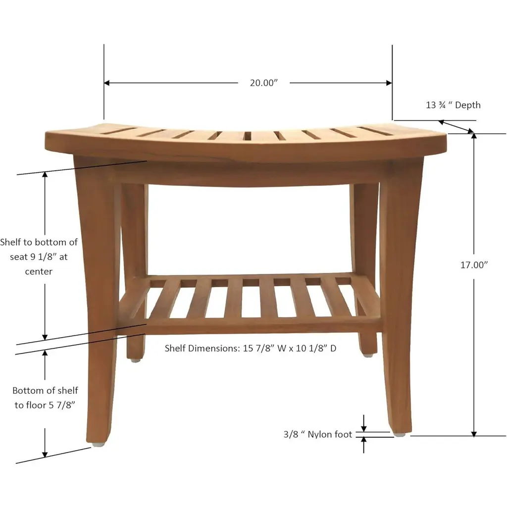 Easy to clean, simply wipe clean with a damp clean cloth. Shelf Dimensions: 15 7/8"W x 10 1/8"D.. Dimensions: 20"W x 13.5"D x 17.5"H/WEIGHT CAPACITY 250. Can be used indoor or outdoor - meditiation bench, spa, shower, bath, deck.. Teak is almost impervious to the elements (some weathering will occur). Specificationss: Color: Weathered Gray, Natural Product Dimensions: 13.75"D x 20"W x 17"H Item Weight: 10.4 pounds Leg Style: Tapered Style: Old World Size: Large Seat Height: 17 Inches Maximum Weight Recommendation: 250 Pounds Product Care Instructions: Wipe with Dry Cloth