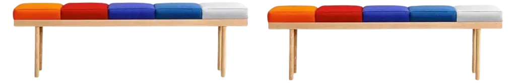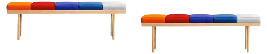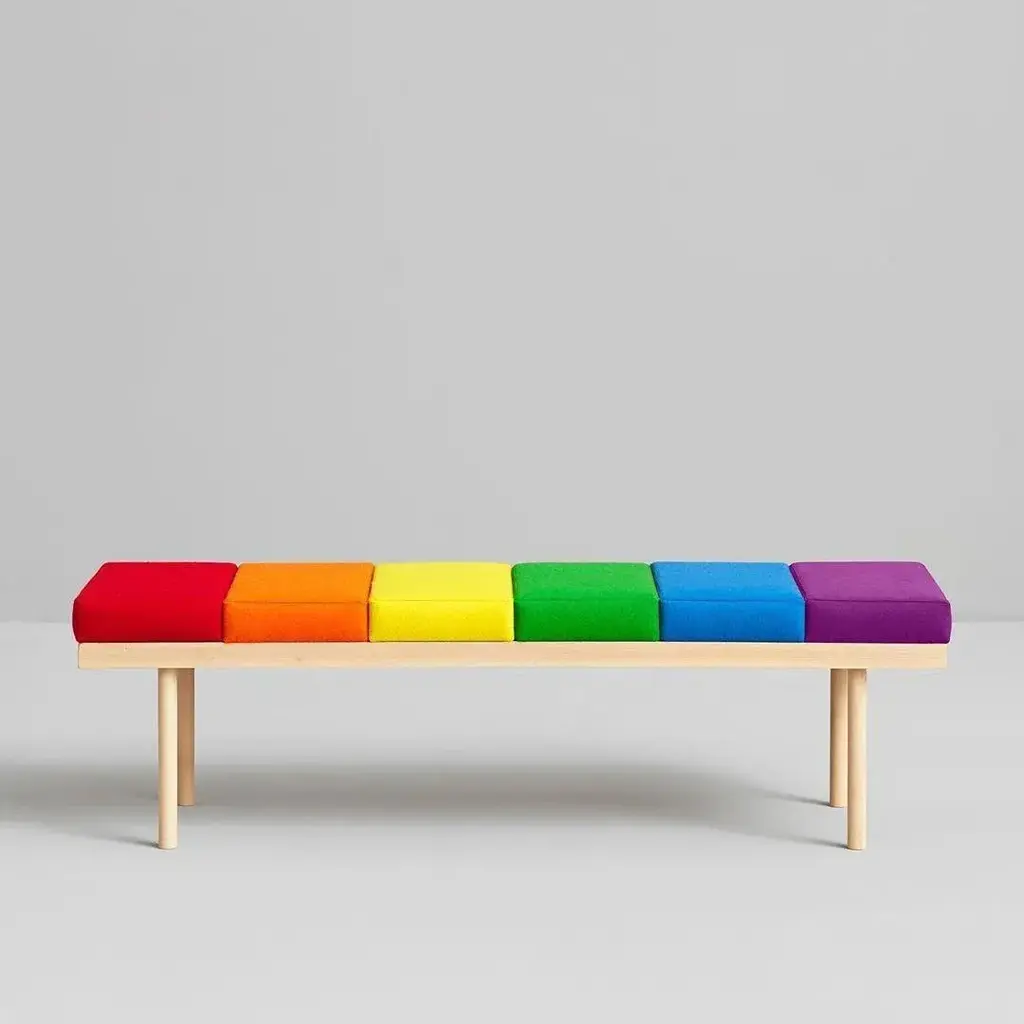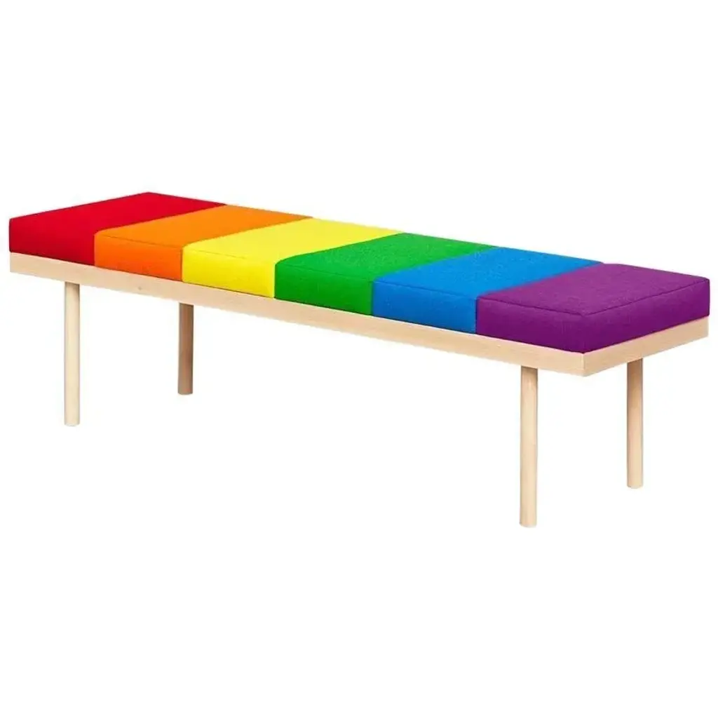 Pride special editon Valentino bench by Pepe Albargues Dimensions: 45 x 150 x 45 cm Materials: Beechwood structure. Seat stuffed with polyurethane 3542. The Valentino bench is an extremely versatile piece that adapts to everyone’s mood. It Invites the user to play around and create their own color combination. with its five multicolored cushions Valentino invites each person to combine them as they wish, creating their own unique composition. This piece is attributed to the mentioned designer/maker. It has no attribution mark and no official proof of authenticity, however it is well documented in design history. I take full responsibility for any authenticity issues arising from misattribution