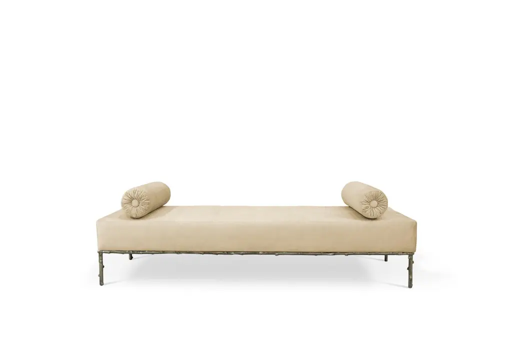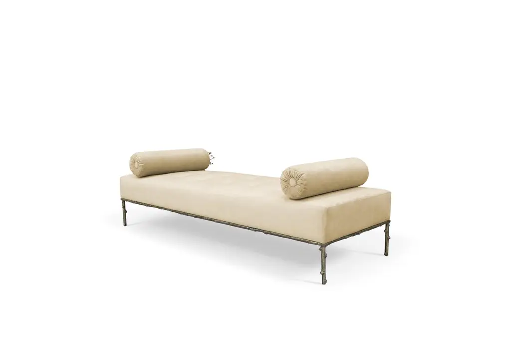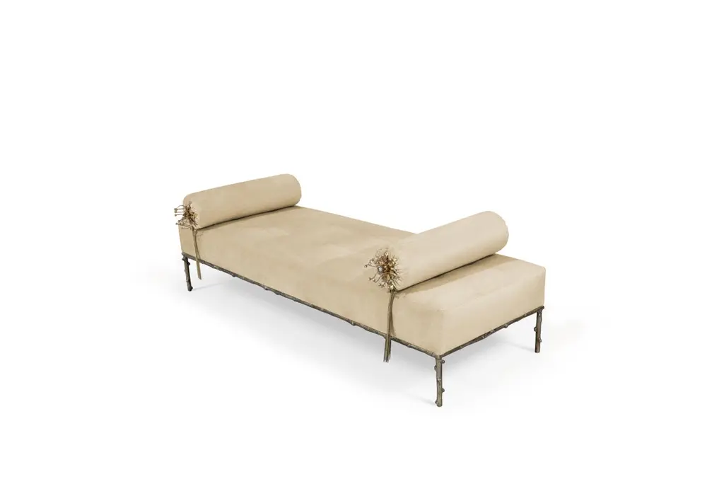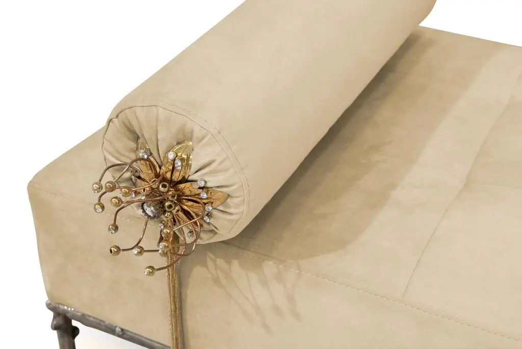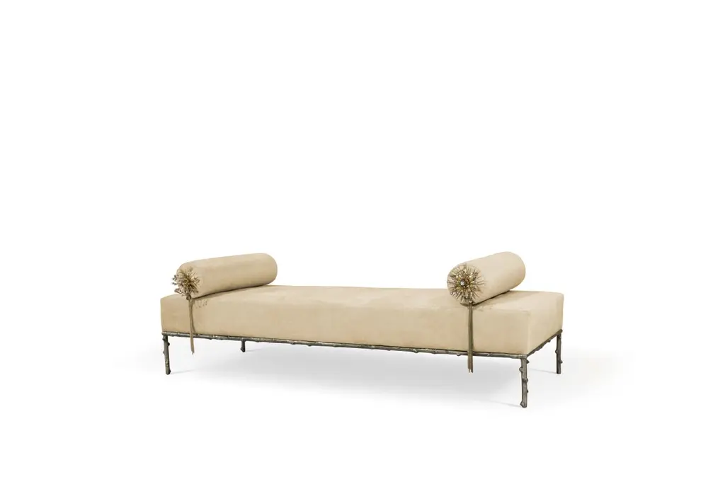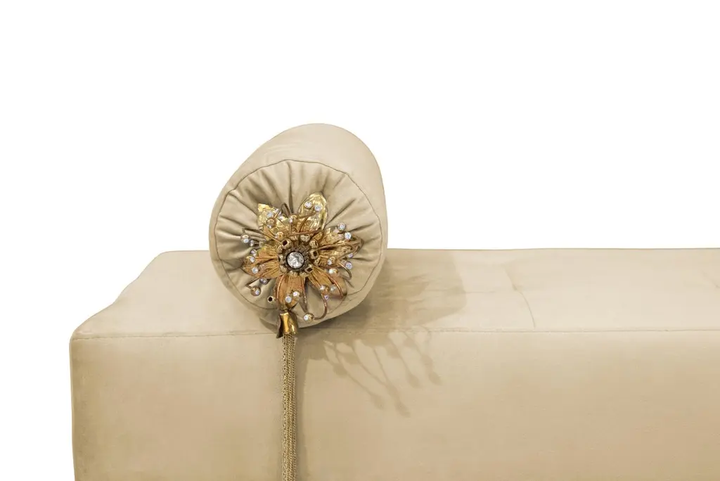 Not exactly flirtatious, but certainly not sweet, the Privê Bench guarantees sensuous drama. Exquisite fora inspired details adorn this seductive piece. A delicate branch-like base, stunning bronze & crystal jeweled bolsters, and sumptuous soft tufting make this an utterly desirable piece.Materials & Finishes: Upholstery: Paris Velvet Cream from the KOKET Textiles collectionBase: Aged Brass (High Gloss Finish)Pillows: Paris Velvet Cream from the KOKET Textiles collectionJewels: Aged Brass (High Gloss Finish)Clean & Care: Care for textiles by vacuuming or lightly brushing. Maintain textiles by keeping them away from direct sunlight. Rotate and flip cushions when vacuuming for even wear. The nap of high pile textiles such as velvets may become crushed or lose its original pile height. We recommend light steaming to lift the pile to its original height. The textile should also be brushed with a de-linting brush to maintain its pile. Water based or solvent cleaner may cause discoloration or staining. We recommend that stained or soiled textiles be professionally cleaned. Never use cleaners with alcohols or solvents on metals. Only use cotton or extra soft cloths. We recommend that tarnished metals be professionally cleaned. Clean polished metal or polished stainless with a damp cloth. Do not use commercial or heavy-duty polishes or waxes, as they may scratch or damage the finish. Polishes we do recommend are Brasso, Simichrome, or our favorite Flitz; these can be used without inflicting damage even for the unskilled user, unless the polished surface has a wax sealer coat. These polishes will remove the wax while polishing the metal, but the surface would then have to be re-waxed if it is on a metal that needs to be sealed.