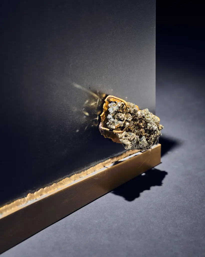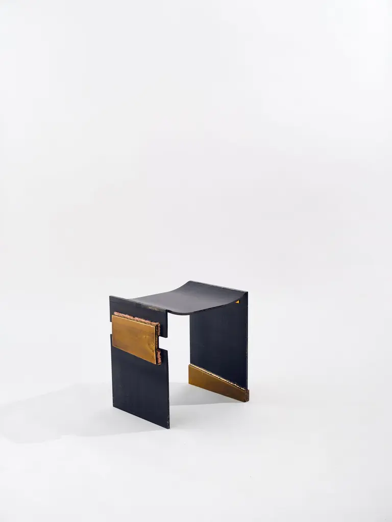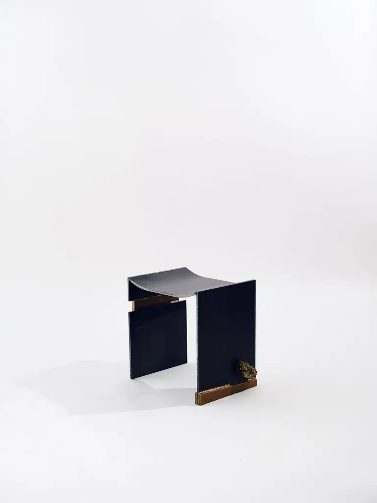 Pyrite bench by Brajak VitbergDimensions: D 45 x W 35 x H 48 cmMaterials: Metal, brass, natural pyrite mineralsBijelic and Brajak are two architects from Ljubljana, Slovenia.They are striving to design craft elements and make them timeless through experimental designing process.The studio creates a range of products from handmade and limited small series to one-piece unique products, inspired by materials and forms that create incomplete perfection.
