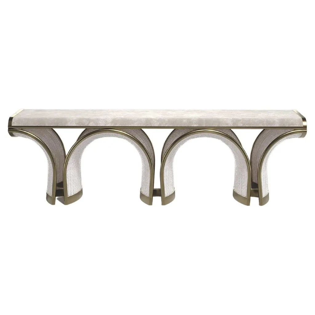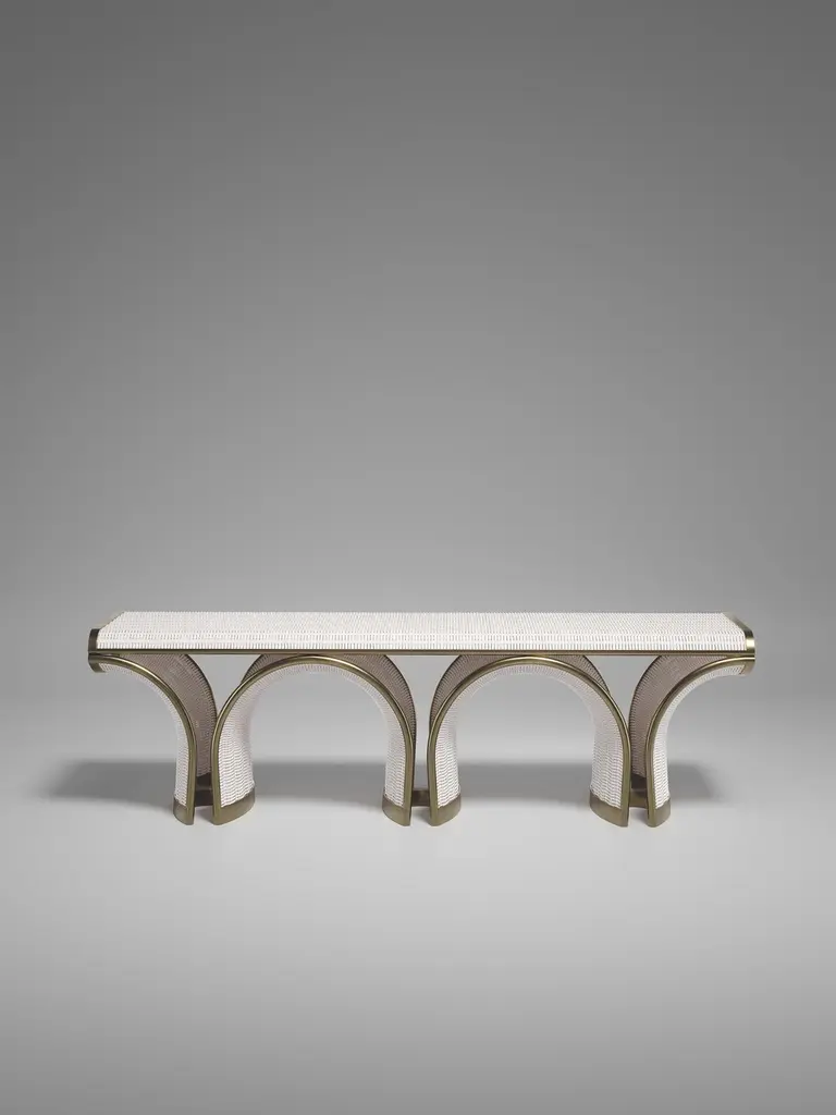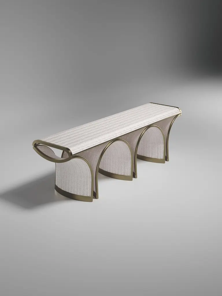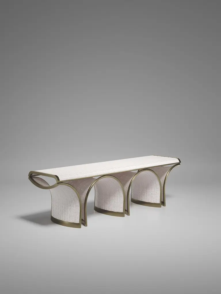 The Paris based label has distinguished themselves since their launch, with their iconic use of shagreen mixed with brass and other exotic materials. All furniture is handcrafted by skilled artisans, ultimately making each piece unique, designed in Paris and produced in the Philippines.The Nymphea Bench by R & Y Augousti is a part of their new Rattan capsule launch. The piece explores the brand's iconic DNA of bringing old world artisanal craft into a contemporary and utterly luxury feel. This seating piece is done in a cream rattan finish, with a cream velvet upholstered seat and bronze patina brass details. Available in other finishes. Part of the Augousti Rattan capsule, see images of the collection at end of slide. Custom sizing/finishing on requestThe dimensions of this piece are:155 x 41 x 45 cmAll R & Y Augousti pieces are handmade by artisans, ultimately making each piece unique.Wipe clean with soft dry cloth.Acclaimed design duo Ria & Yiouri Augousti have established themselves since the 1990s as pioneers of modern-vintage style through their luxurious Art Deco inspired collections.The Paris based label has distinguished themselves since their launch, with their iconic use of shagreen mixed with brass and other exotic materials. All furniture is handcrafted by skilled artisans, ultimately making each piece unique. All shagreen-covered items should be kept out of direct sunlight, color variants may occur on the stingray and other exotic finishes, but this showcases the Parisian label's commitment to creating authentic luxurious products using natural components.