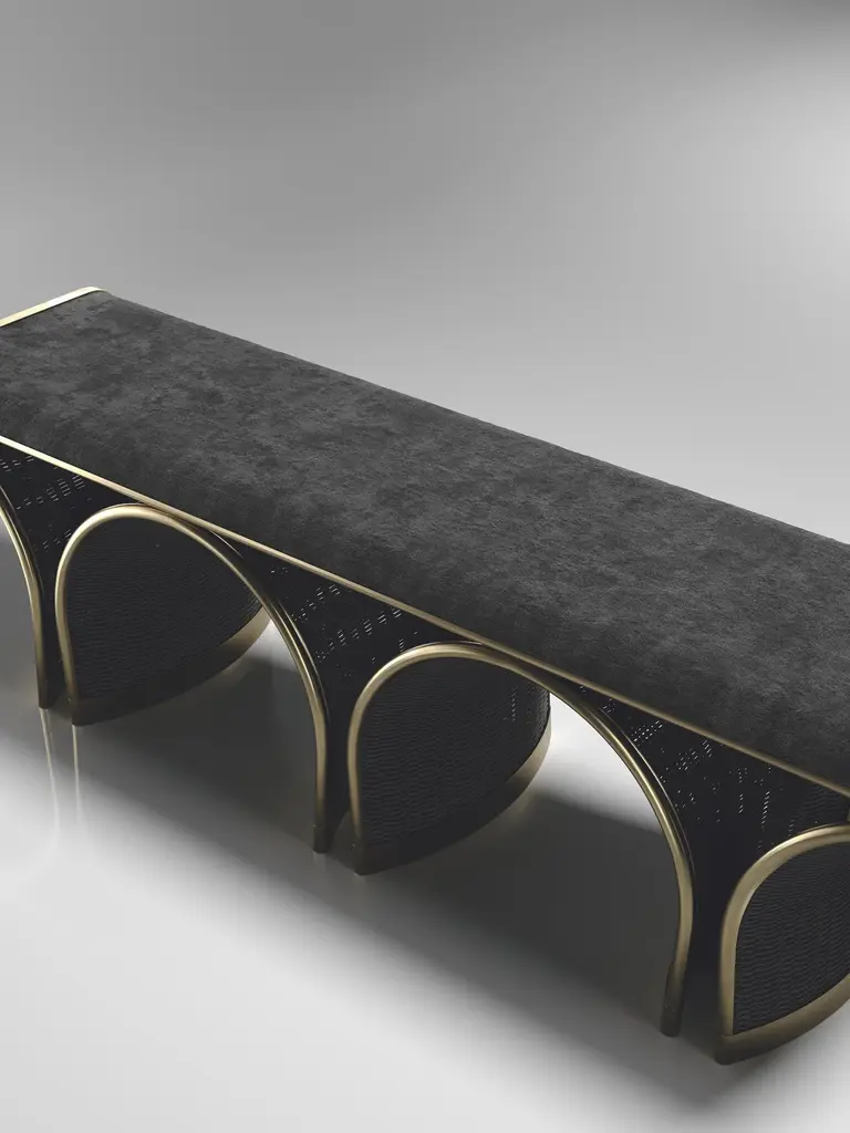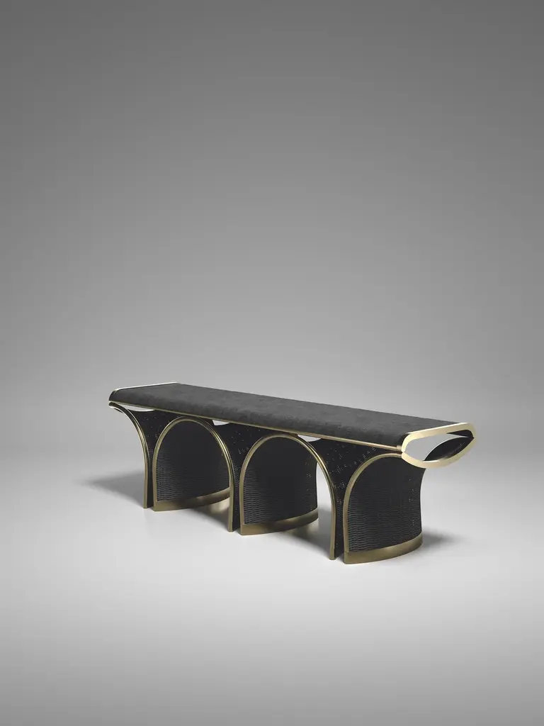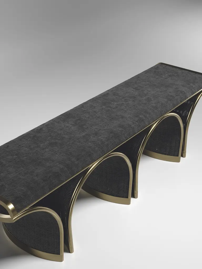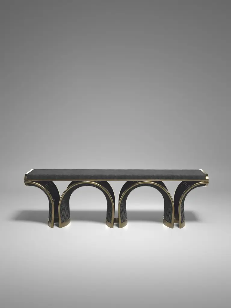 The Paris based label has distinguished themselves since their launch, with their iconic use of shagreen mixed with brass and other exotic materials. All furniture is handcrafted by skilled artisans, ultimately making each piece unique, designed in Paris and produced in the Philippines.The Nymphea Bench by R & Y Augousti is a part of their new Rattan capsule launch. The piece explores the brand's iconic DNA of bringing old world artisanal craft into a contemporary and utterly luxury feel. This seating piece is done in a black rattan finish, with a black velvet upholstered seat and bronze patina brass details. Available in other finishes. Part of the Augousti Rattan capsule, see images of the collection at end of slide. Custom sizing/finishing on requestThe dimensions of this piece are:Measures: 155 x 41 x 45 cmAll R & Y Augousti pieces are handmade by artisans, ultimately making each piece unique.Wipe clean with soft dry cloth.Acclaimed design duo Ria & Yiouri Augousti have established themselves since the 1990s as pioneers of modern-vintage style through their luxurious Art Deco inspired collections.The Paris based label has distinguished themselves since their launch, with their iconic use of shagreen mixed with brass and other exotic materials. All furniture is handcrafted by skilled artisans, ultimately making each piece unique. All shagreen-covered items should be kept out of direct sunlight, color variants may occur on the stingray and other exotic finishes, but this showcases the Parisian label's commitment to creating authentic luxurious products using natural components.