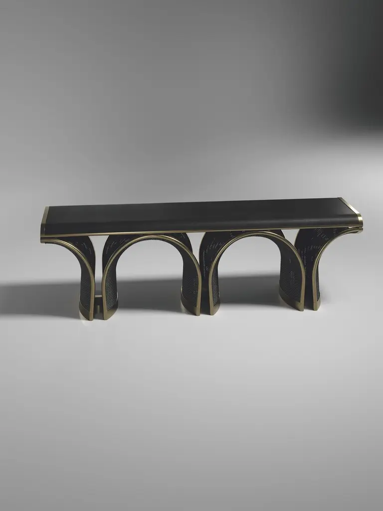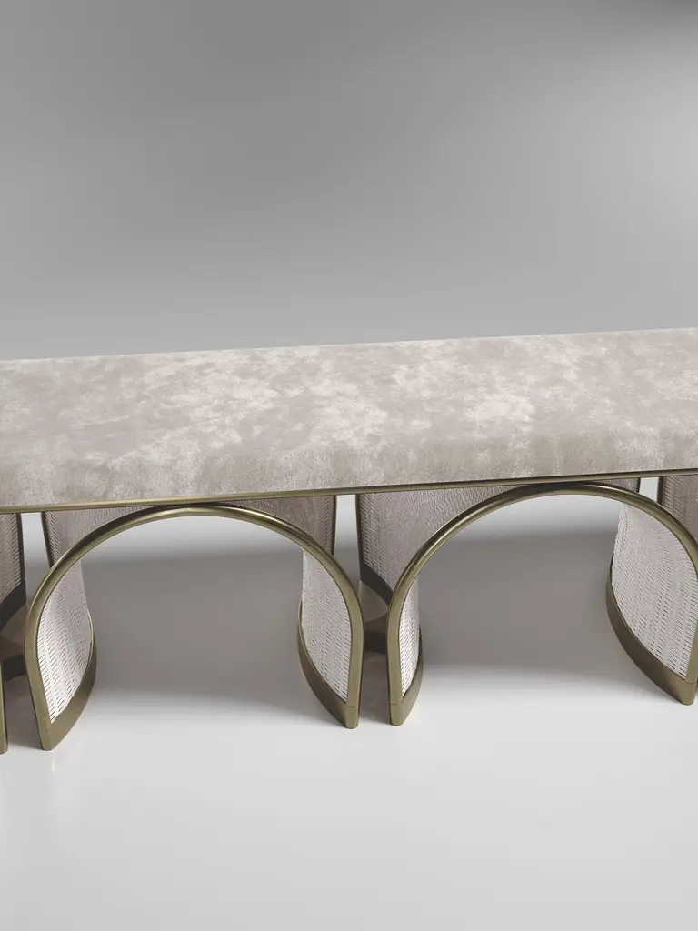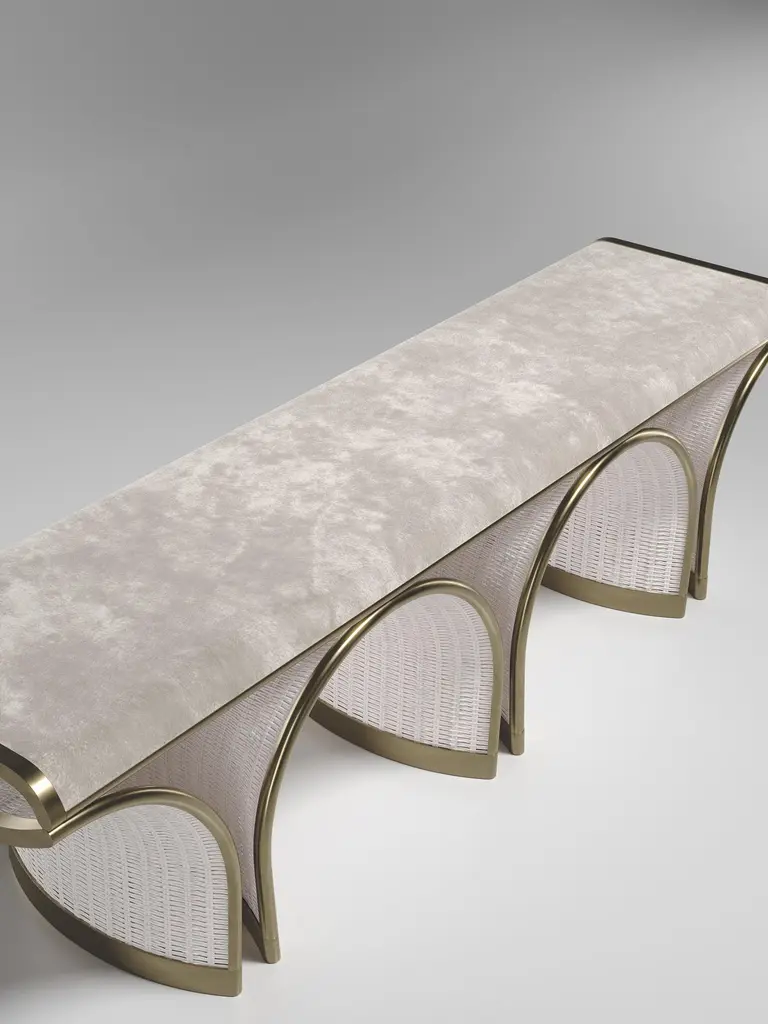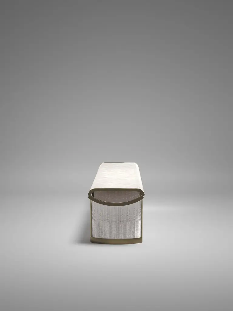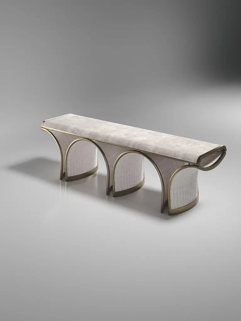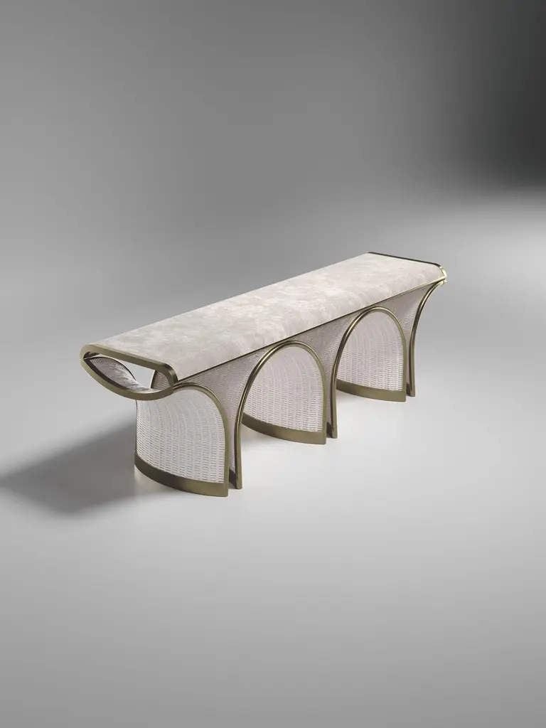 The Paris based label has distinguished themselves since their launch, with their iconic use of shagreen mixed with brass and other exotic materials. All furniture is handcrafted by skilled artisans, ultimately making each piece unique, designed in Paris and produced in the Philippines.The Nymphea Bench by R & Y Augousti is a part of their new Rattan capsule launch. The piece explores the brand's iconic DNA of bringing old world artisanal craft into a contemporary and utterly luxury feel. This seating piece is done in a cream rattan finish, with a cream velvet upholstered seat and bronze patina brass details. Available in other finishes. Part of the Augousti Rattan capsule, see images of the collection at end of slide. Custom sizing/finishing on requestThe dimensions of this piece are:155 x 41 x 45 cmAll R & Y Augousti pieces are handmade by artisans, ultimately making each piece unique.Wipe clean with soft dry cloth.Acclaimed design duo Ria & Yiouri Augousti have established themselves since the 1990s as pioneers of modern-vintage style through their luxurious Art Deco inspired collections.The Paris based label has distinguished themselves since their launch, with their iconic use of shagreen mixed with brass and other exotic materials. All furniture is handcrafted by skilled artisans, ultimately making each piece unique. All shagreen-covered items should be kept out of direct sunlight, color variants may occur on the stingray and other exotic finishes, but this showcases the Parisian label's commitment to creating authentic luxurious products using natural components.