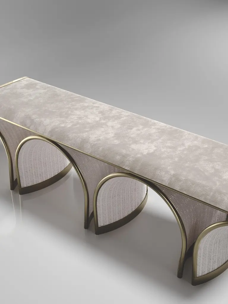 Rattan Bench With Velvet Upholstery Brass Inlay By R&y Augousti