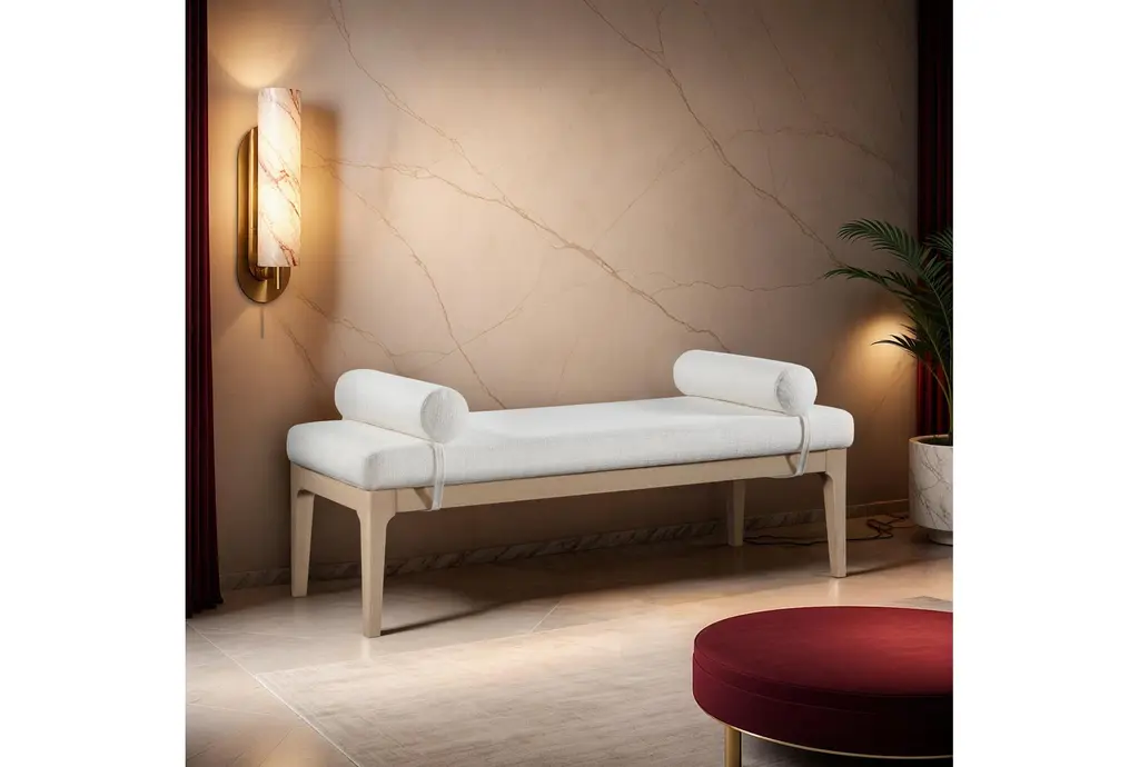 The Rayn Cream Linen Textured Upholstered Bedroom Bench with Natural Wood Legs is a stunning addition to any bedroom or entryway. This bench features a modern design with a cream fabric that complements its natural rubberwood legs. Perfect for adding extra seating or a touch of comfort to your space.