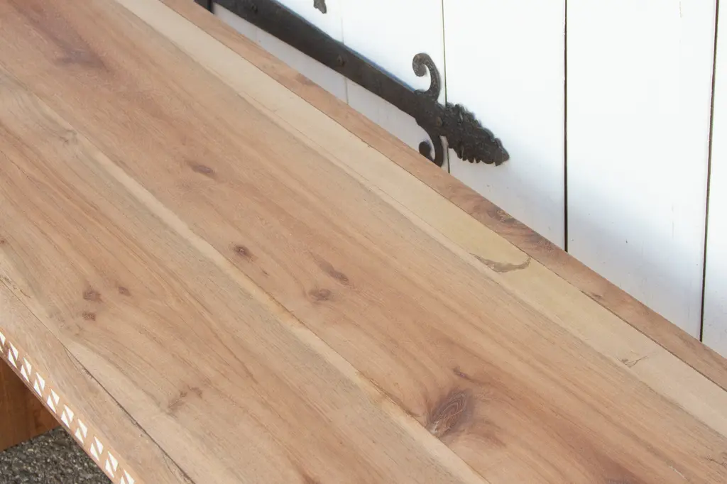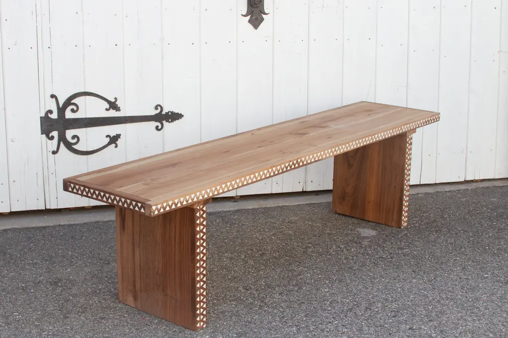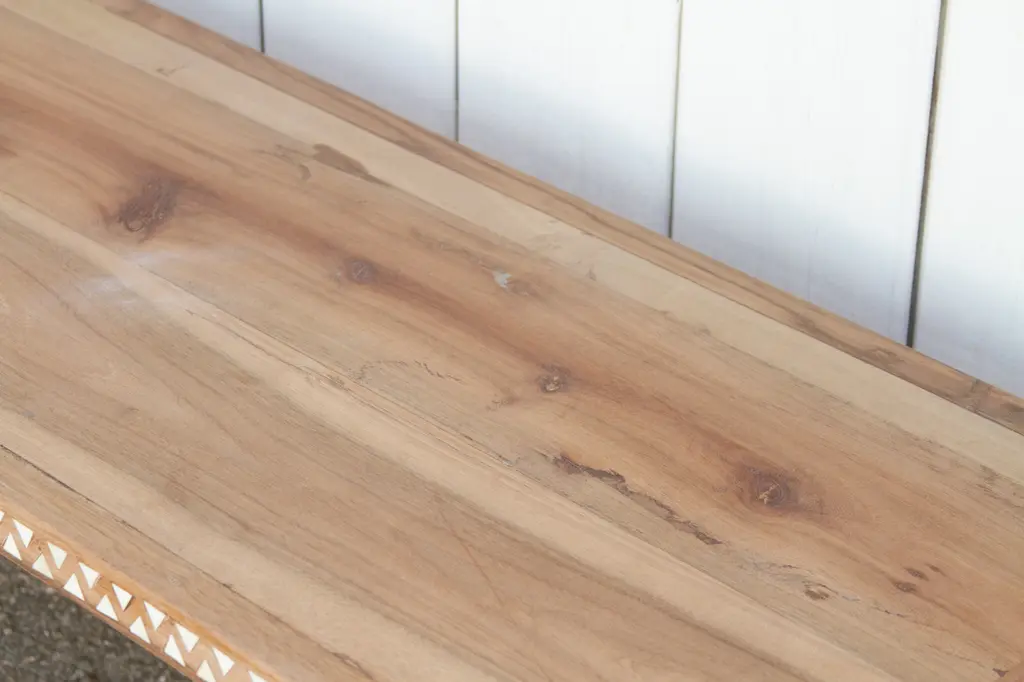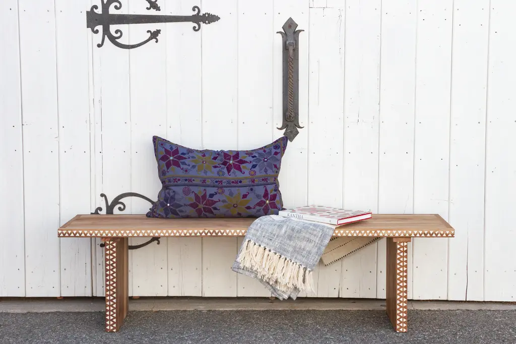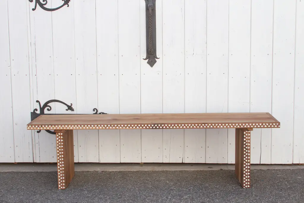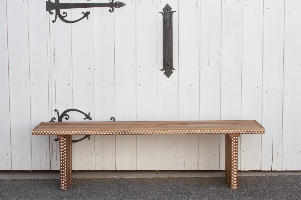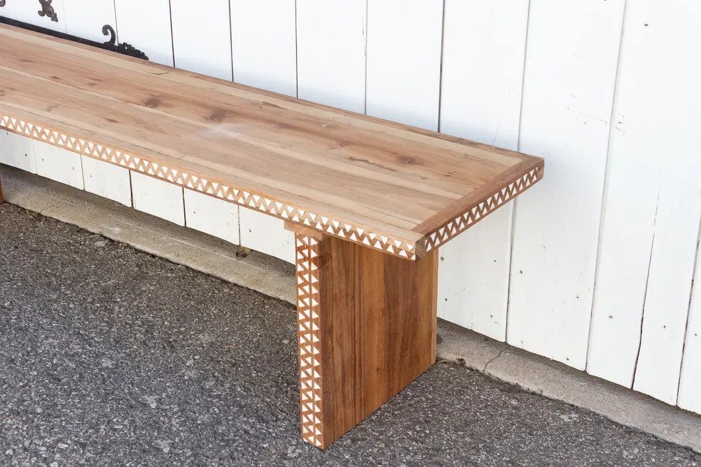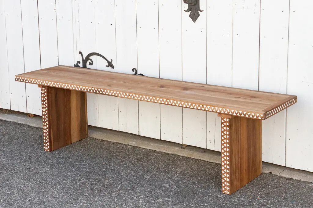 Made from reclaimed teak wood with a a stylish design, this reconstructed bench stand on two slat style legs. This boho modern bench features mother of pearl inlay in a tribal motif across the top and legs. This inlay motif is inspired by ancient work found in Naga. This teak bench has a clean natural raw finish.