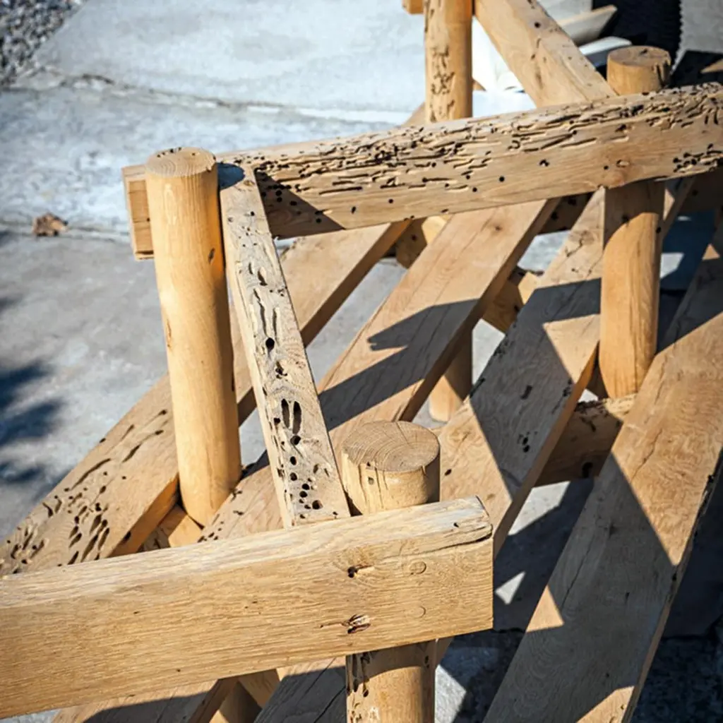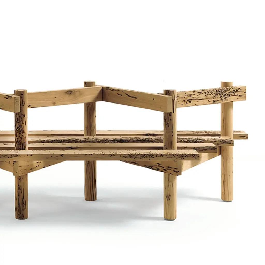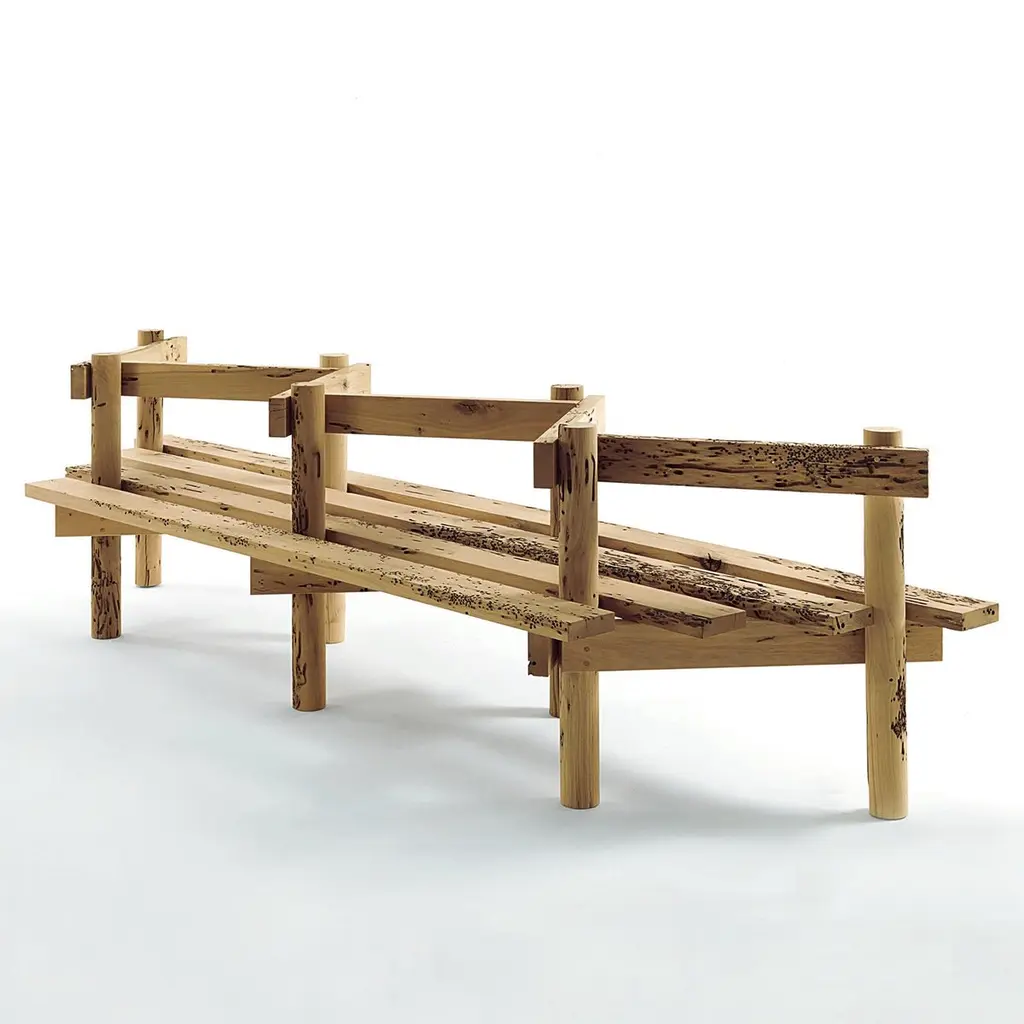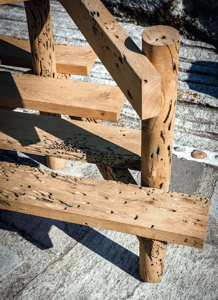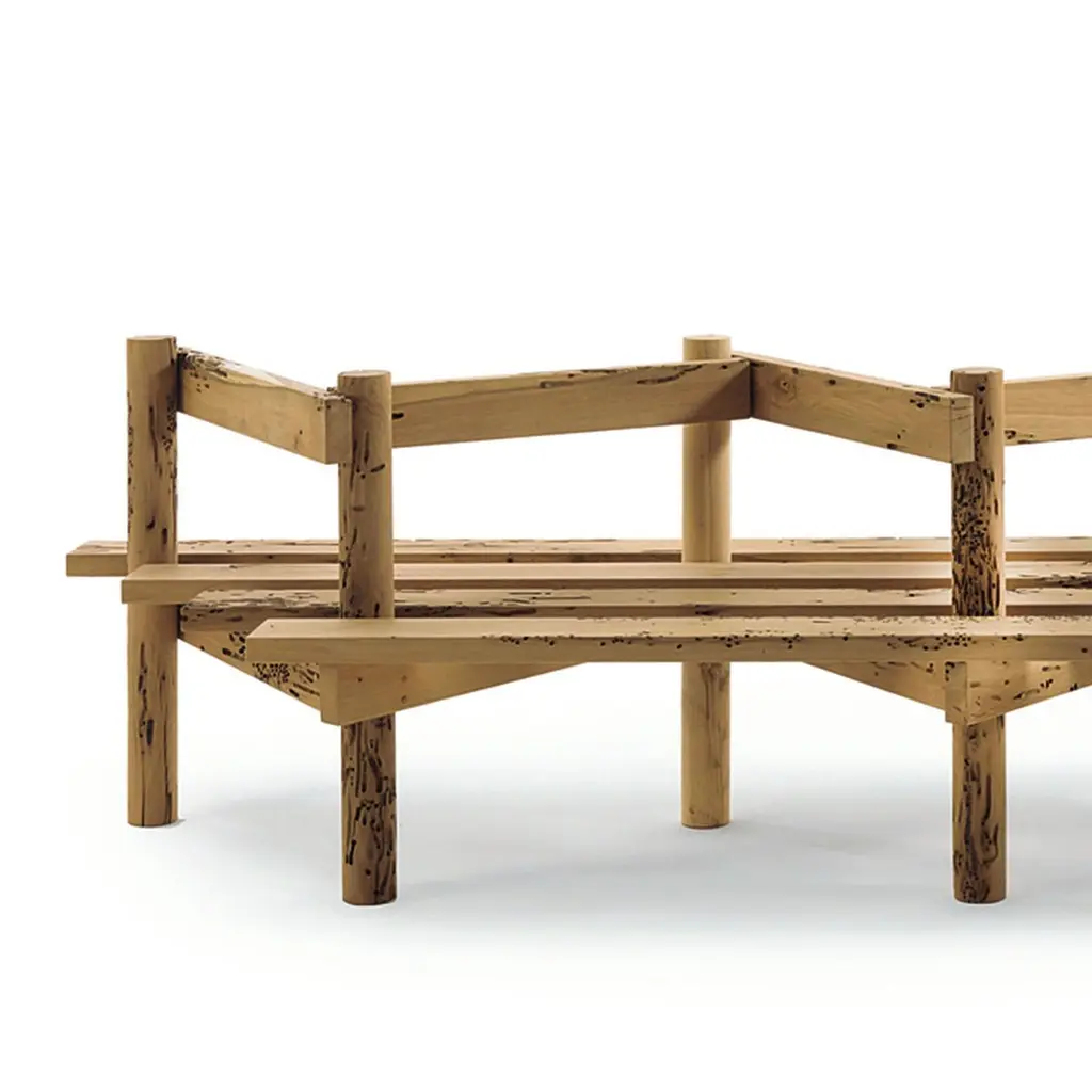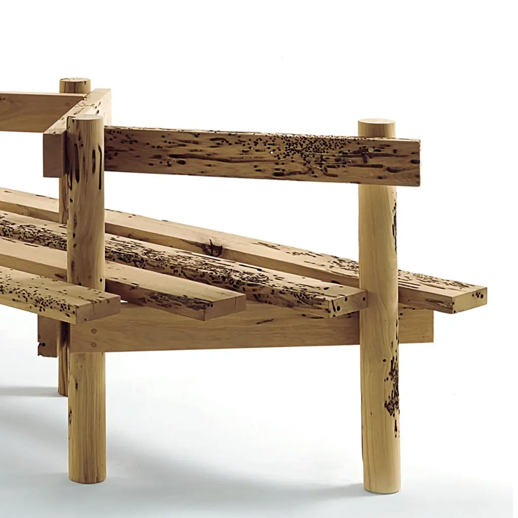 Bench recto verso with all structure, backrestsAnd seats made in solid oak from Venice wood pillars/poles. Oak treated with natural pine extracts Wax. Each piece is a bit different due to the uniqueSolid oak parts selected to produce the bench.Exceptional piece.