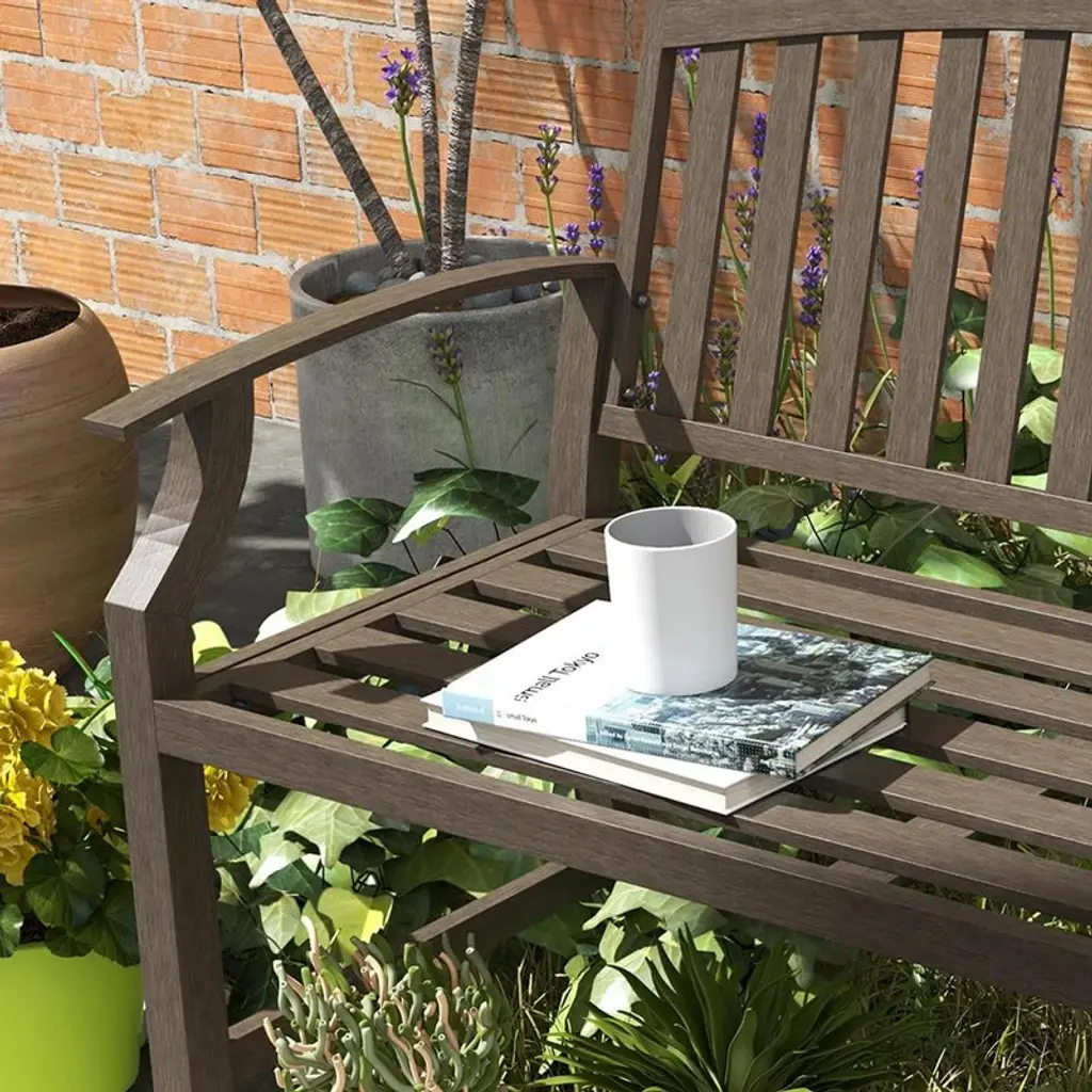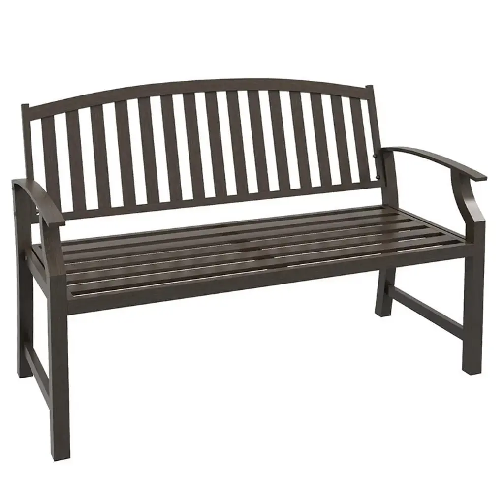 Sit back, relax, and enjoy the breeze with a friend and Outsunny. With a wide seat, this outdoor bench is like a loveseat for your lawn. A metal bench using classic motifs, it brings the feel of the park to your patio. Offering familiar comforts, this bench has a high back and armrests on each side. A slatted build not only helps accent your outdoor space but it keeps you cool by letting in wind flow. Get out and get comfy with an Outsunny outdoor bench. Features: - This metal bench is outdoor ready with water safe powder coated steel - Seat for 2 - Protective foot pads prevent sliding and surfaces from being scratched - Slatted design to keep you cool - Great for the patio, pool, or garden - Assembly required Specification: - Color: Brown - Material: Steel - Bench Dimensions: 50" W x 23.5" D x 33" H - Seat Size: 46" W x 19" D - Seat Height: 16.5" H - Weight Capacity: 528 lbs. - Item Label: 84G-247V00BN Package Includes: - 1 x Garden Chair - 1 x Manual Resenkos Garden Bench, Patio Bench,46" Outdoor Garden Bench, Metal Bench, Wood Look Slatted Frame Furniture, Brown