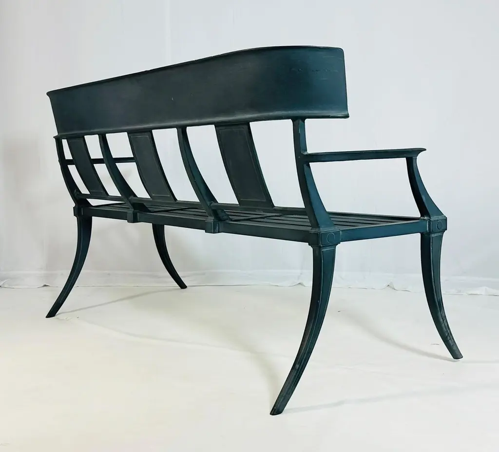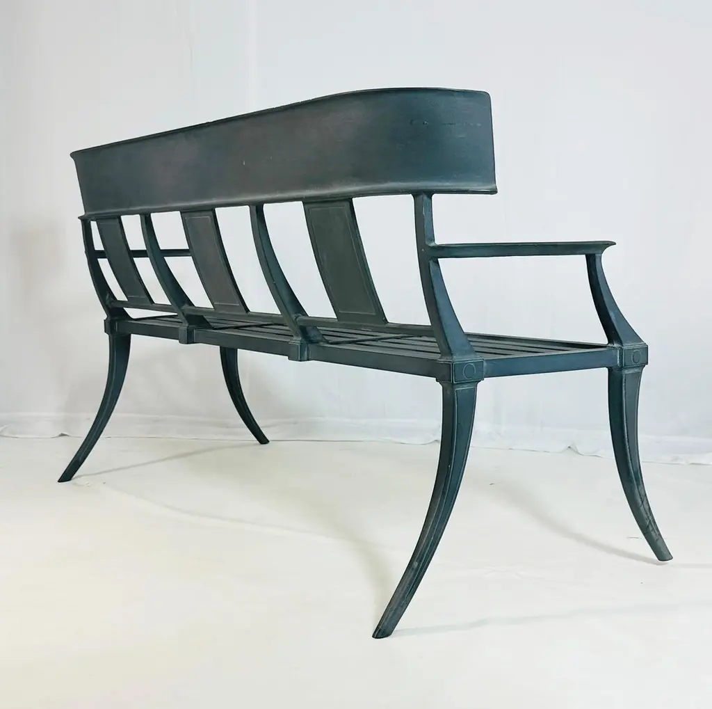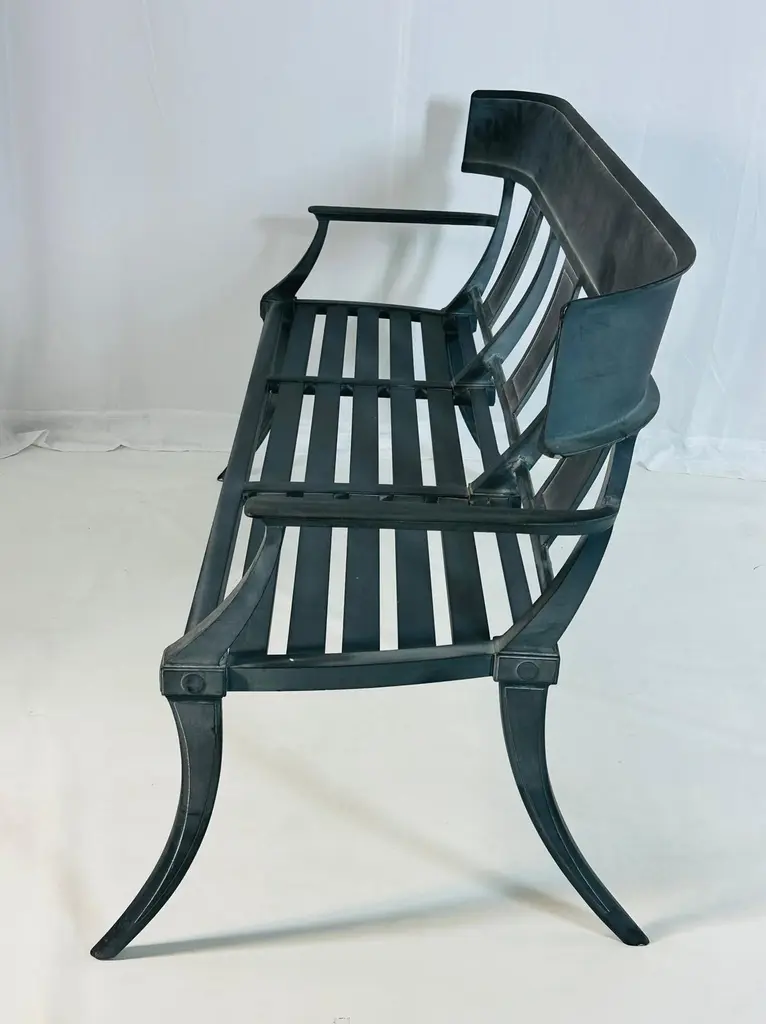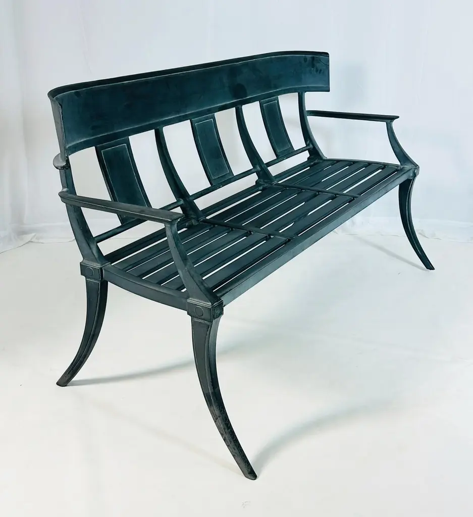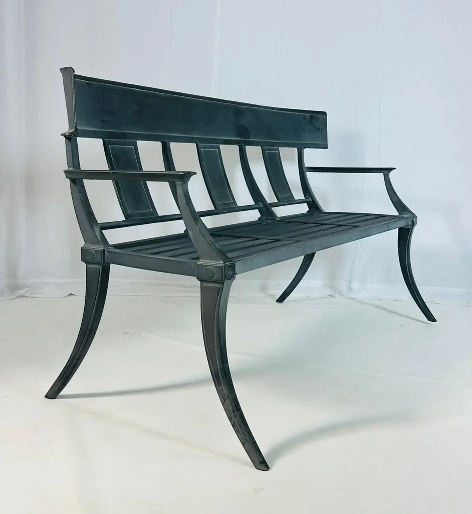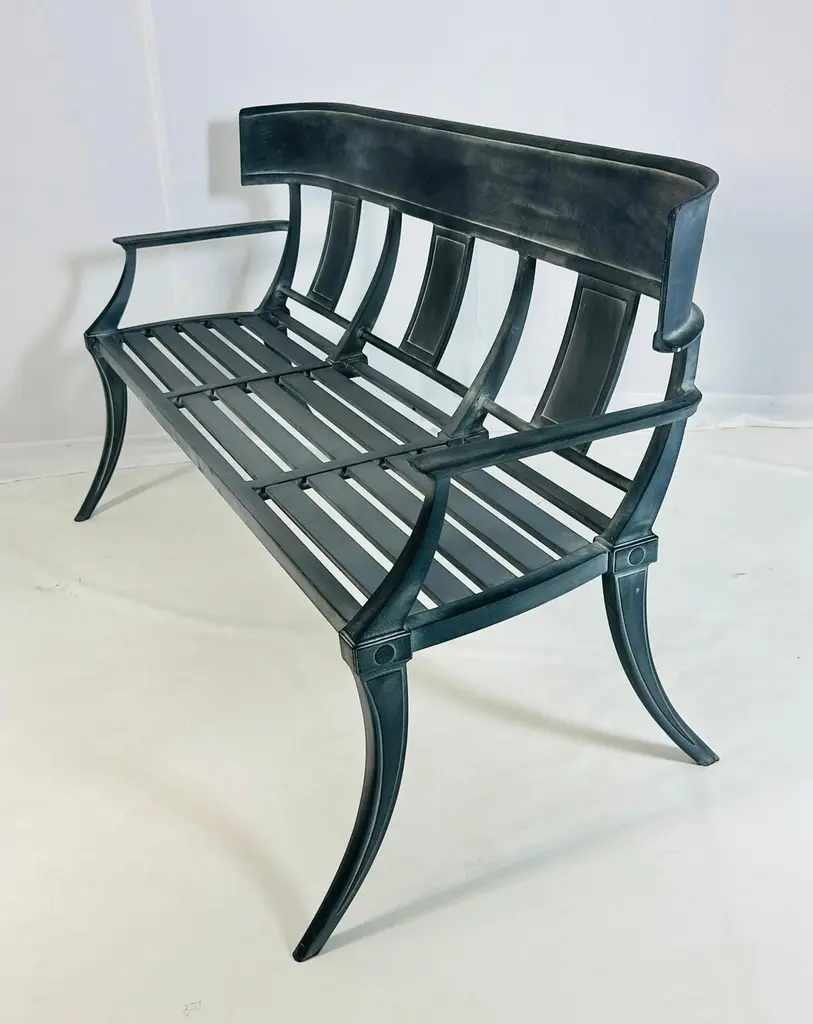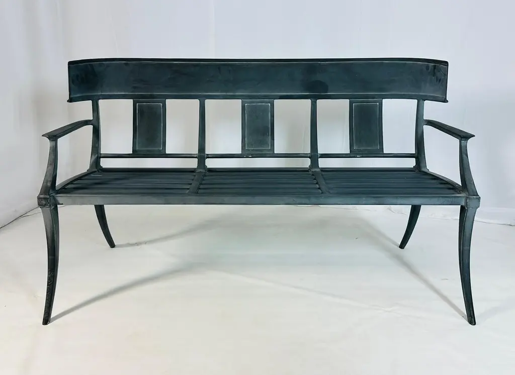 We have 2 benches available.Cast aluminum 3 seater bench designed and manufactured by Restoration Hardware.The bench has a beautiful klismos shape resembling the ancient Greek designs.Measurements:60 inches wide x 28 inches deep x 34.50 inches high x 17.25 inches seat height.