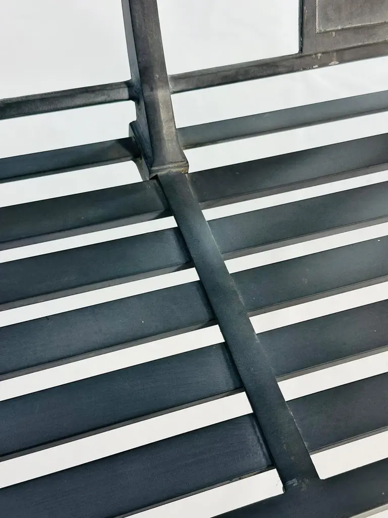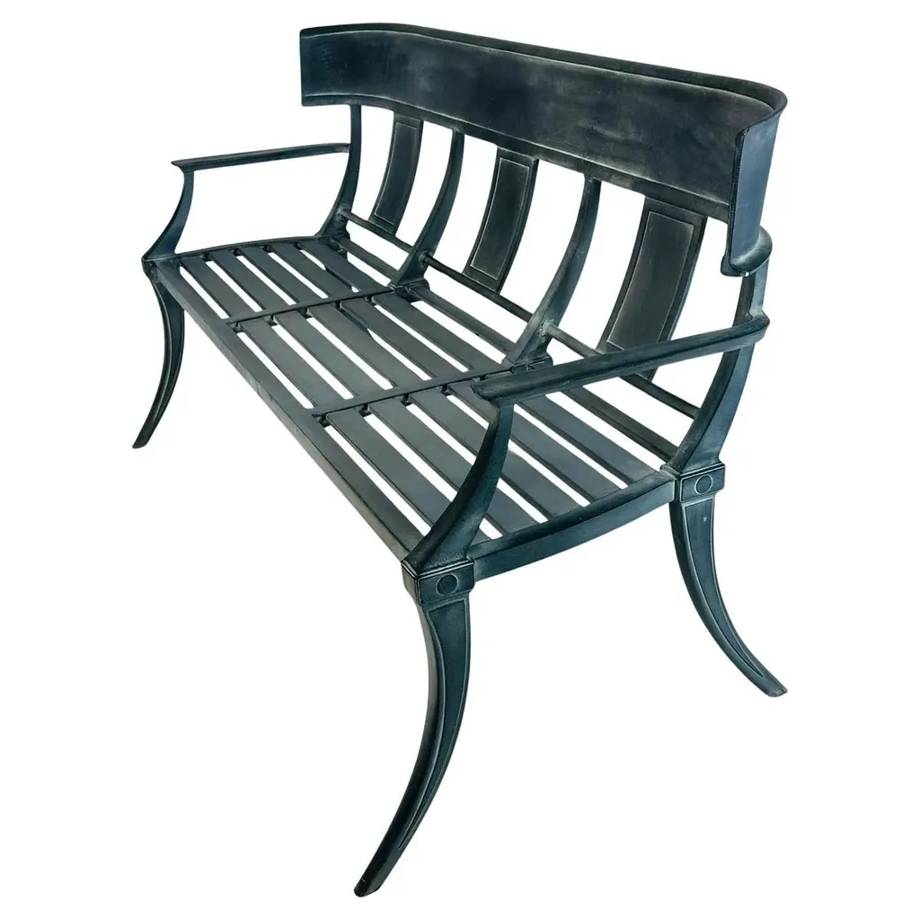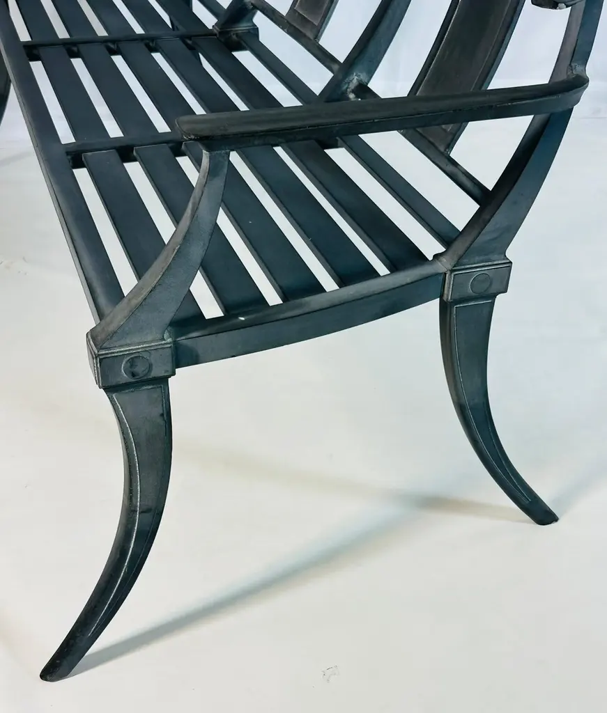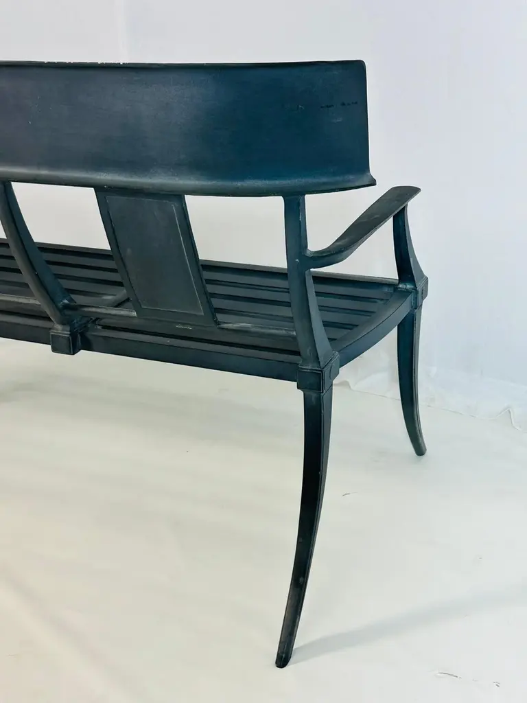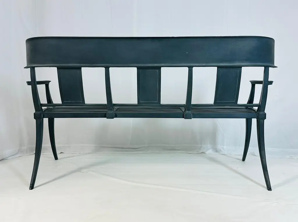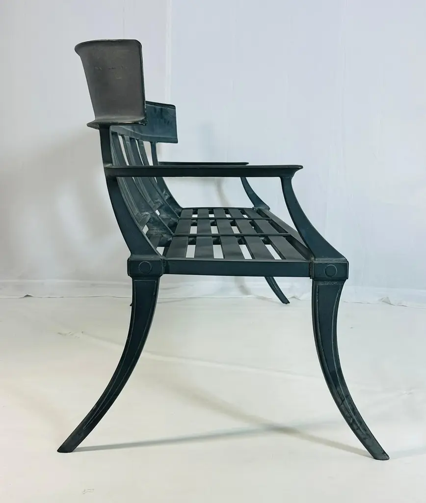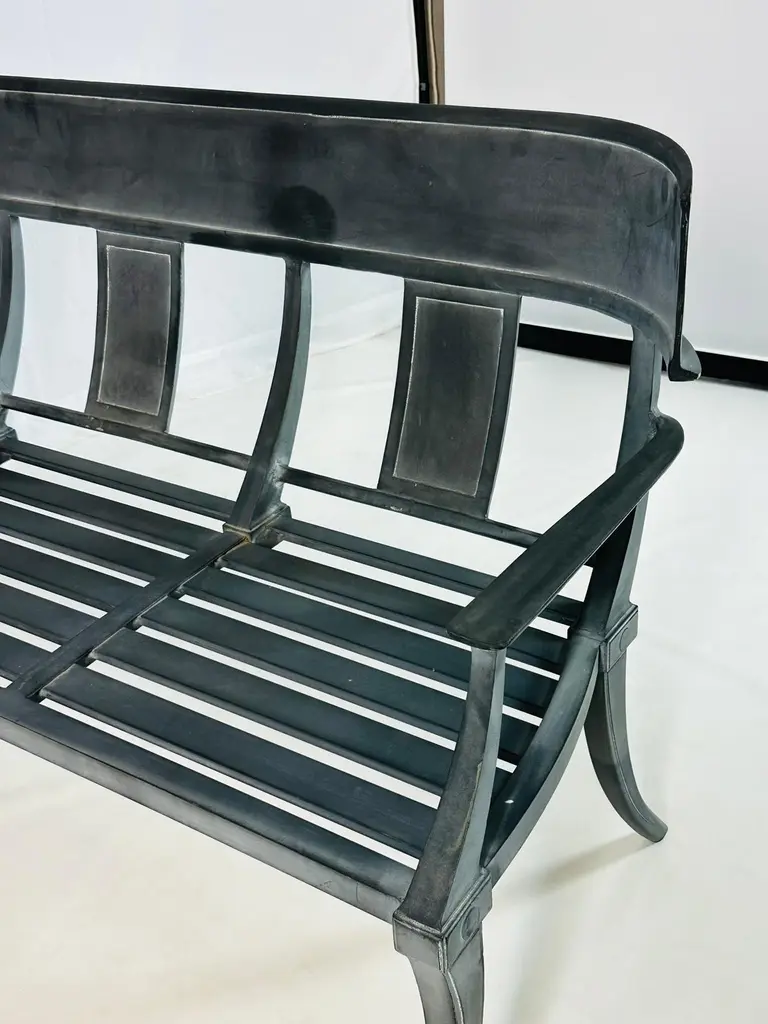 We have 2 benches available.Cast aluminum 3 seater bench designed and manufactured by Restoration Hardware.The bench has a beautiful klismos shape resembling the ancient Greek designs.Measurements:60 inches wide x 28 inches deep x 34.50 inches high x 17.25 inches seat height.