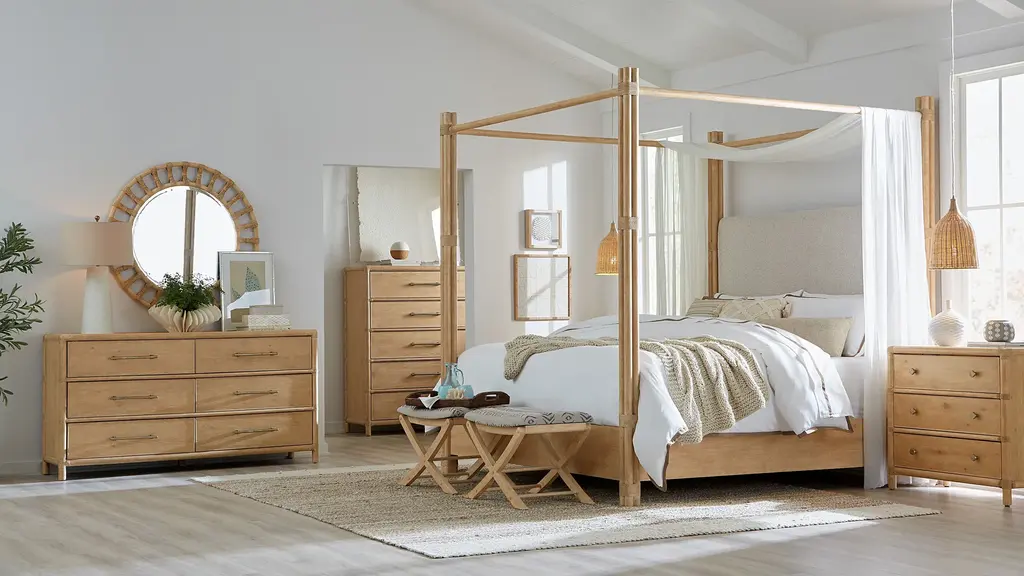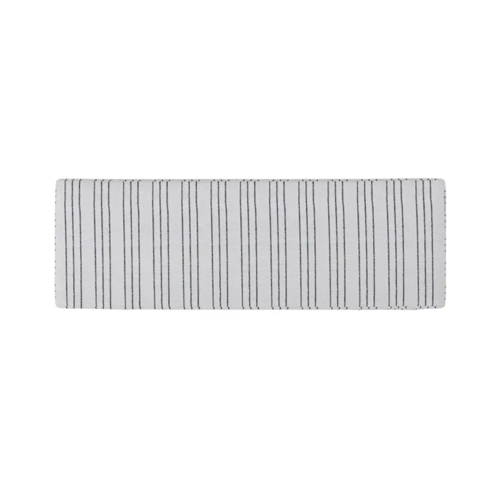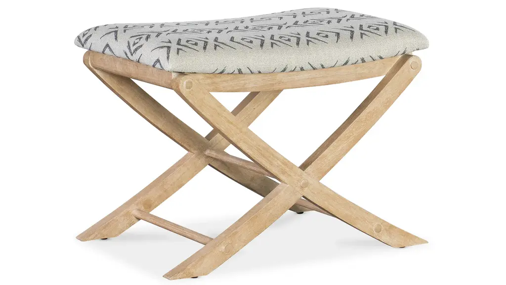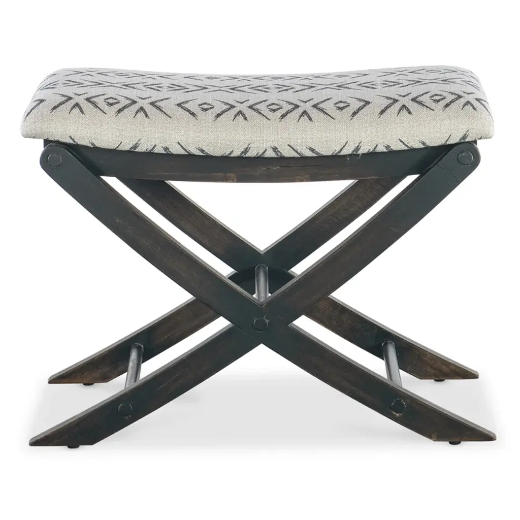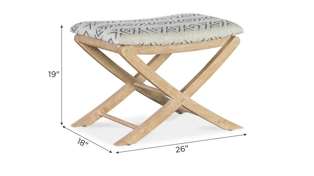 Retreat Camp Stool Bed Bench featuring a seat upholstered in the patterned Jafar Grey, it has an X-base design. The base and stretcher are crafted of wood finished in the sand-colored Dune, transparent by design to showcase the unique grain patterns of the wood veneer.
