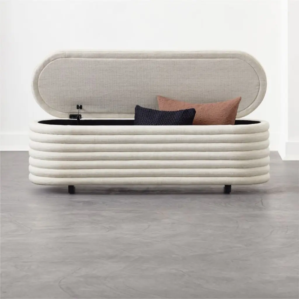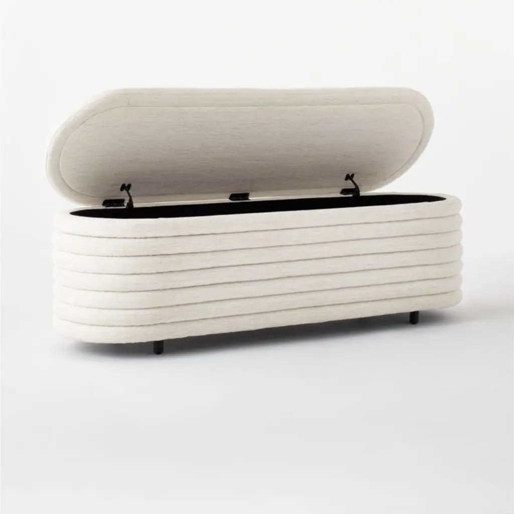 The Italian father-daughter duo behind Balutto Associati brings a relaxed feeling to this channel-tufted storage bench with its curves and soft lines. Concealed storage stashes clutter without ruining the look, perfect for the foot of the bed. We also love it in the entry or living room. CB2 exclusive.