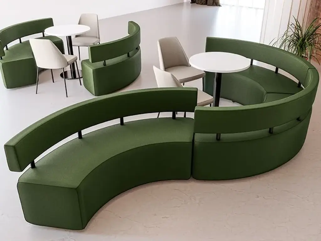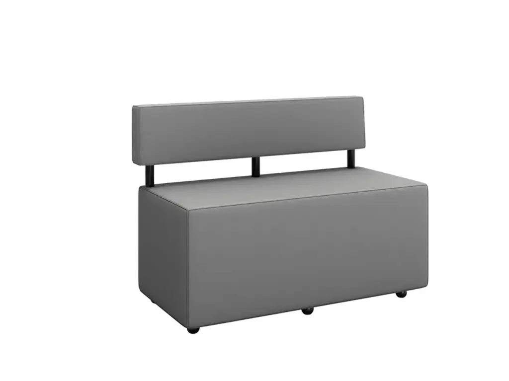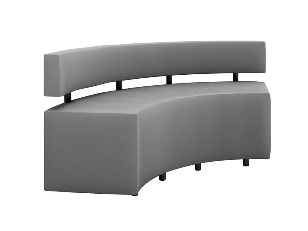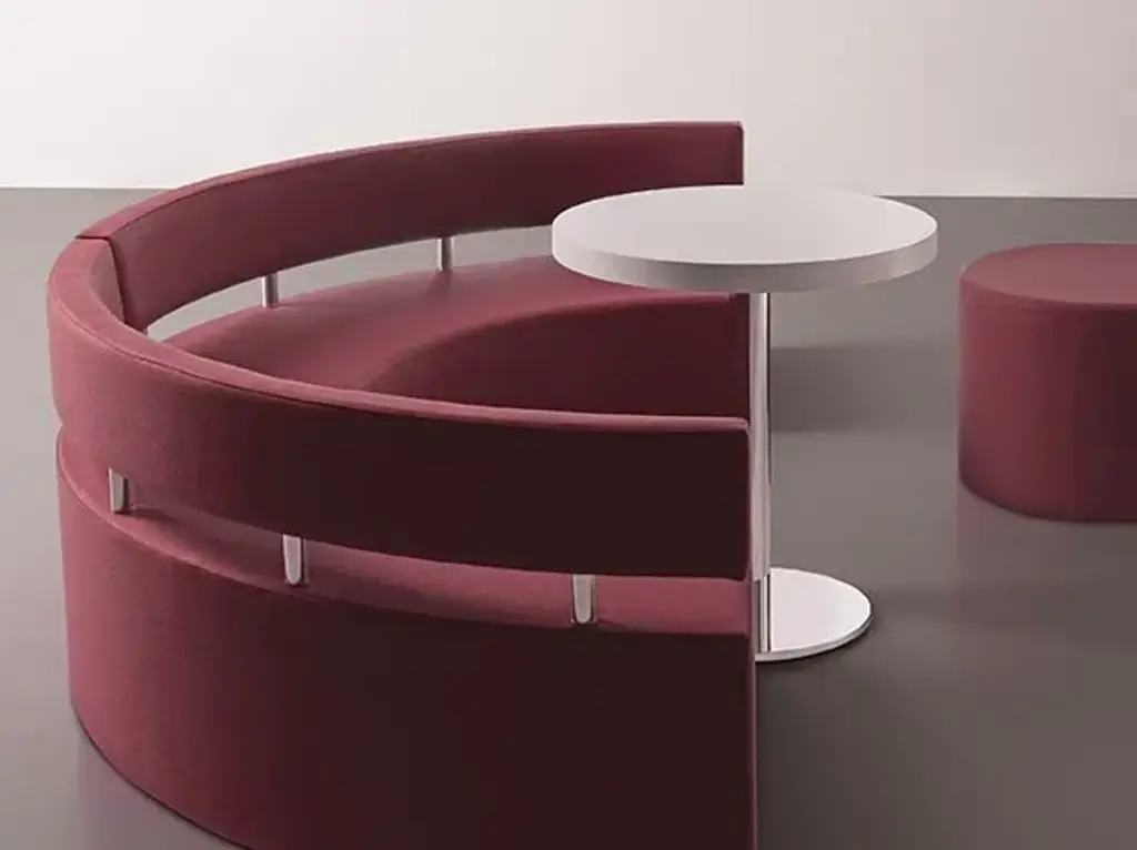 RINGO STAR - Imitation leather benchFrame made of wood particle board and multiply. Upholstery with non-deformable foam with different densities. Covering with fabric, eco-leather or c.o.m. Back supports and feet made of shiny iron. The elements can be combined together with a hidden joint. Back support and feet in chromed metal.Round geometries that evoke playful complicity. Ringo Star is a collection of mini sofas, single or groupable in a variety of combinations. The design has a strong esthetic impact which, coupled with the versatility of colours, gives life to light and informal environments. Perfect for furnishing all types of communal spaces, from waiting room to waiting area.