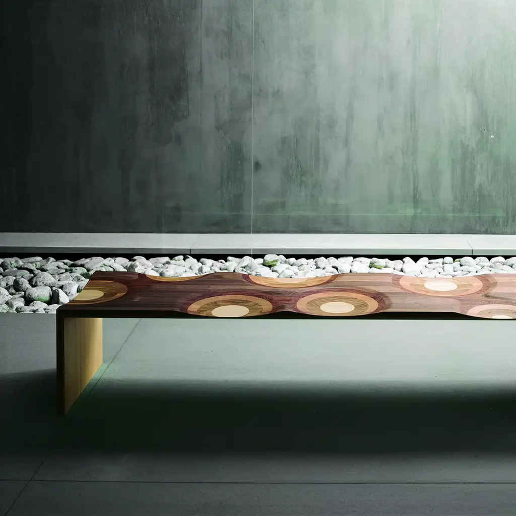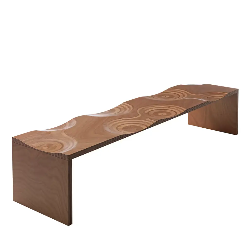 Ripples bench is the winner of the 2004 Golden Compass Award, boasting a unique, sculptural allure. Designed by Toyo Ito, this piece is skillfully crafted of five different types of wood (walnut, mahogany, cherry, oak, and ash), and features a seat reinforced with a hidden metal bar that firmly sustains it. Welcoming and masterfully carved, the seat is hand-finished creating an elegant and soft poly-chromatic effect. A veritable international icon of interior design, this piece is suitable for both residential and commercial interiors.