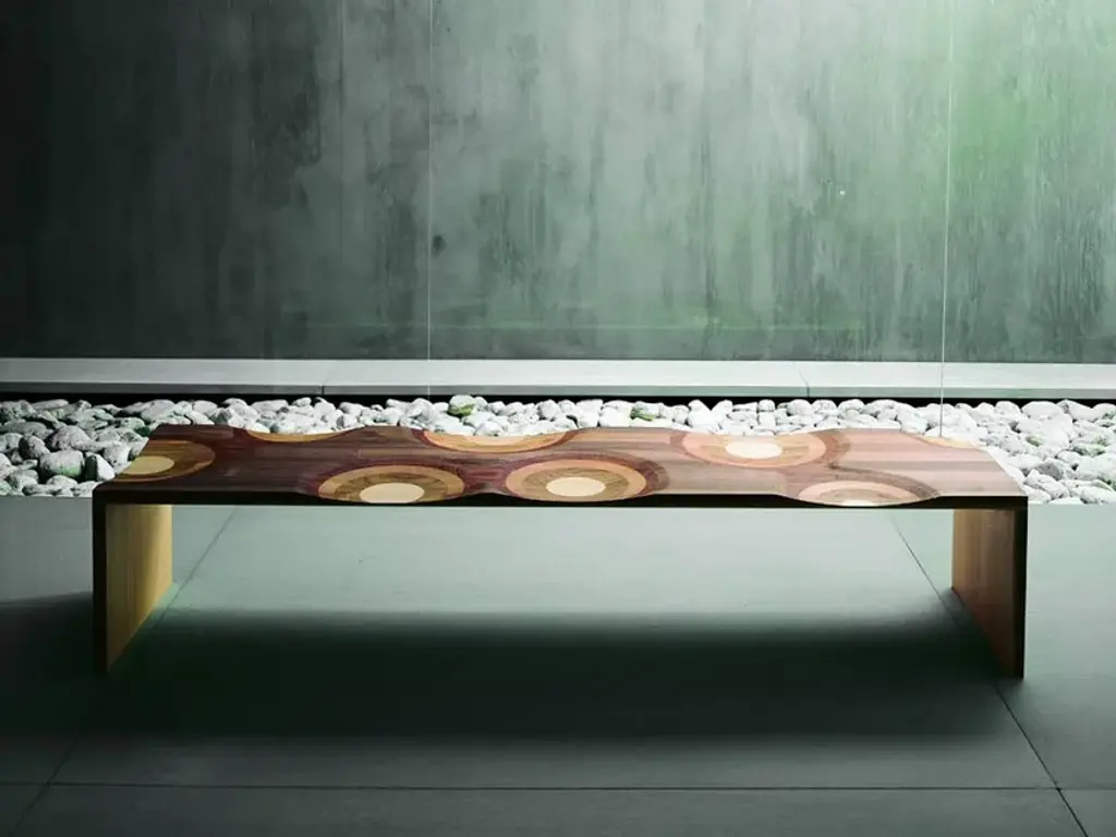 Ripples, winner of the 2004 Compasso d’Oro, is made of a laminated composite of five different solid woods. Slide your hand along the surface to enjoy the seamless transitions between walnut, mahogany, cherry, oak, and ash. This enveloping seat, carved with mastery, is hand-finished to produce an elegant polychromatic effect arising from the ductility of the wood. A true icon of international design, Ripples is a bench suitable for home users, commercial environments, and public spaces.Seat made from plywood using five different types of wood (walnut, mahogany, cherry, oak and ash). Inner metal reinforcement. Plywood legs with edging and walnut veneer (on the outside) and birch veneer (on the inside). Lower panel made from birch plywood, hot-press curved and with beech veneer. Vegetable oil finish. Adjustable feet.FINISHWalnut, mahogany, cherry, oak, ashDIMENSIONS (LxDxH)cm 200x50x40 - 78.8” x 19.7” x 15.7”
