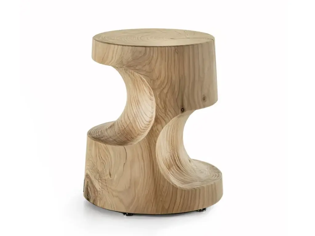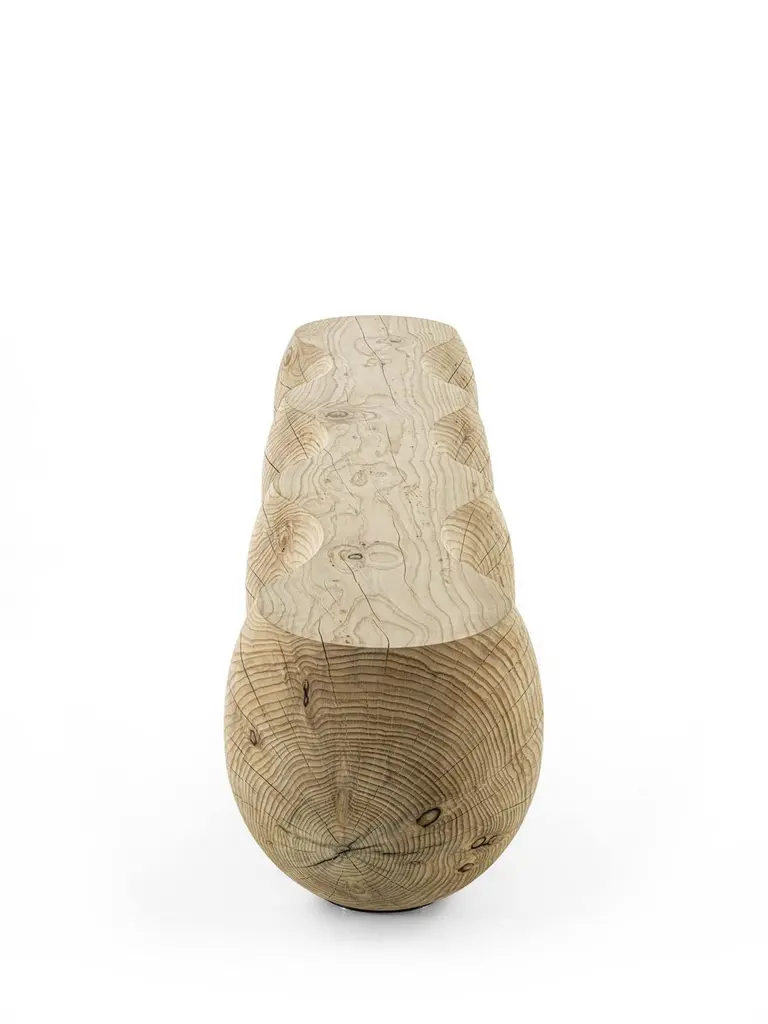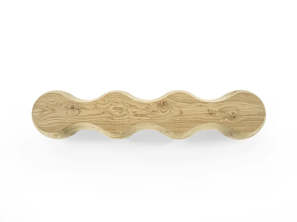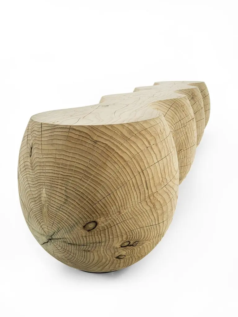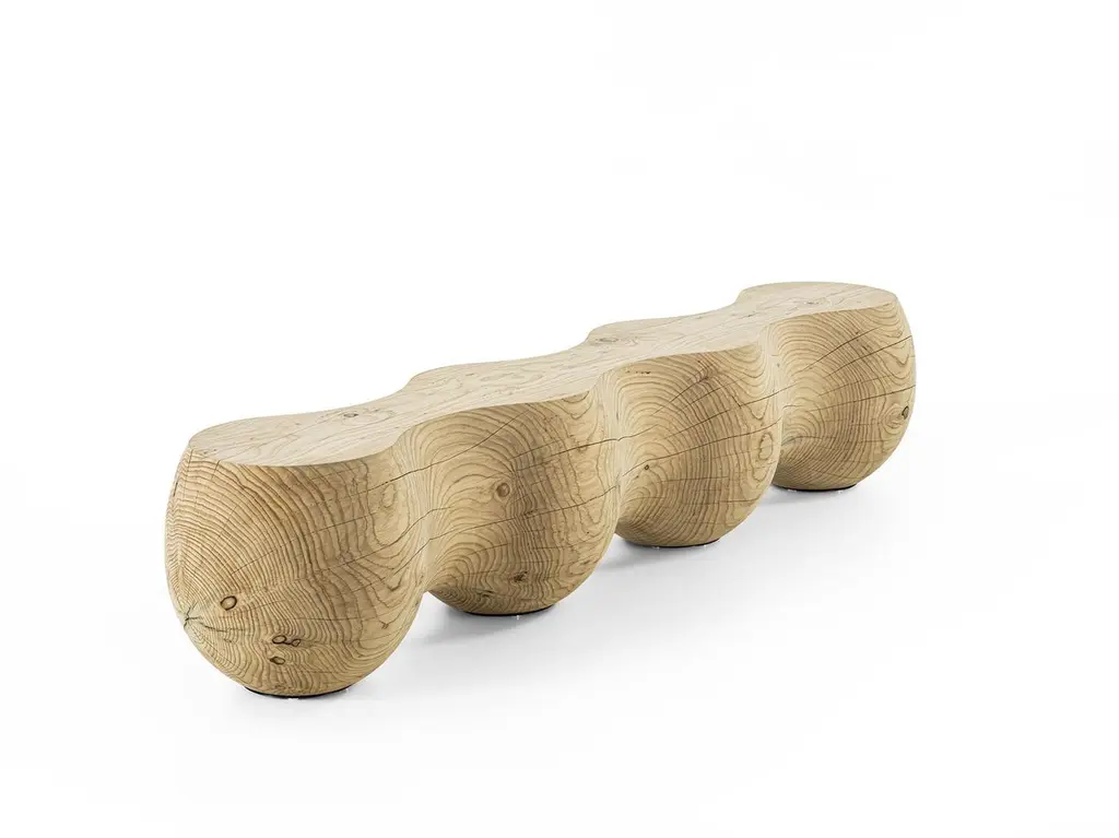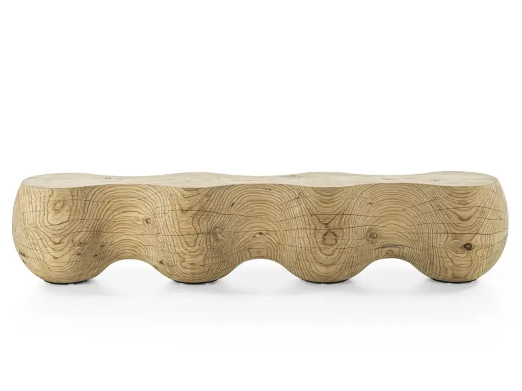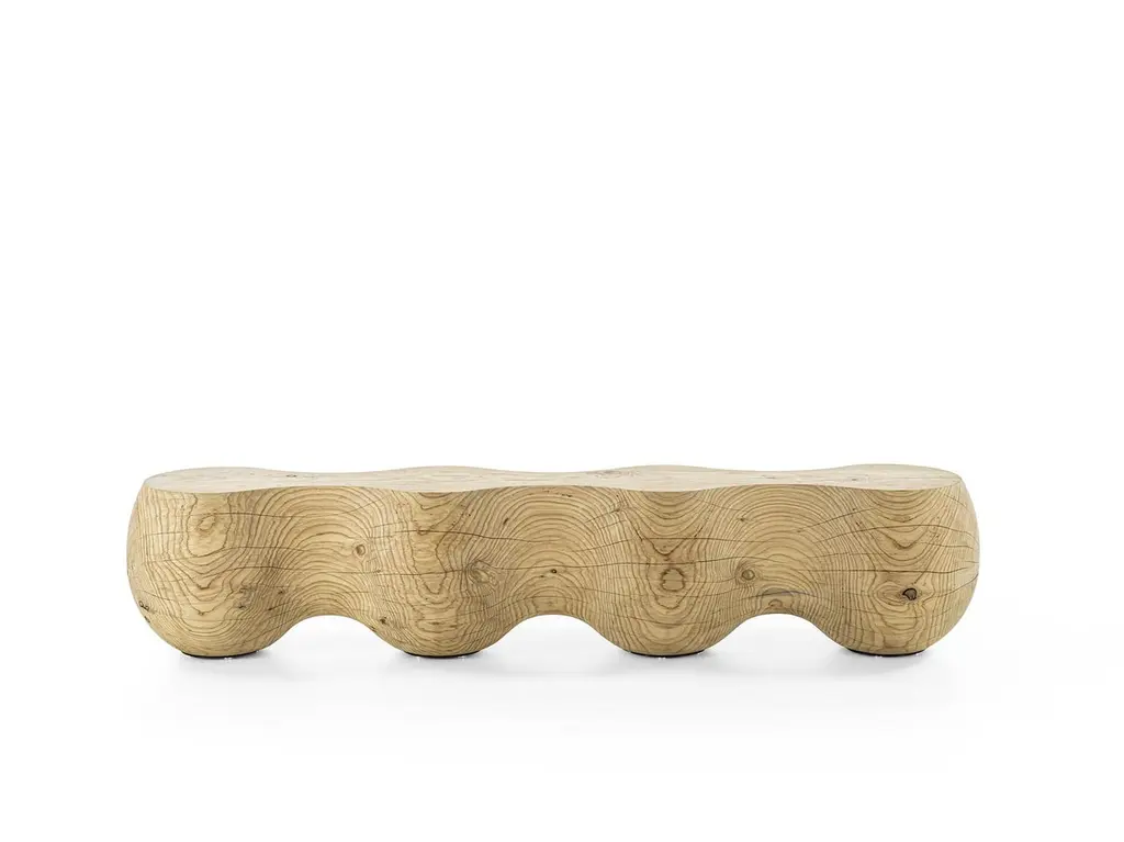 Riva 1920 BRUCO BenchDesign: LCB.2MThe BRUCO Bench is a sculptural seat carved from a single block of solid Lebanese cedar. Its distinctive design is defined by the harmonious fusion of four rounded spheres, evoking the organic silhouette of a caterpillar.The craftsmanship highlights an alternation of full and empty volumes, creating a dynamic rhythm that enhances the visual lightness of the piece while preserving the inherent solidity and strength of the cedar wood. The result is a bench that combines playfulness with structural integrity, transforming natural material into a striking design statement.Each bench is unique, shaped by the fragrance, grain, and organic variations of cedar wood, ensuring a one-of-a-kind piece that blurs the line between functional seating and sculptural presence.Dimensions•Length: 205 cm / 80.7 in•Depth: 43 cm / 16.9 in•Height: 43.5 cm / 17.1 inMaterial•Solid Lebanese cedar woodConceptThe BRUCO Bench celebrates the poetry of organic forms. By translating the softness of nature into the permanence of solid wood, it offers a unique balance of playful design, visual lightness, and artisanal mastery-a true statement piece for contemporary interiors.