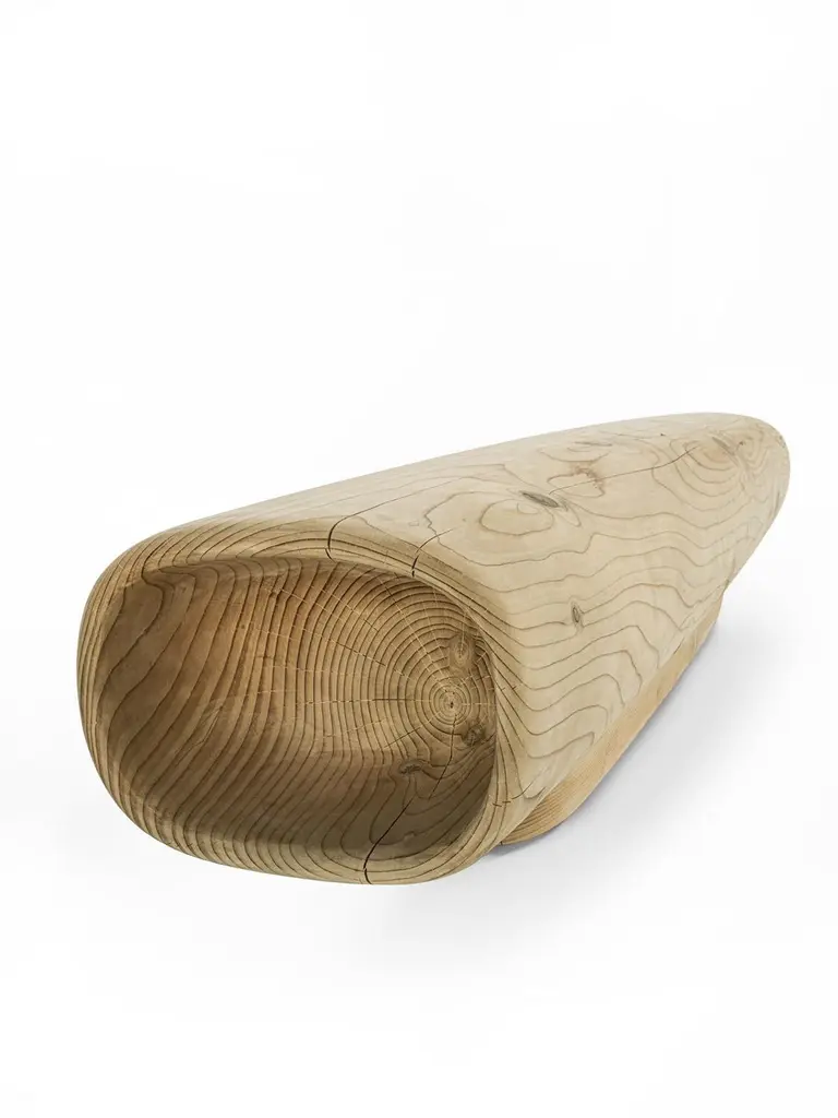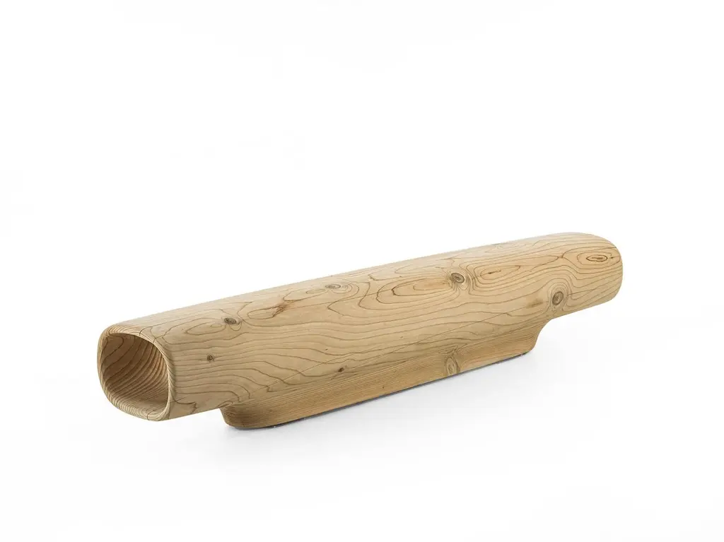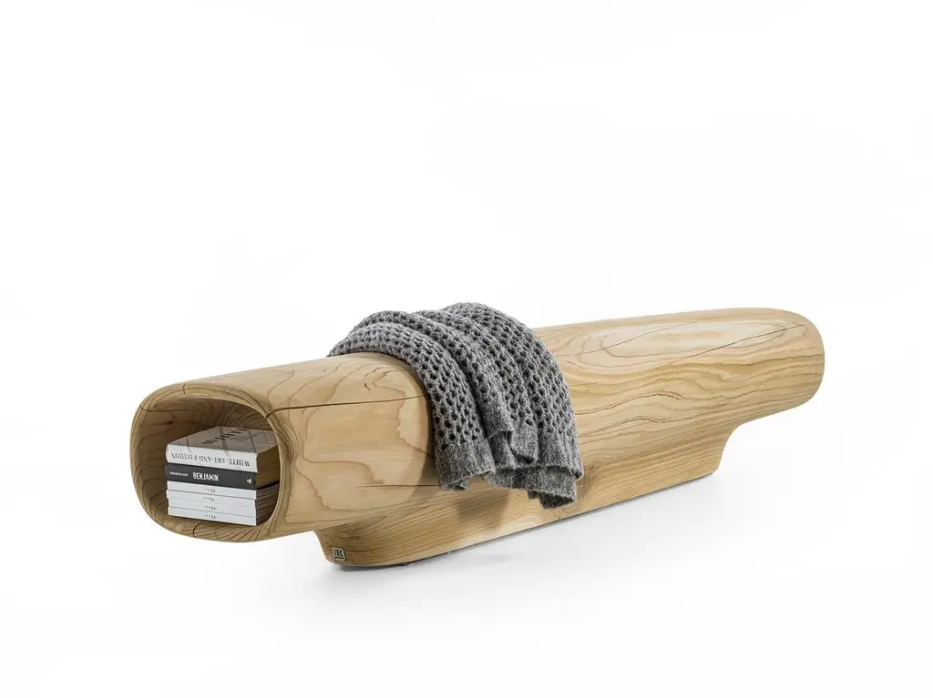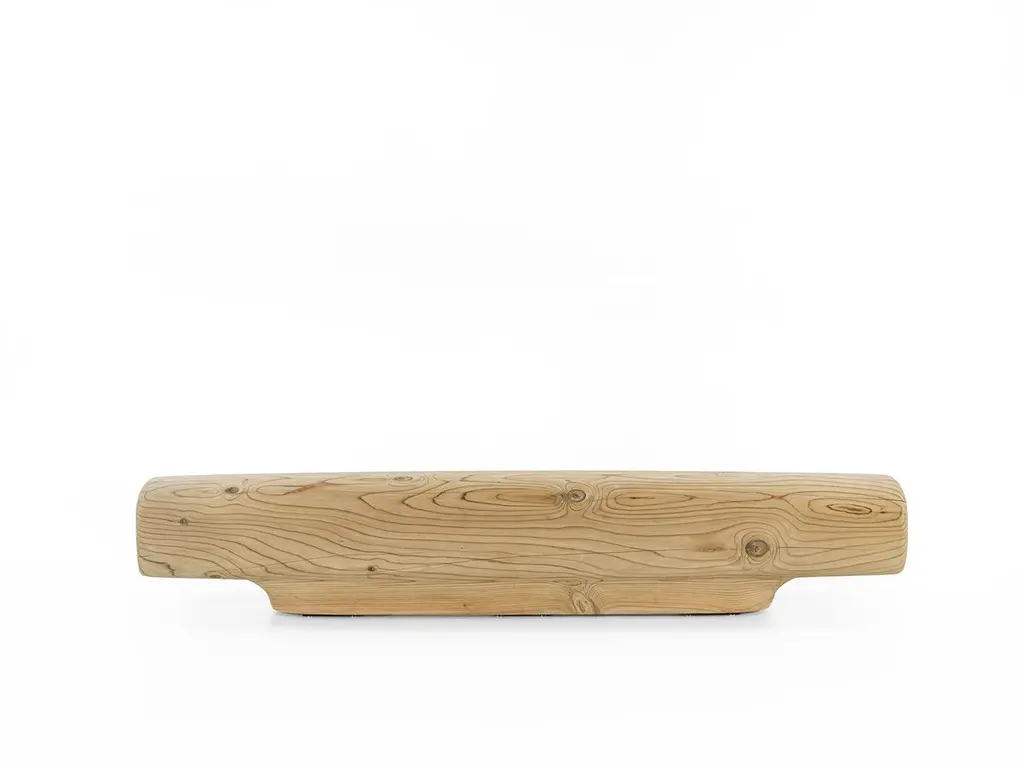Riva 1920 TRAVETTO BenchDesign: Studio Substance The TRAVETTO Bench is crafted from a single block of scented solid cedar, combining structural strength with refined simplicity. Its elongated, linear form evokes the image of a balance beam, creating a strong architectural presence while maintaining a sense of elegance.Two large storage niches are carved into the ends of the bench, designed to hold books, magazines, or textiles, keeping the seating surface clear and functional. This thoughtful integration transforms the bench into a versatile piece that blends seating with practical storage.The base, shaped seamlessly from the same block of cedar, features a subtle tapering that raises the bench slightly off the ground. This detail leaves the ends cantilevered, enhancing the visual lightness of the piece while ensuring stability and durability.Each TRAVETTO Bench is unique, marked by the fragrance, natural grain, and organic variations of cedar wood-an expression of timeless craftsmanship and essential design.DimensionsLength: 238 cm / 93.7 inDepth: 41-45 cm / 16.1-17.7 inHeight: 43 cm / 16.9 inMaterialSolid scented cedar woodConceptThe TRAVETTO Bench is more than seating: it is a functional sculpture. By combining a linear, architectural form with integrated storage, it emphasizes both utility and artistry, making it ideal for interiors that seek a balance of practical elegance and sculptural presence.