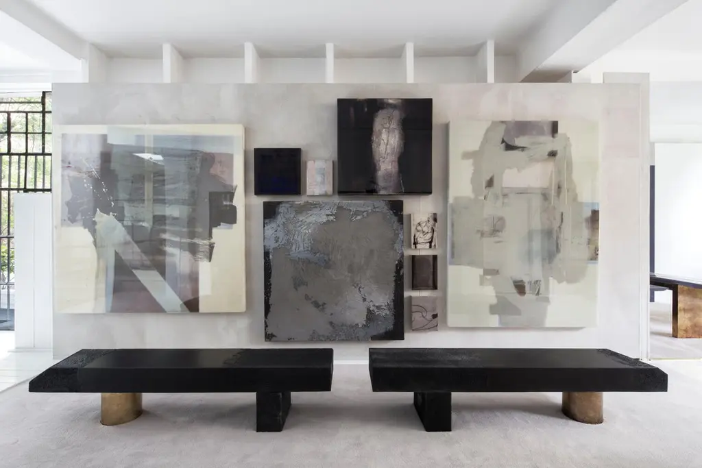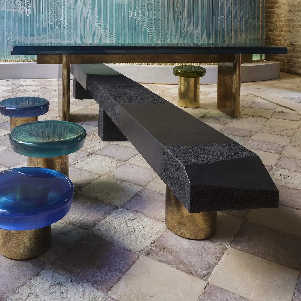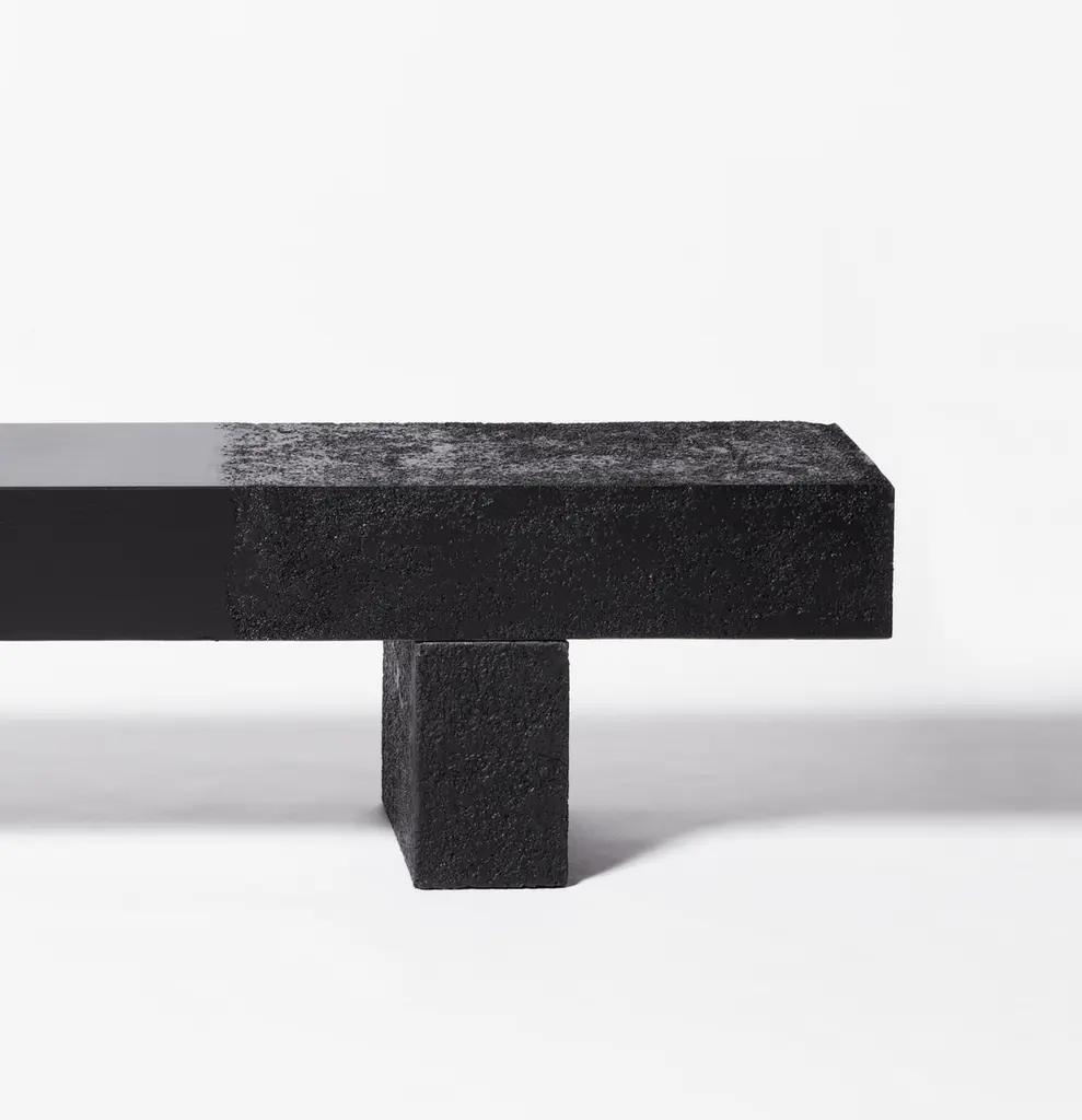 Textured and sturdy, Rive is a massive bench that expresses the aesthetic of megalithic architecture through the assembly of three essential structural components. The seat, with its irregular edges, rests on a concrete cuboid leg and a rigorously carved brass cylinder. The etched metal finish adds sparkle and a touch of sophistication to the black concrete, whose surface alternates corroded portions with perfectly smoothones. SIZE: W 185 - D 40 - H 45 cm