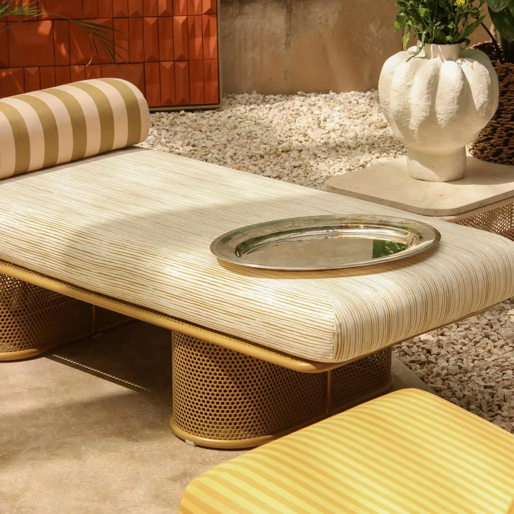 Riviera Bench 180cm In Lacquered Gold Metal & Stripes Fabric For Outdoors